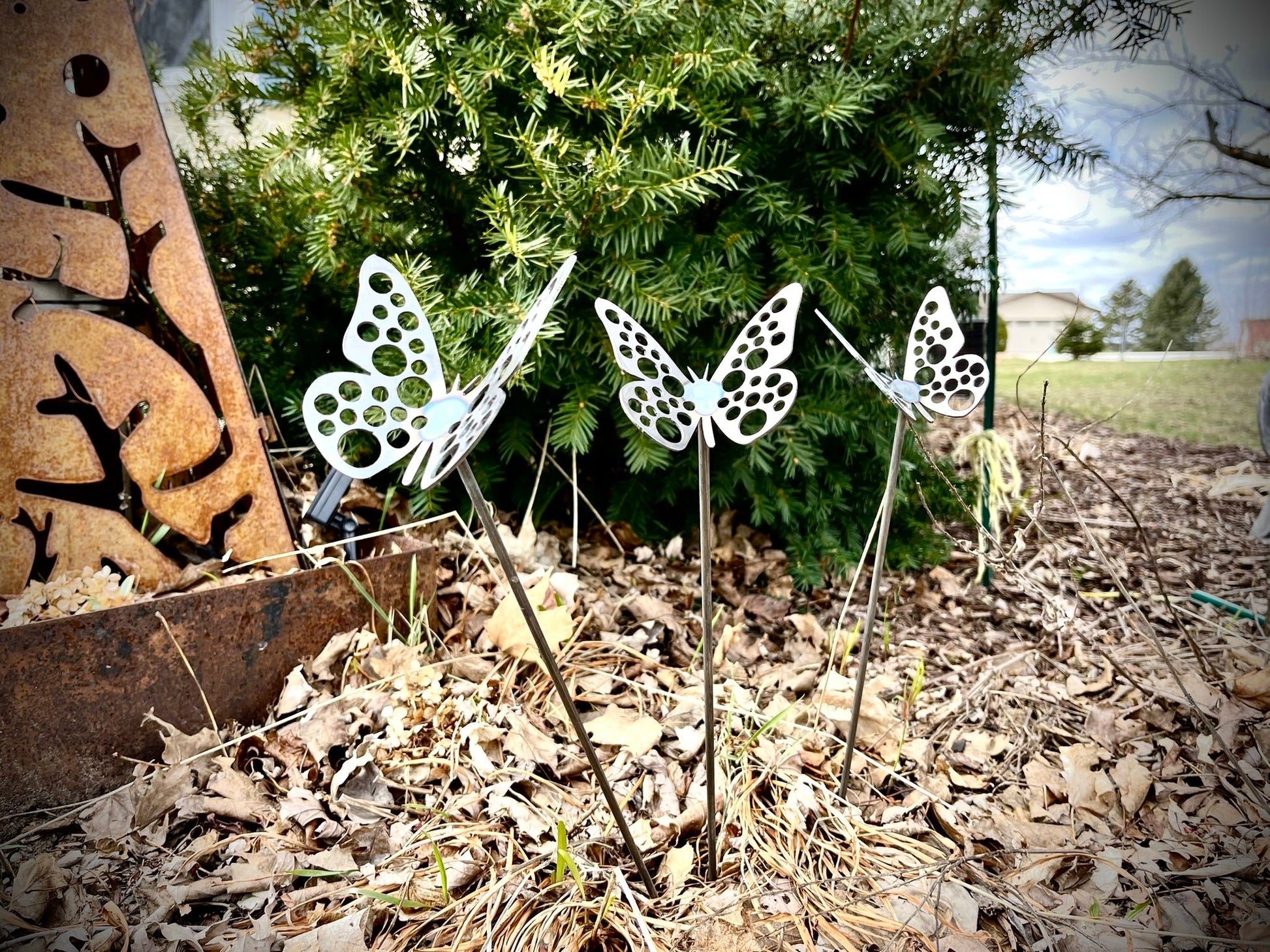 These metal butterflies are made from 16ga steel and welded to an 18-inch rod. Stick them in the ground, or in a vase. The finish is raw steel so they can be painted or left alone for a rusty / patina finish. The wings can be easily bent and formed by hand to alter the look.