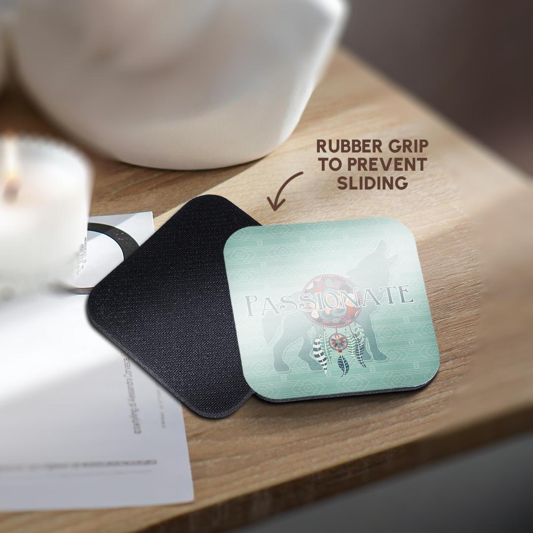 Wolf Native American Animal Spirit with Dream Catcher Passionate Coaster is a great complement to any home décor. Soft coasters are 3.5" x 3.5", are absorbent, and can be washed. Ceramic coasters are 4.25" x 4.25", non absorbent and come with felt corner pads. Available in sets of 4 and 8.