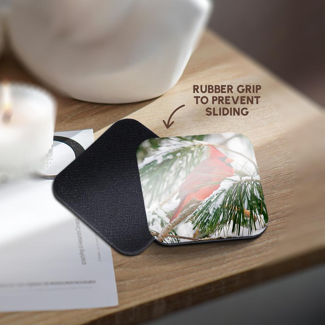 Red and black cardinal perched in snowy pine tree Coaster is a great complement to any home décor. Soft coasters are 3.5" x 3.5", are absorbent, and can be washed. Ceramic coasters are 4.25" x 4.25", non absorbent and come with felt corner pads. Available in sets of 4 and 8.