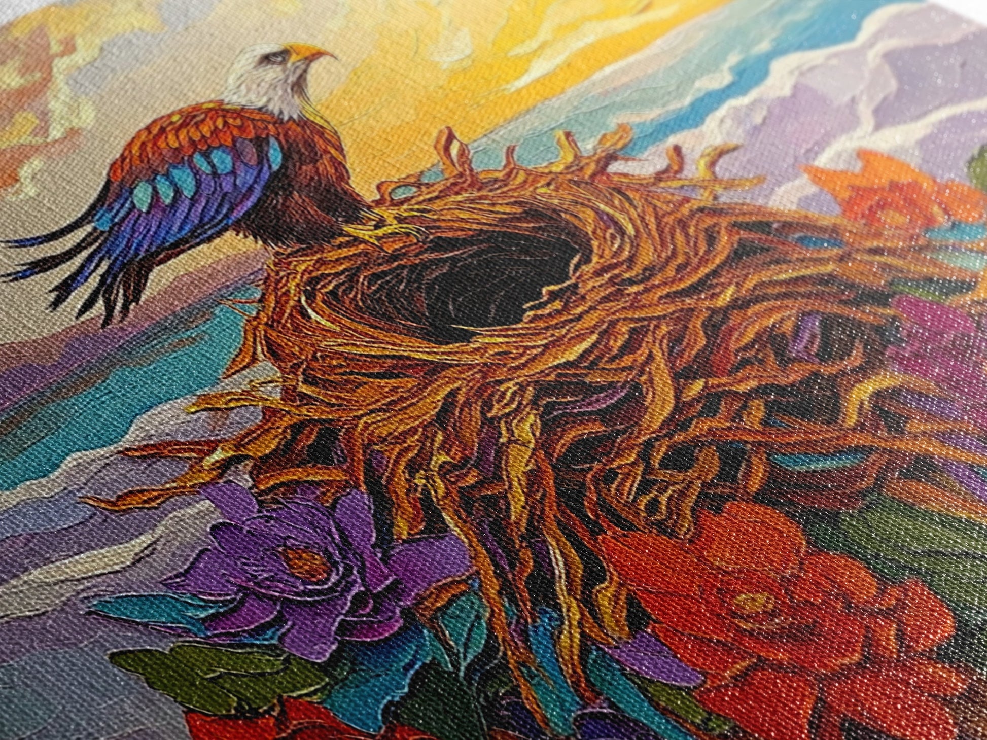 Bald Eagle Nest, bird art, mountain painting, moody art, southwest wall art, patriotic decor, nature art, Framed Canvas Print