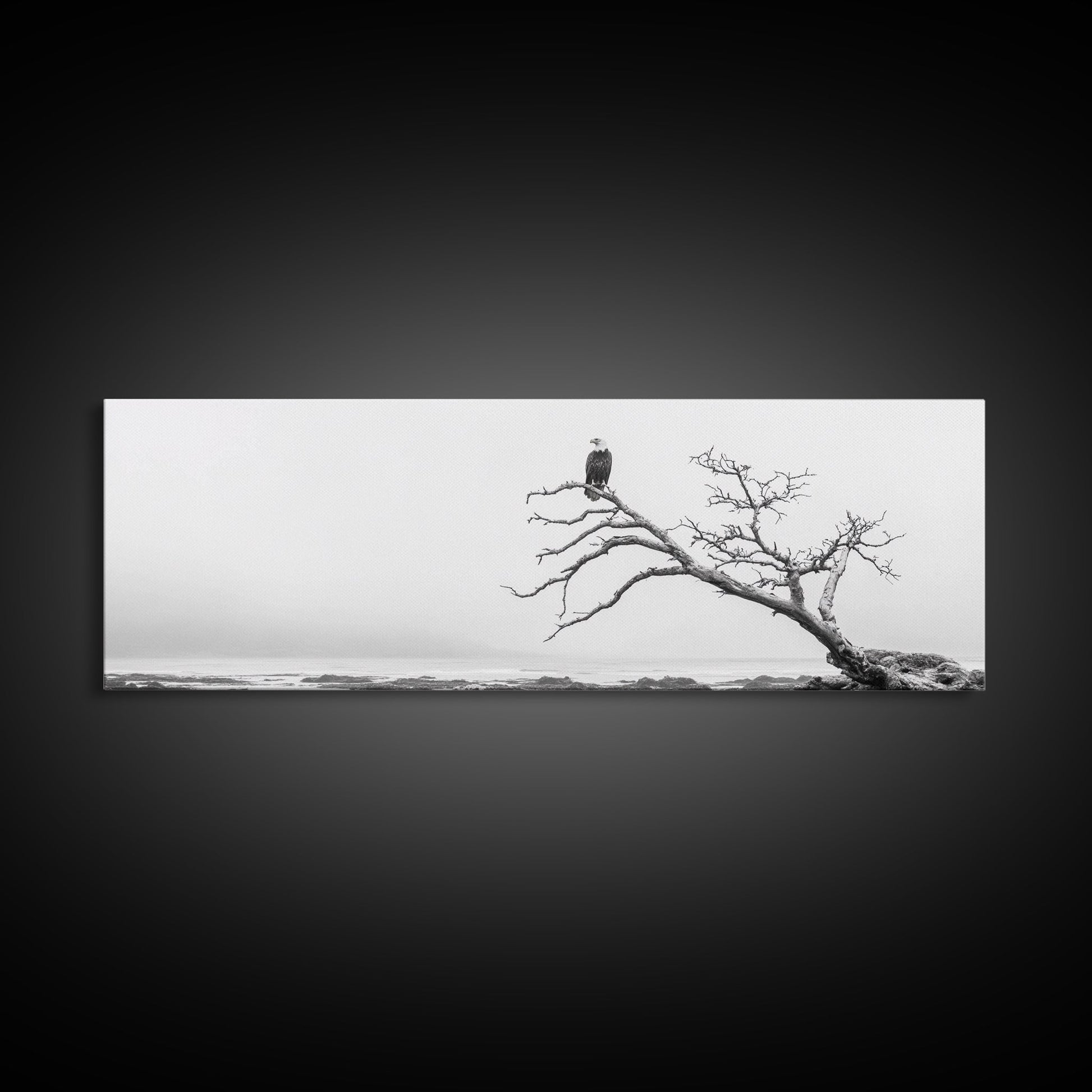 Bald Eagle, Tree Perch, Foggy Coast, Framed Canvas Print, Wildlife Photography, Cabin Wall Art, Rustic Minimalist Decor