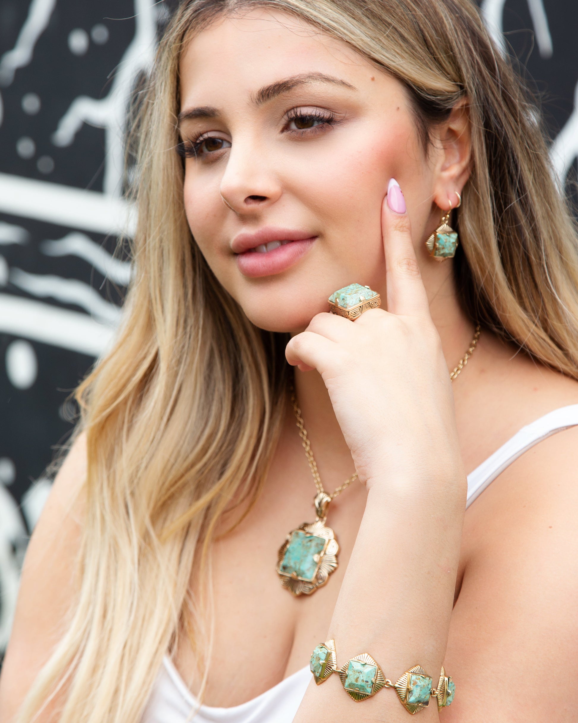 This necklace is skillfully handcrafted with a stunning blue turquoise square stone and intricate golden brass details. The 19.5" golden bronze chain is finished with a lobster clasp and the pendant measures 2.5" in length, with a width of 1.93" at its widest point. Feel the weight of quality at 47.19G.