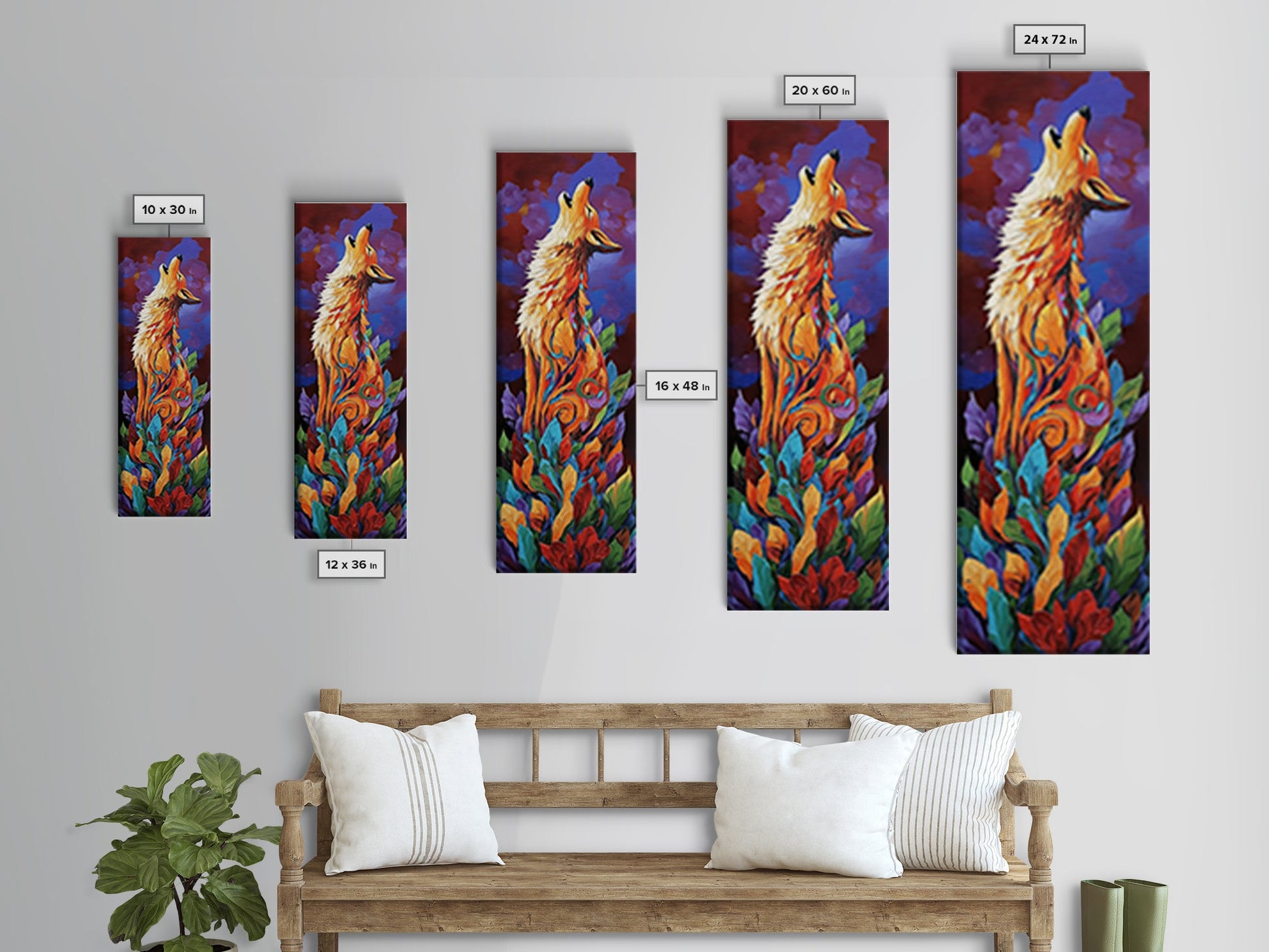 Colorful Howling Wolf Canvas Print rustic decor, long narrow wall art, wildlife painting, tall skinny art, moody art, animal wall art, whimsical art, southwest wall art, Joshua tree art