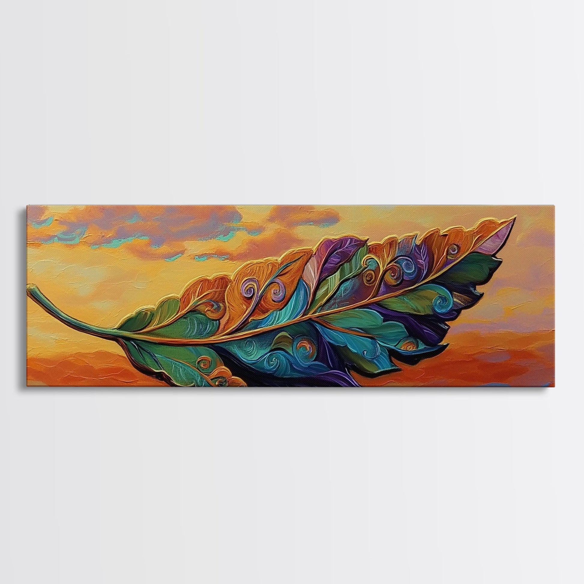 Colorful Leaf Art, Sunset Nature Decor, Vibrant Feather Design, Framed Canvas Print, Boho Wall Art, Entryway Accent Piece
