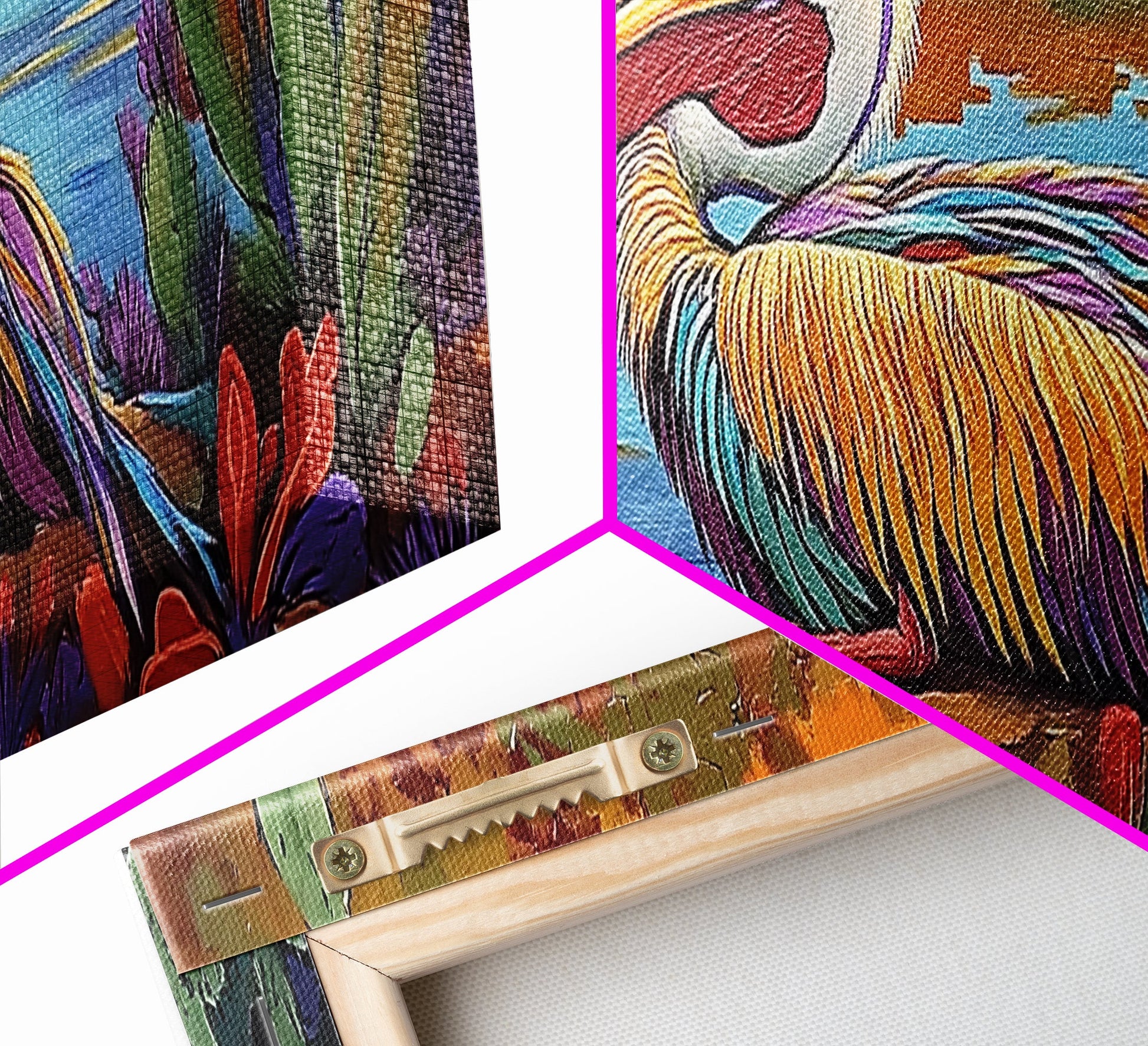 Colorful Pelican, Tropical Bird, Lake Wildlife, Autumn Palette, Framed Canvas Print, Boho Nature Wall Art, Dining Room Bird Artwork