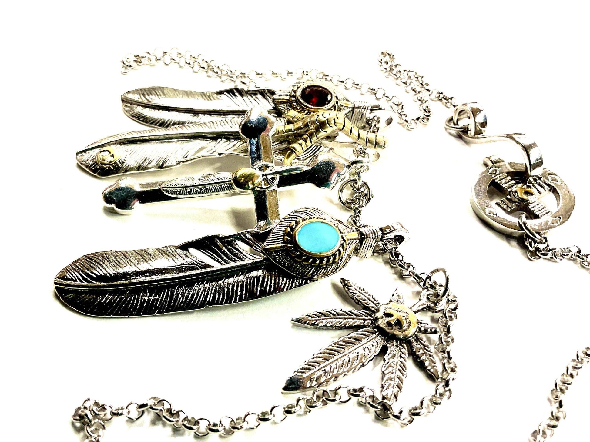 3 Dangle Feather Pendants and a fabulous Antique Cross. Silver casting with turquoise and red colored glass cabs. Bohemian Style Tassel. Very flashy and trendy Feather Tassel. Each large feather 1/2" x 2 3/4" (14mm x 69mm). Includes eagles, circles, maple leaf, feathers and more! Southwestern rouged free spirit style.