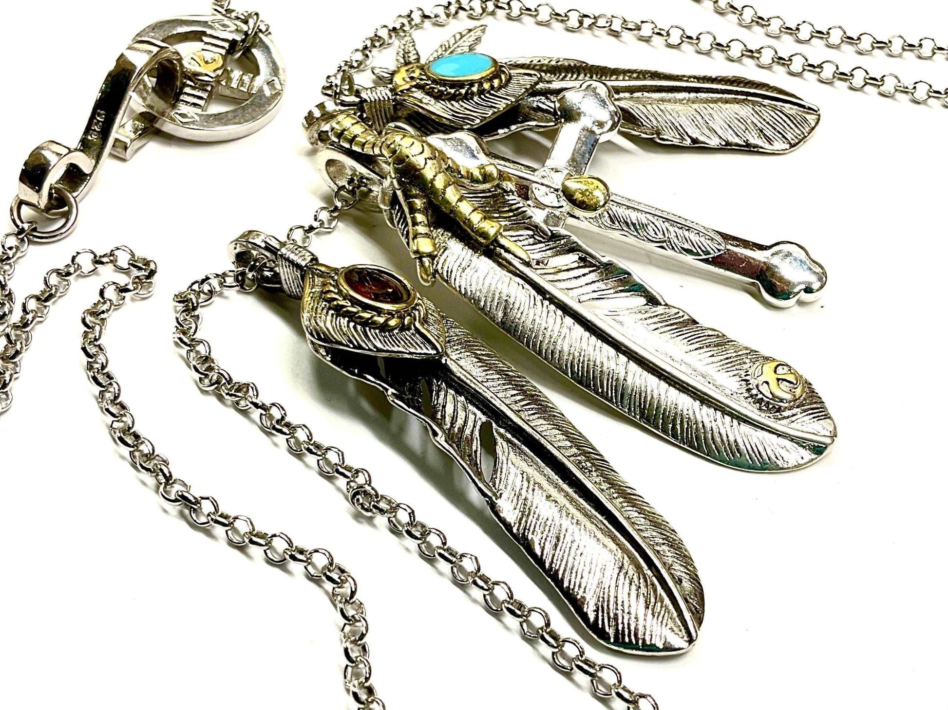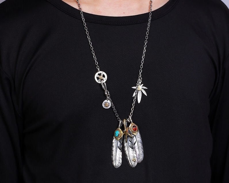 Cross Eagle Feather Necklace Western 3 Dangle Silver Eagle Claw Antique Pendants Bohemian Boho Hippie Turquoise Indian Jewelry
