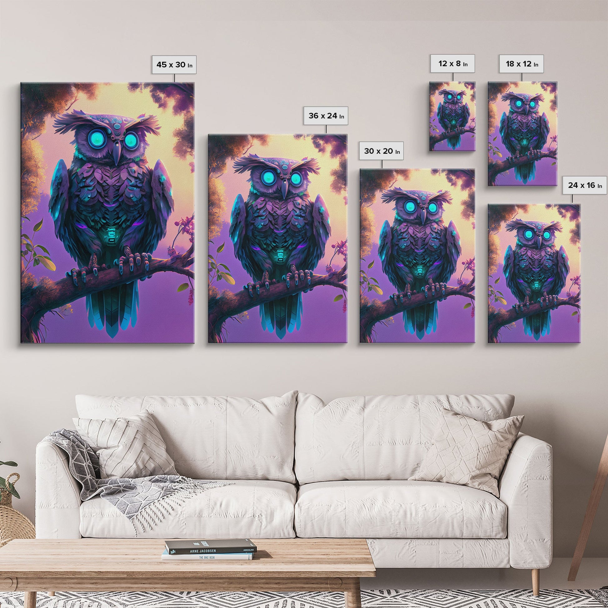 Cyberpunk Robot Owl, framed canvas print, Cybernetic android owl art, vaporwave aesthetic futuristic art