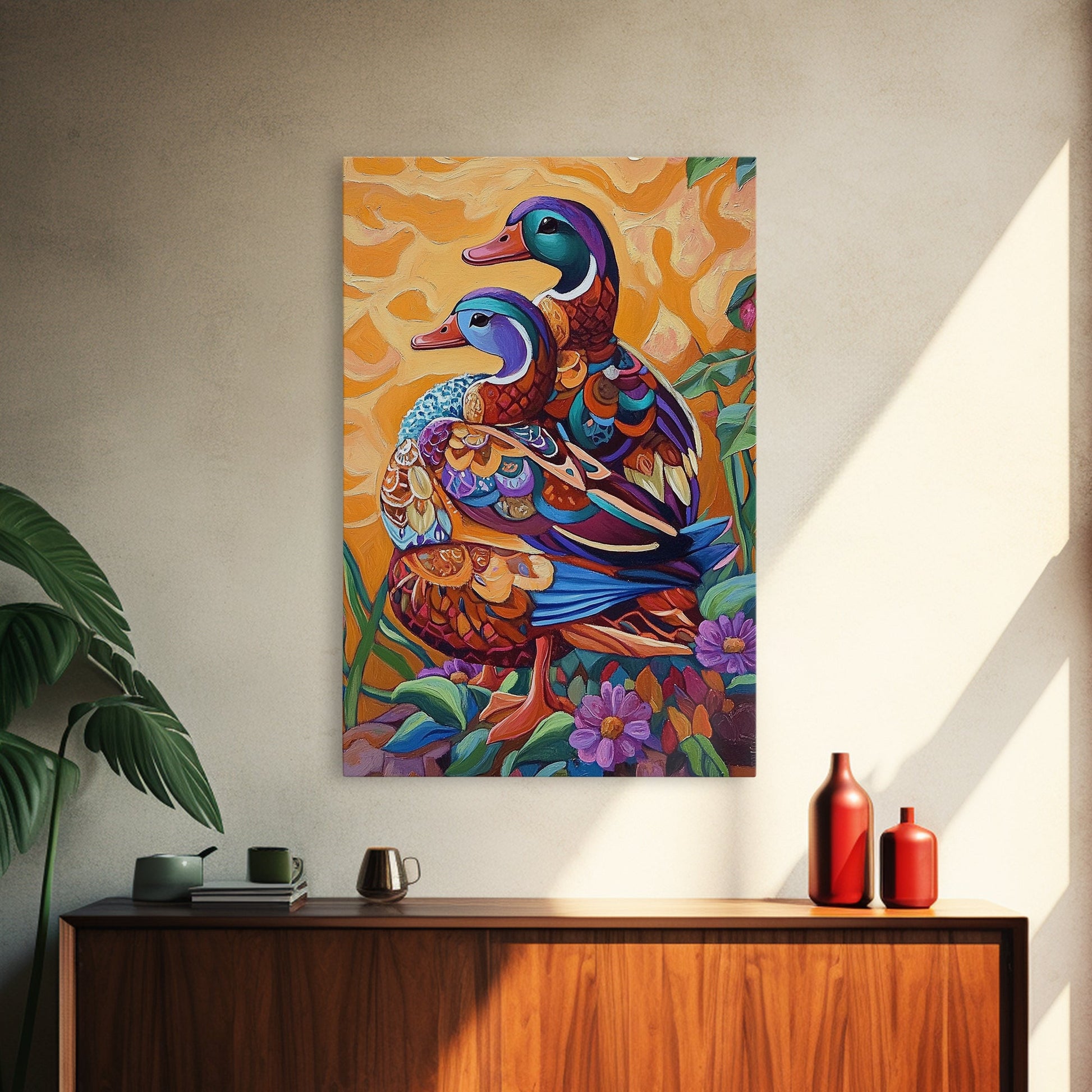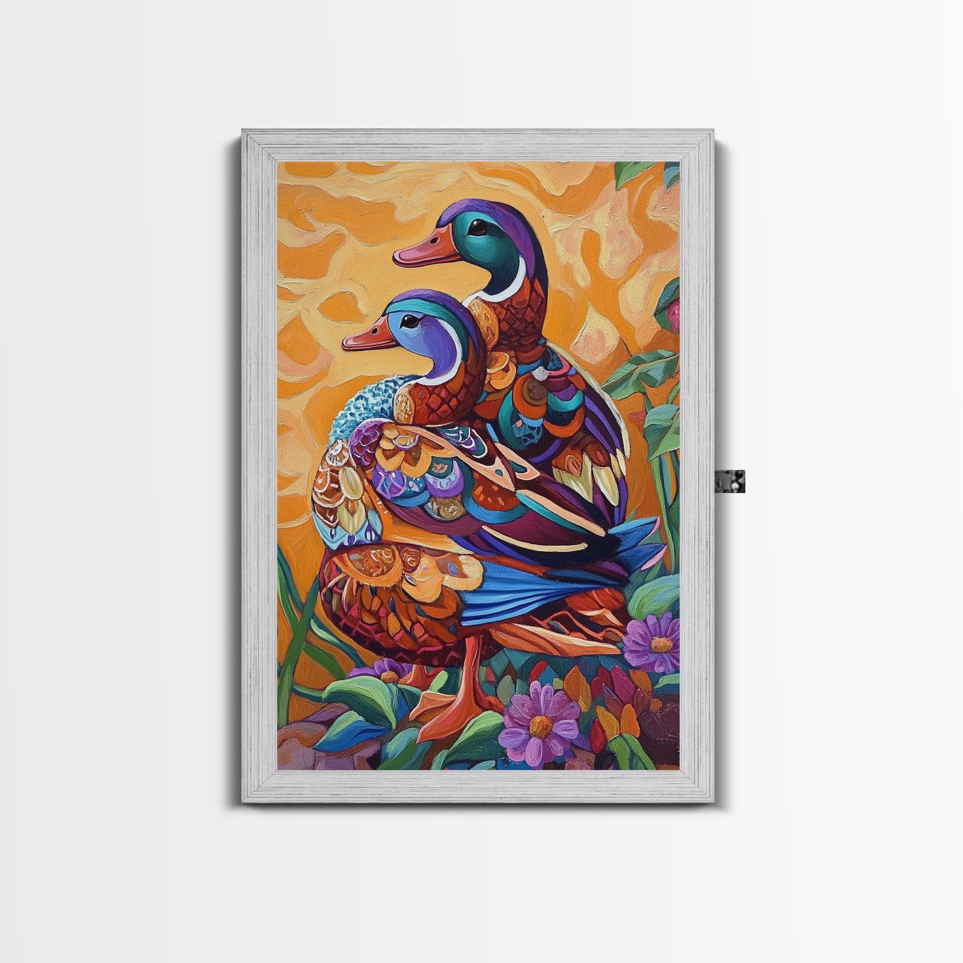 Ducks Colorful, Whimsical, Pair, Framed Canvas Print, Animal couple wall art, farmhouse nursery artwork, folk style bird painting