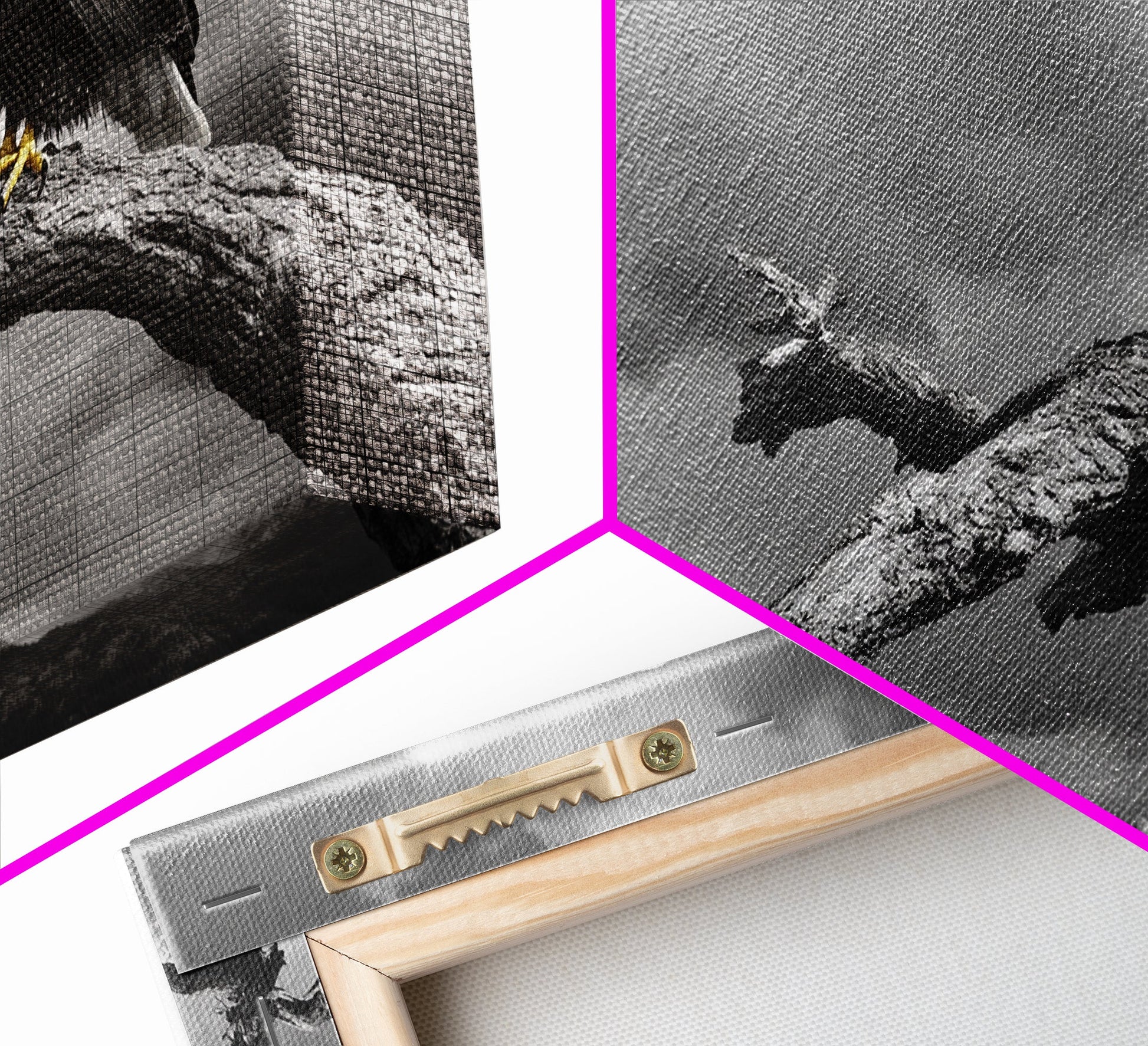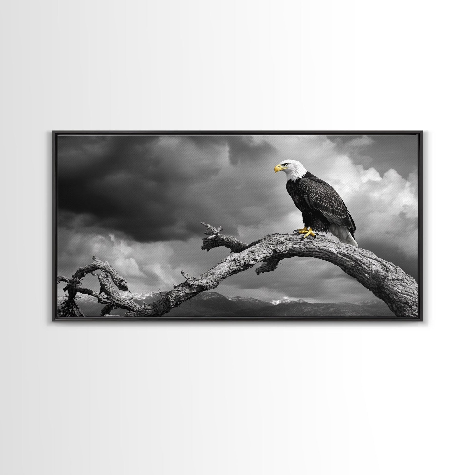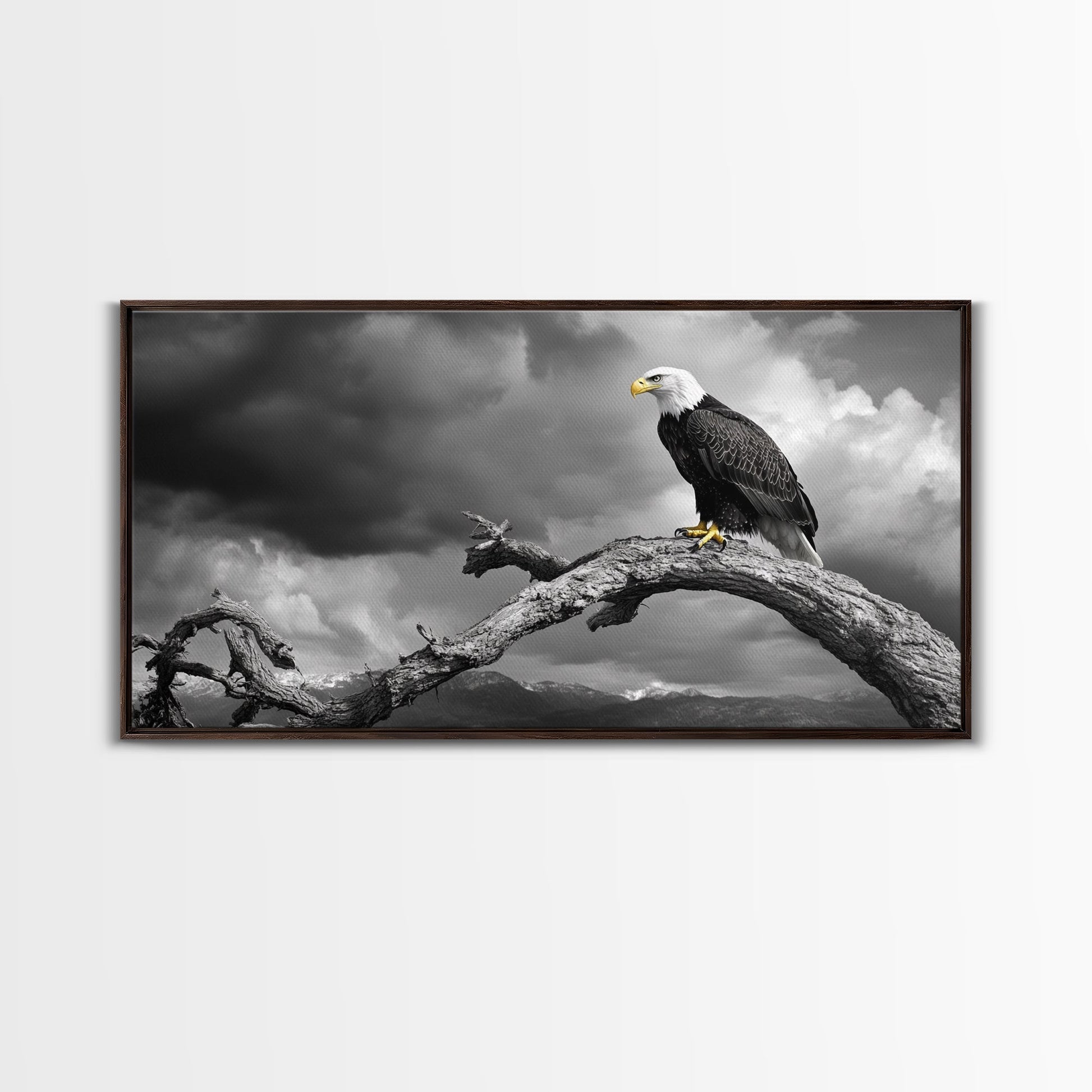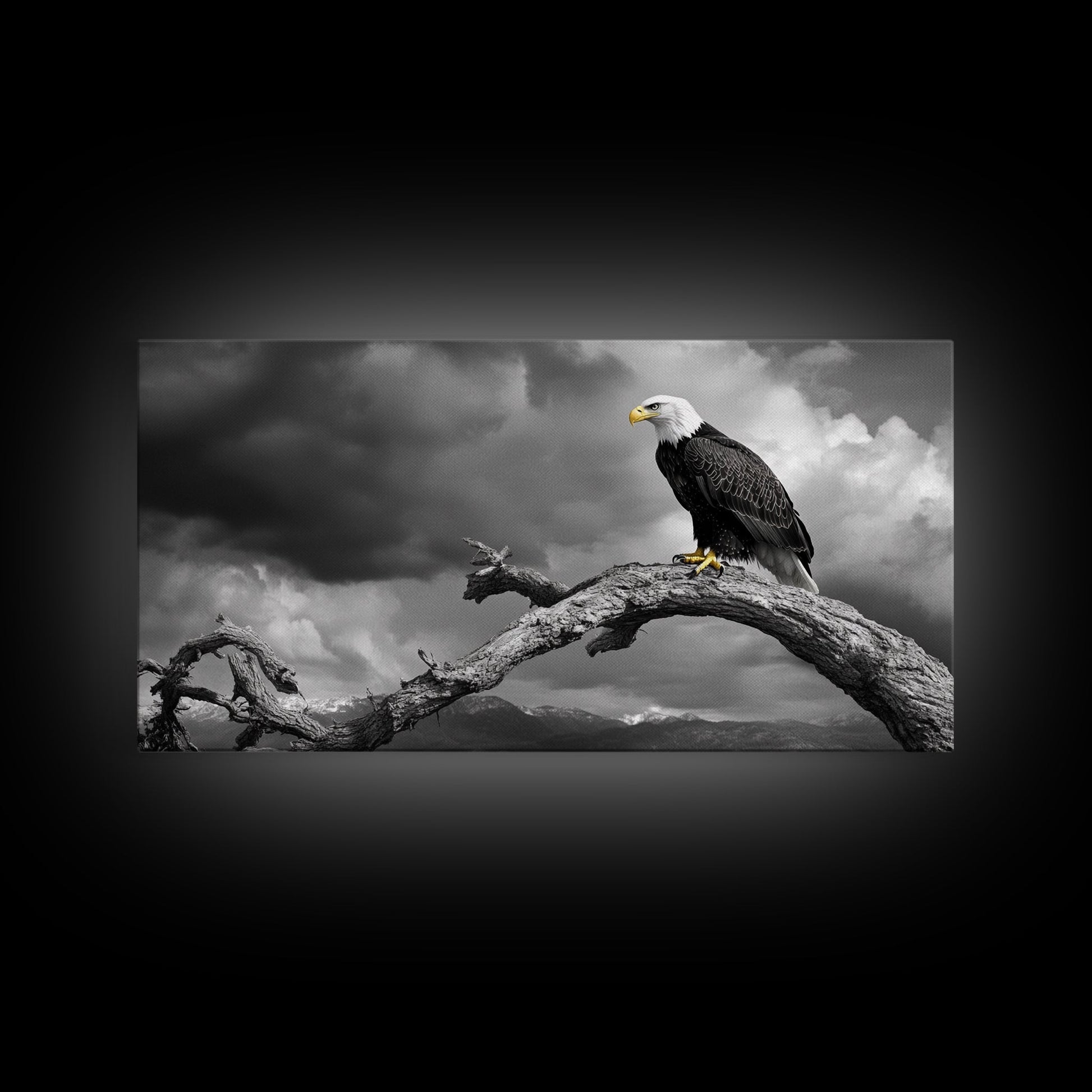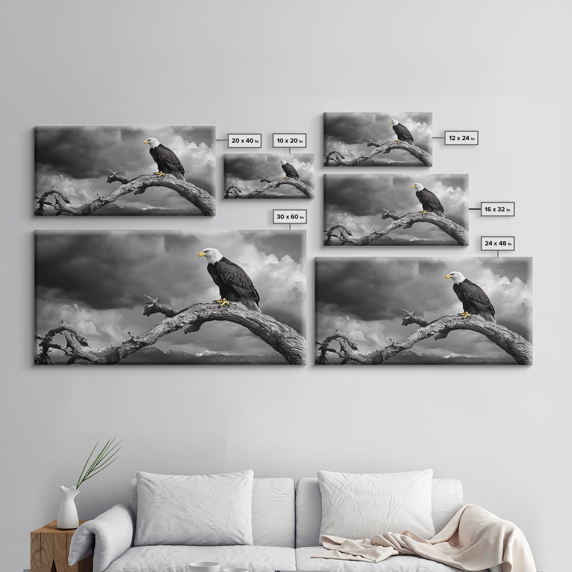 Eagle, Branch, Storm, Power and grace collide in this Framed Canvas Print of a majestic eagle perched before a storm, Living Room Wall Art