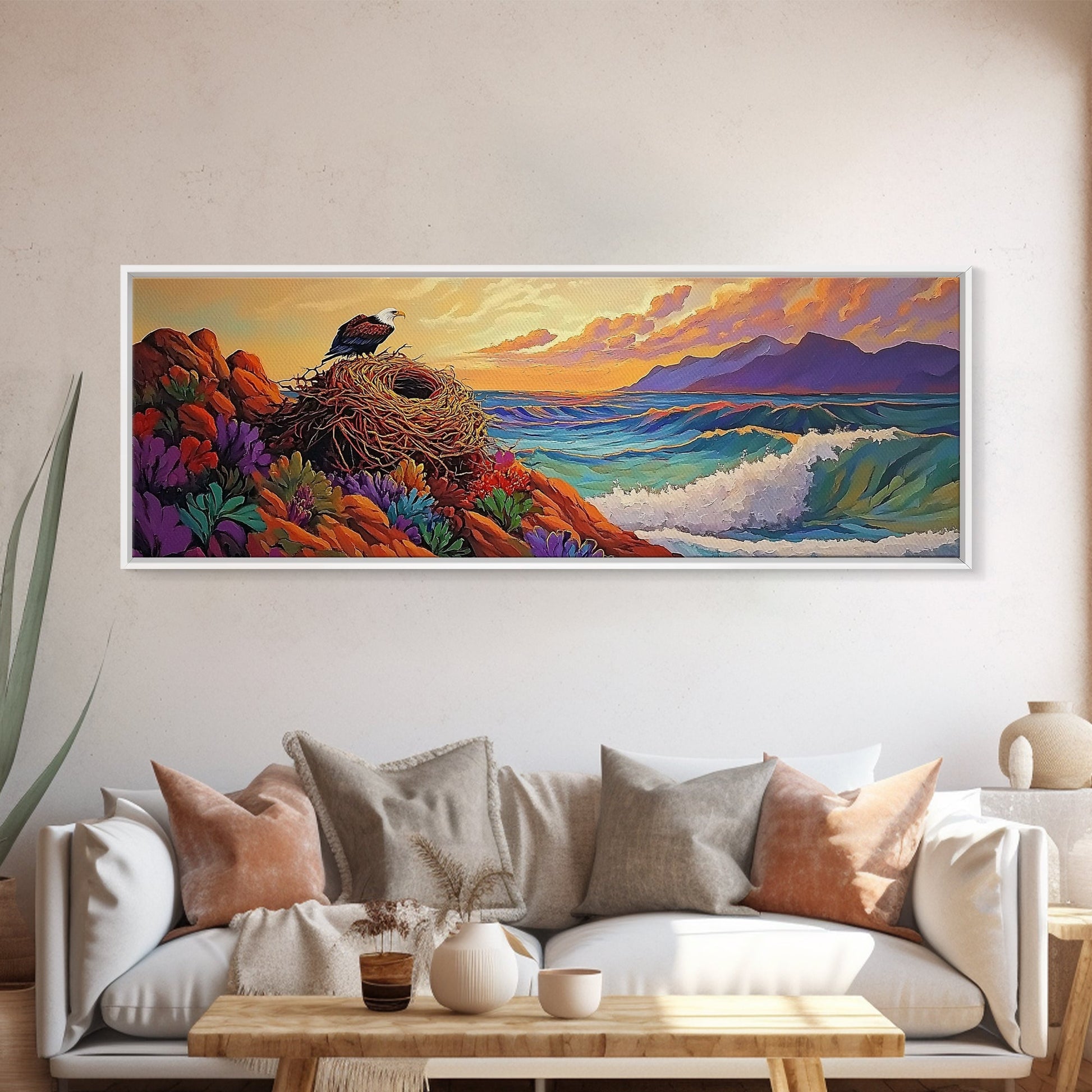 Eagle Nest Painting, Coastal Wildlife Scene, Framed Canvas Print, Ocean View Wall Art, Nature Lover Decor, Office or Living Room