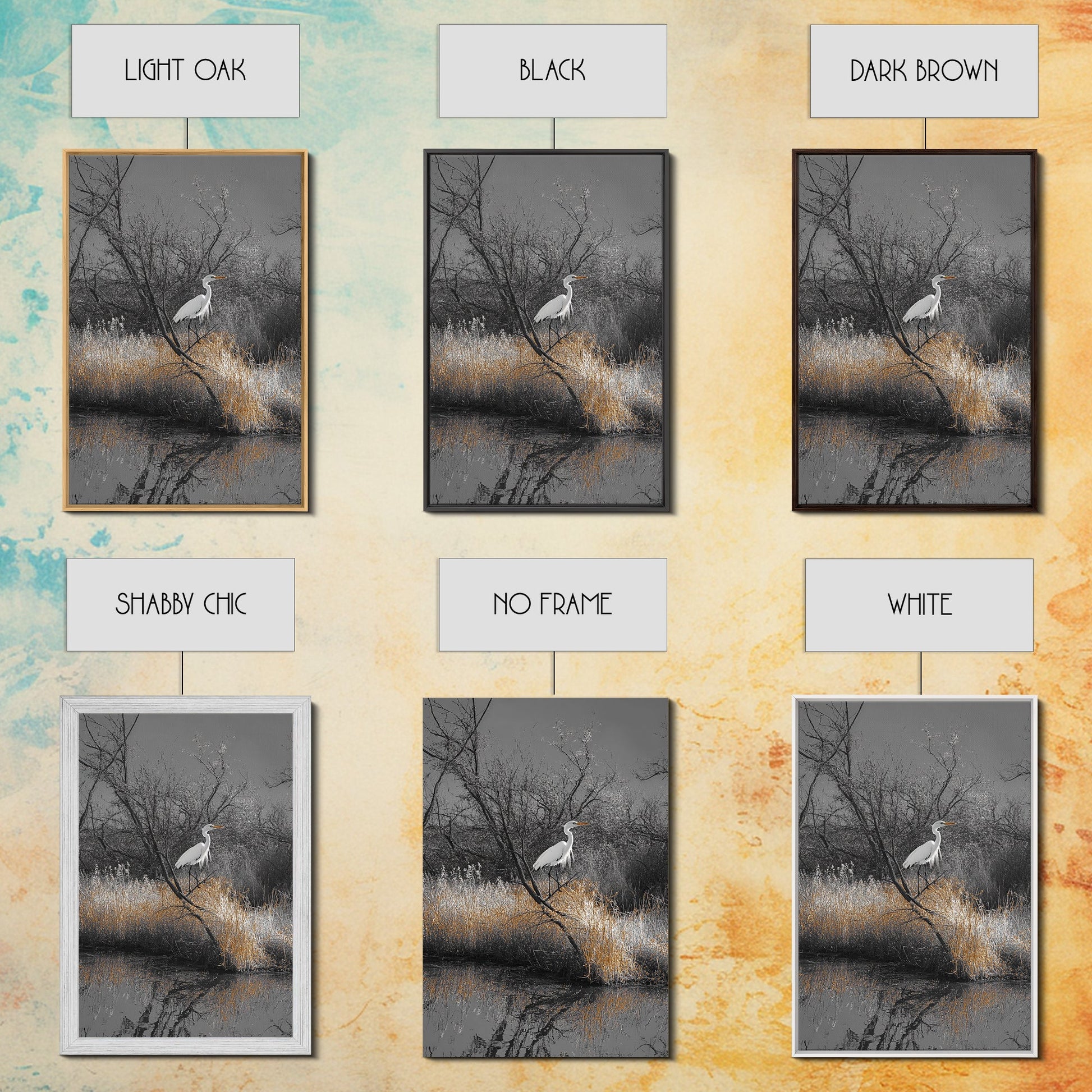 Egret Bird Scene, Autumn Riverbank, Wildlife Nature Print, Moody Wetland Landscape, Framed Canvas Print, Rustic Living Room Wall Art