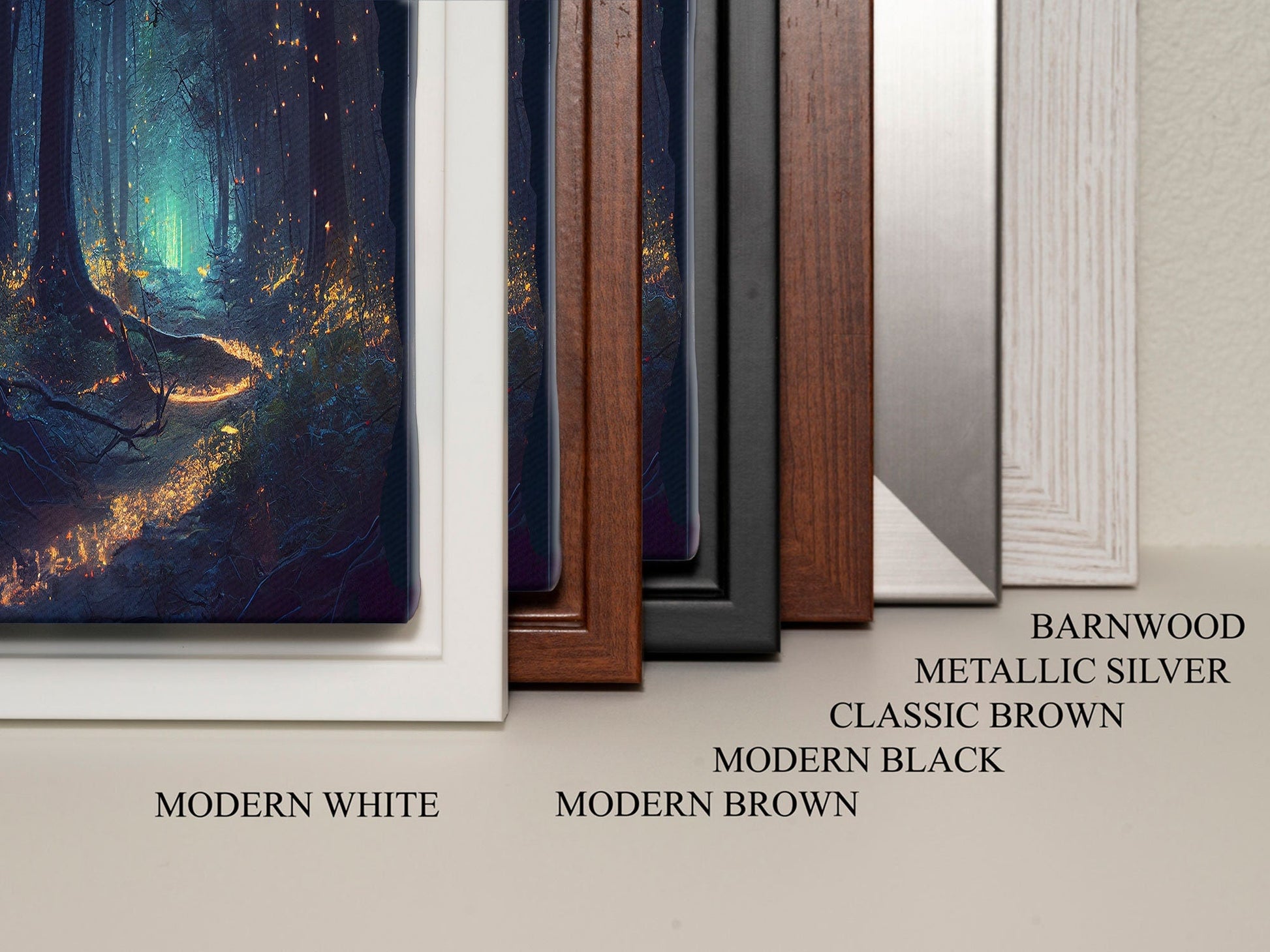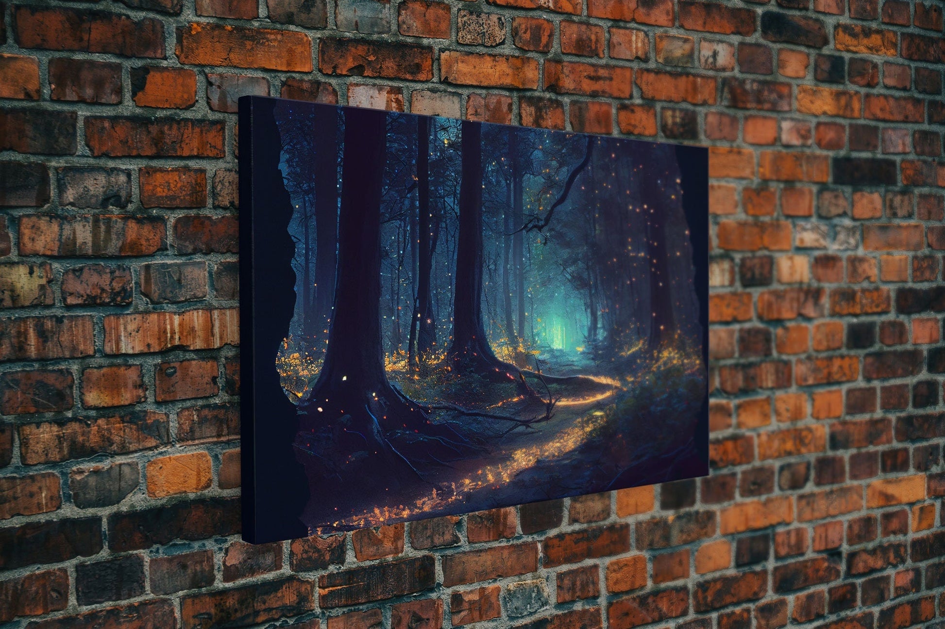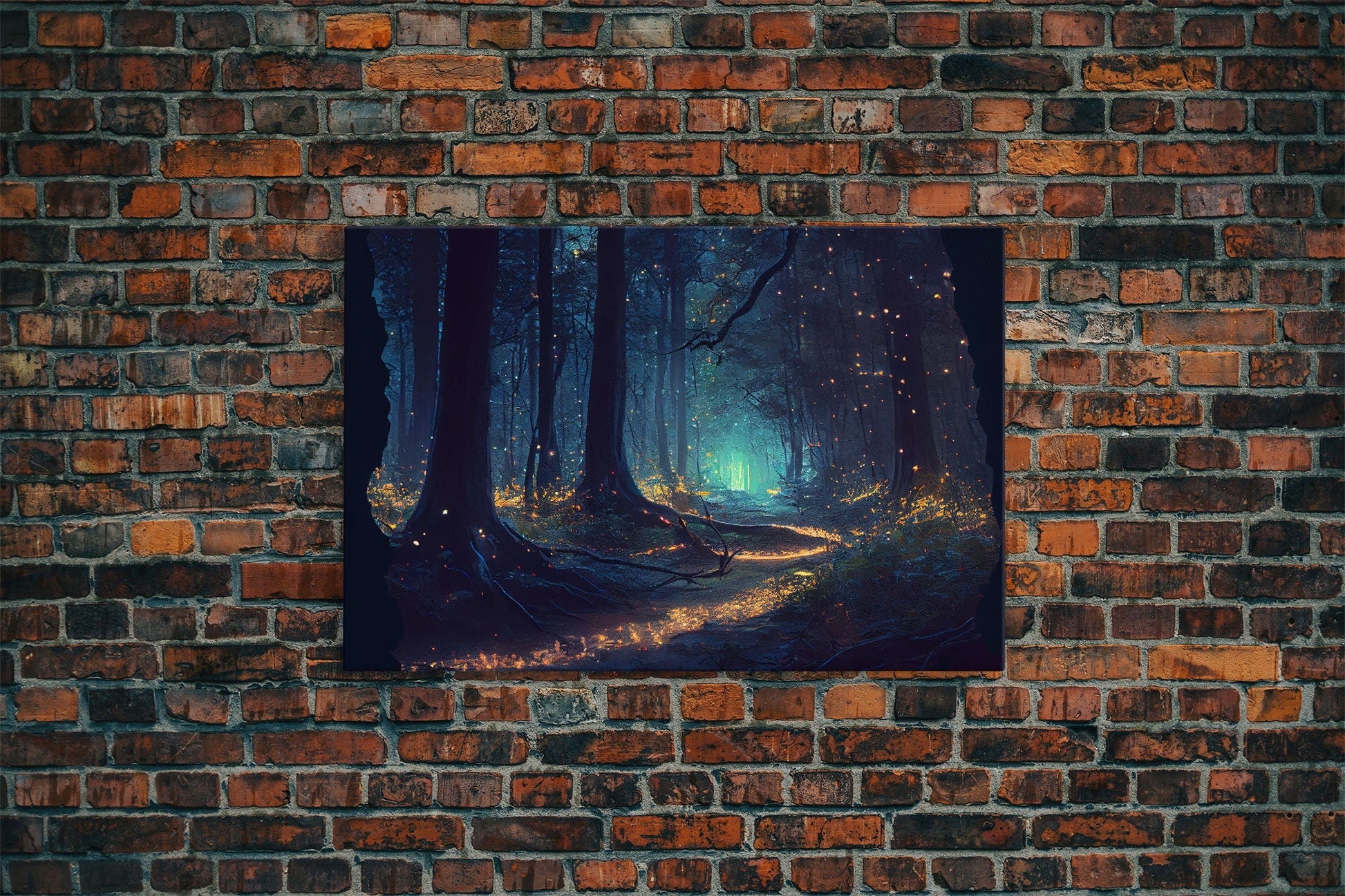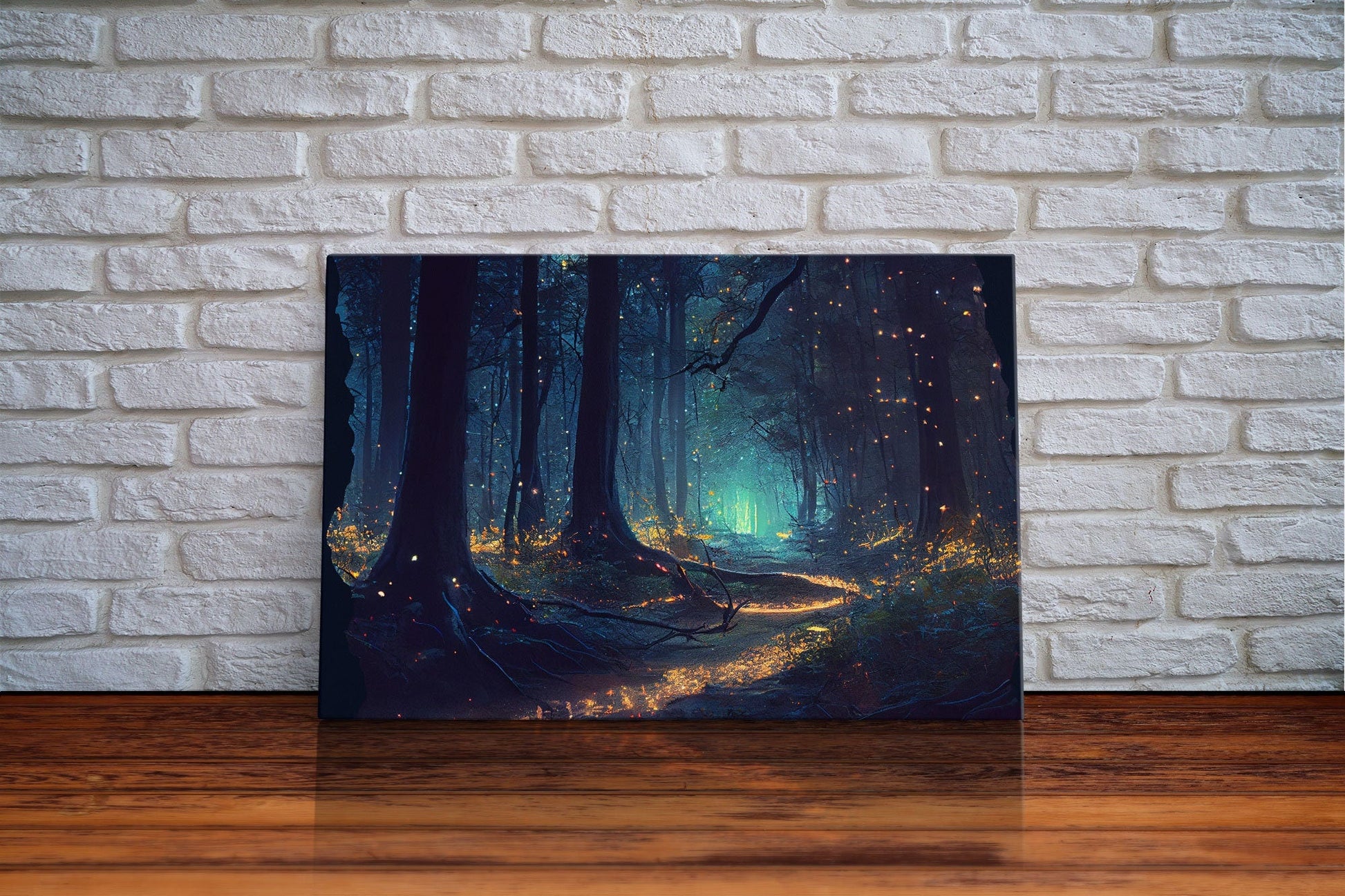 Fireflies light up a mystical fantasy forest at night, framed canvas art, framed print