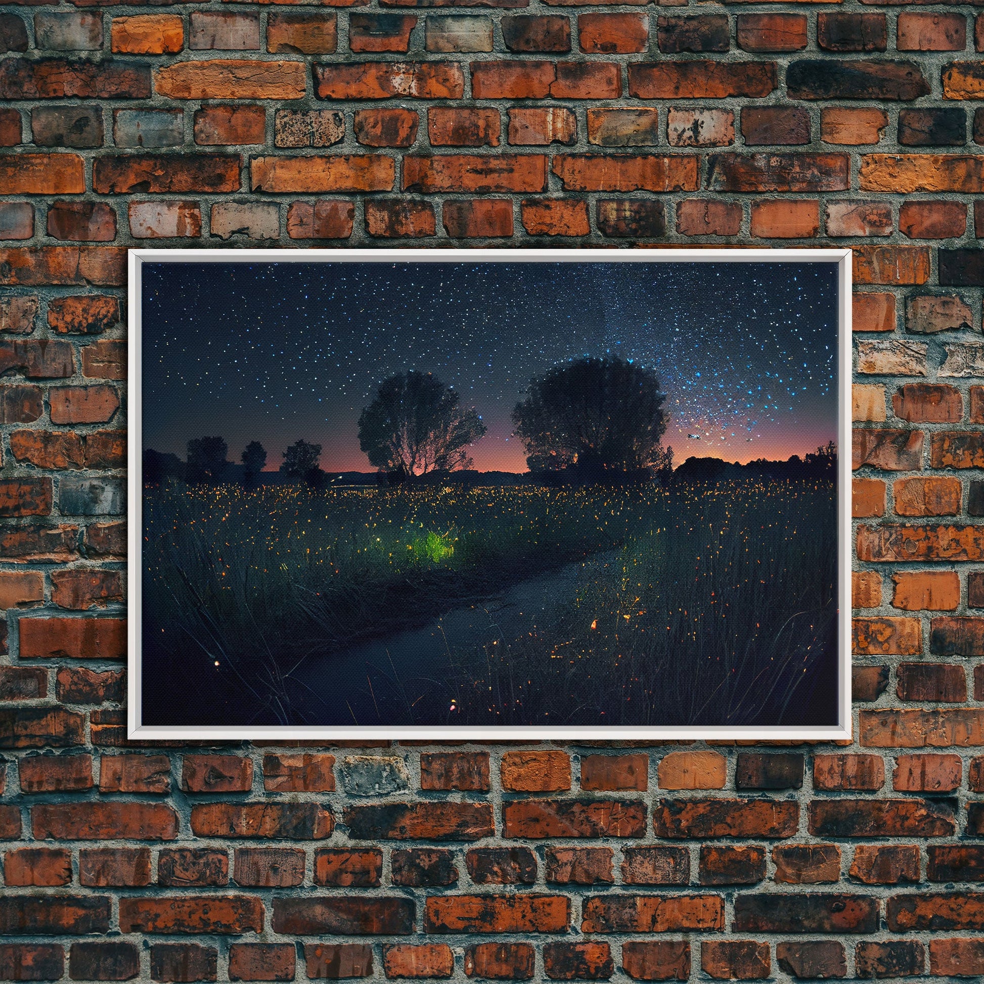 Fireflies light up the Oklahoma Prairie under a Starry night sky, framed canvas print