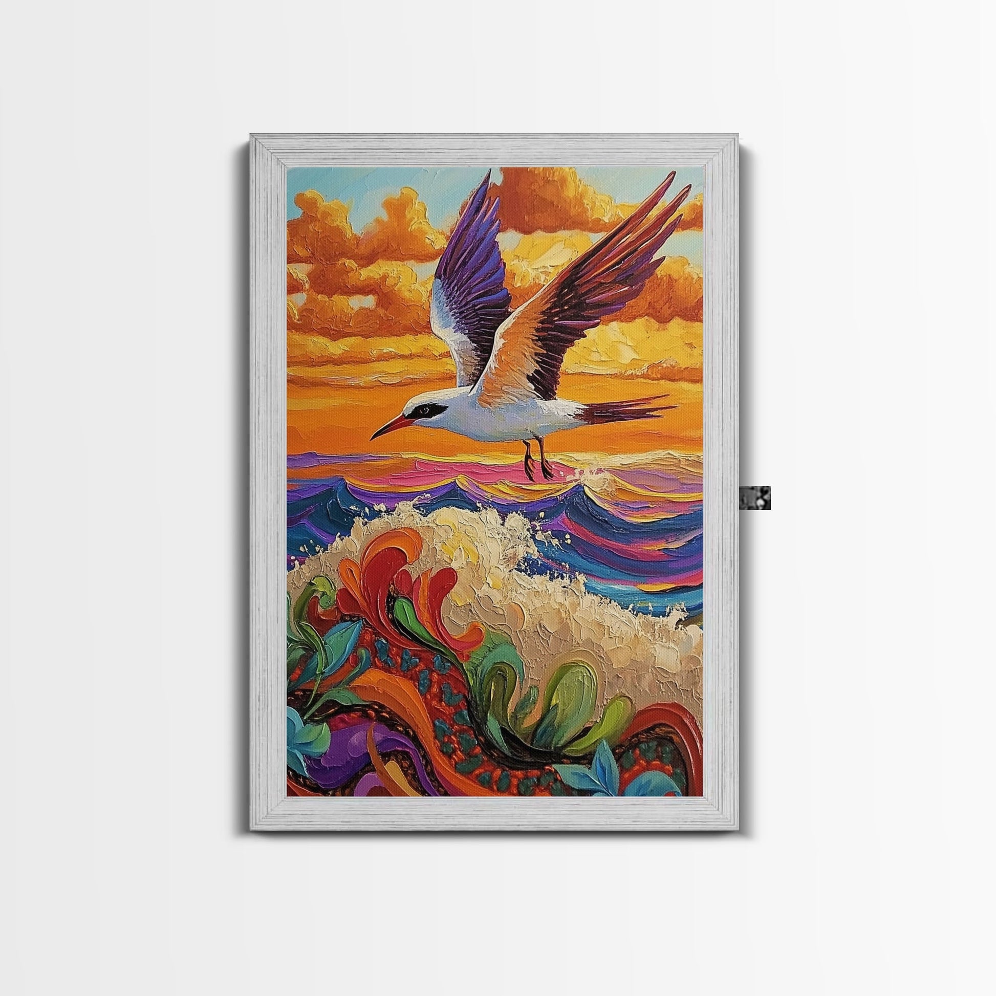 Flying Bird Sunset, Colorful Ocean Waves, Tropical Wildlife Art, Canvas Print, Boho Nature Decor, Fall Wall Accent, Vibrant Scene