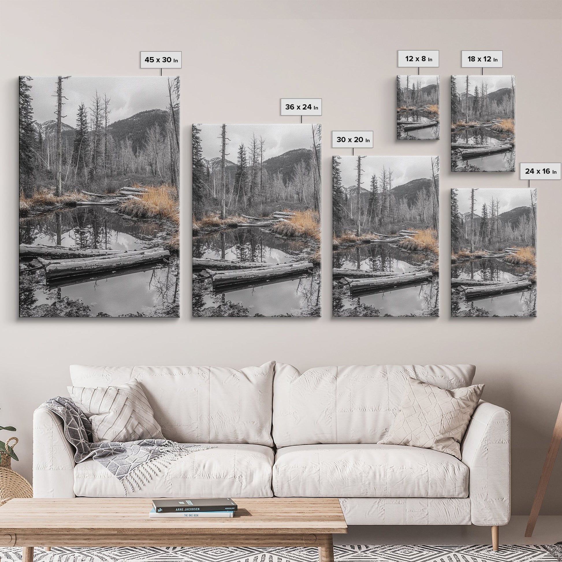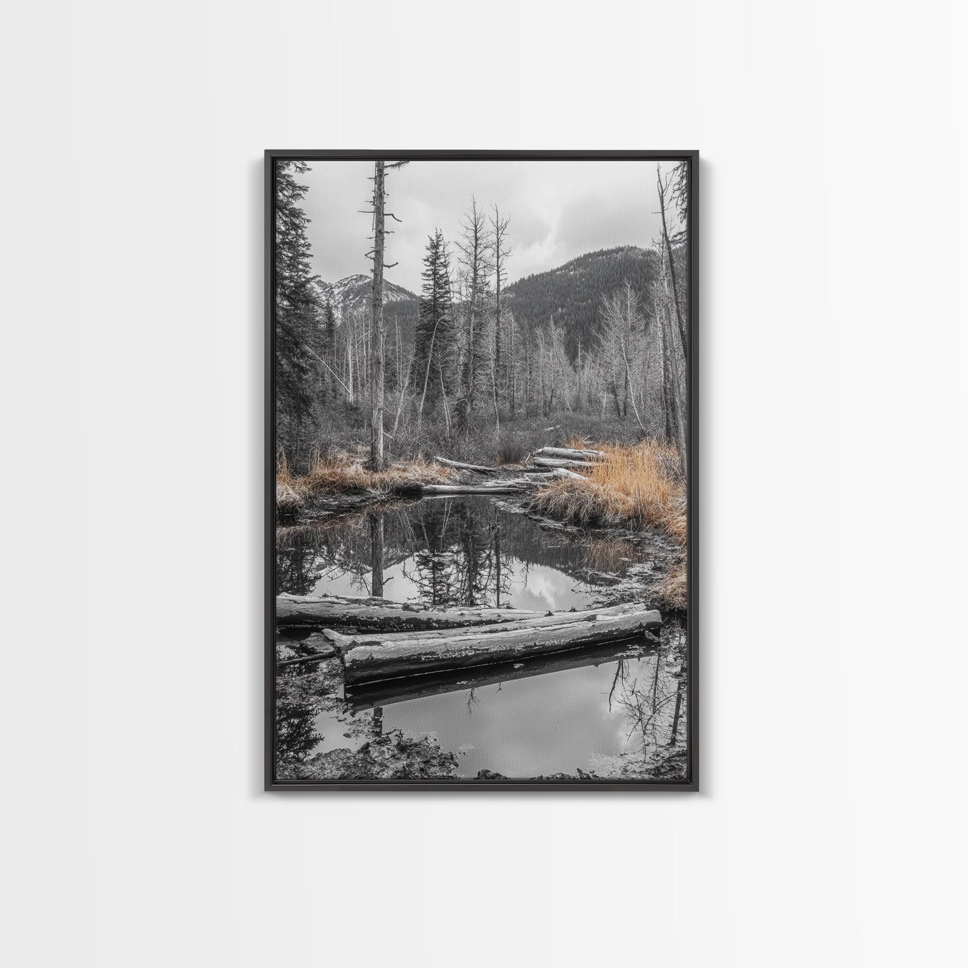 Forest Pond, Moody Woods, Black and White, Autumn Grass, Framed Canvas Print rustic cabin art, nature wall decor, woodland living room art