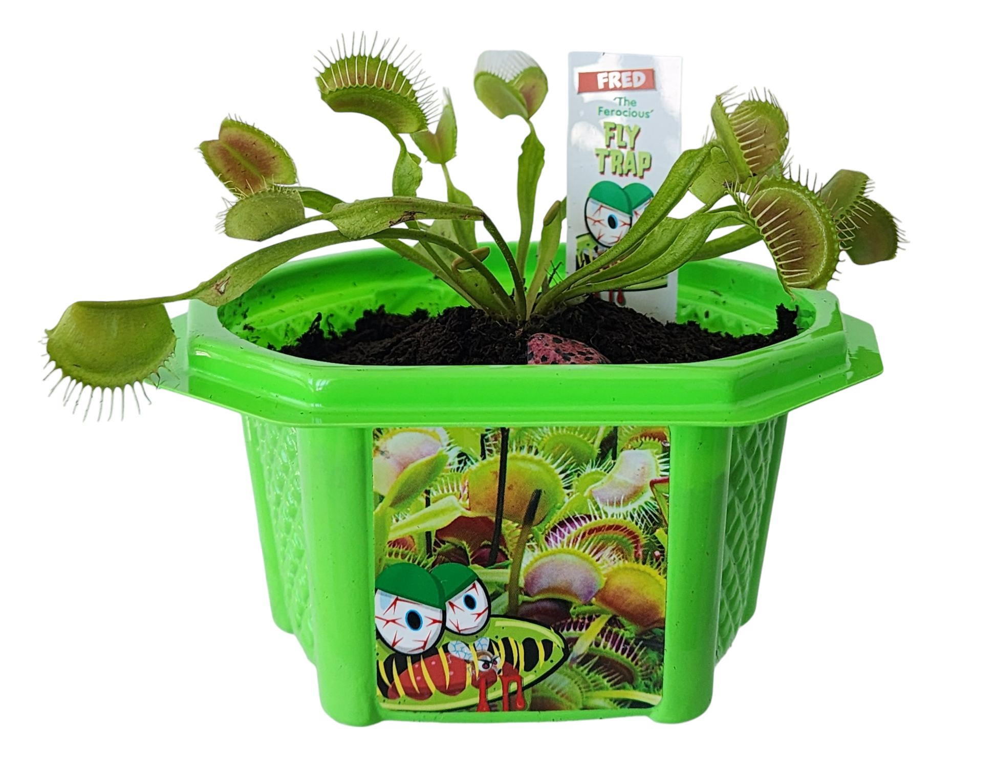 Fred the Ferocious Fly Trap really eats bugs! Although they take some time to sprout, they are fascinating to grow. These plants originated from a small region in North Carolina and are extremely specialized plants. This entertaining kit comes with everything you need, even a collectible plant stake and genuine red jasper stone- just add water! You can ONLY USE DISTILLED WATER as the plants cannot tolerate the minerals and salts in tap or spring water. The red jasper stone represents the meat that these plants eat!