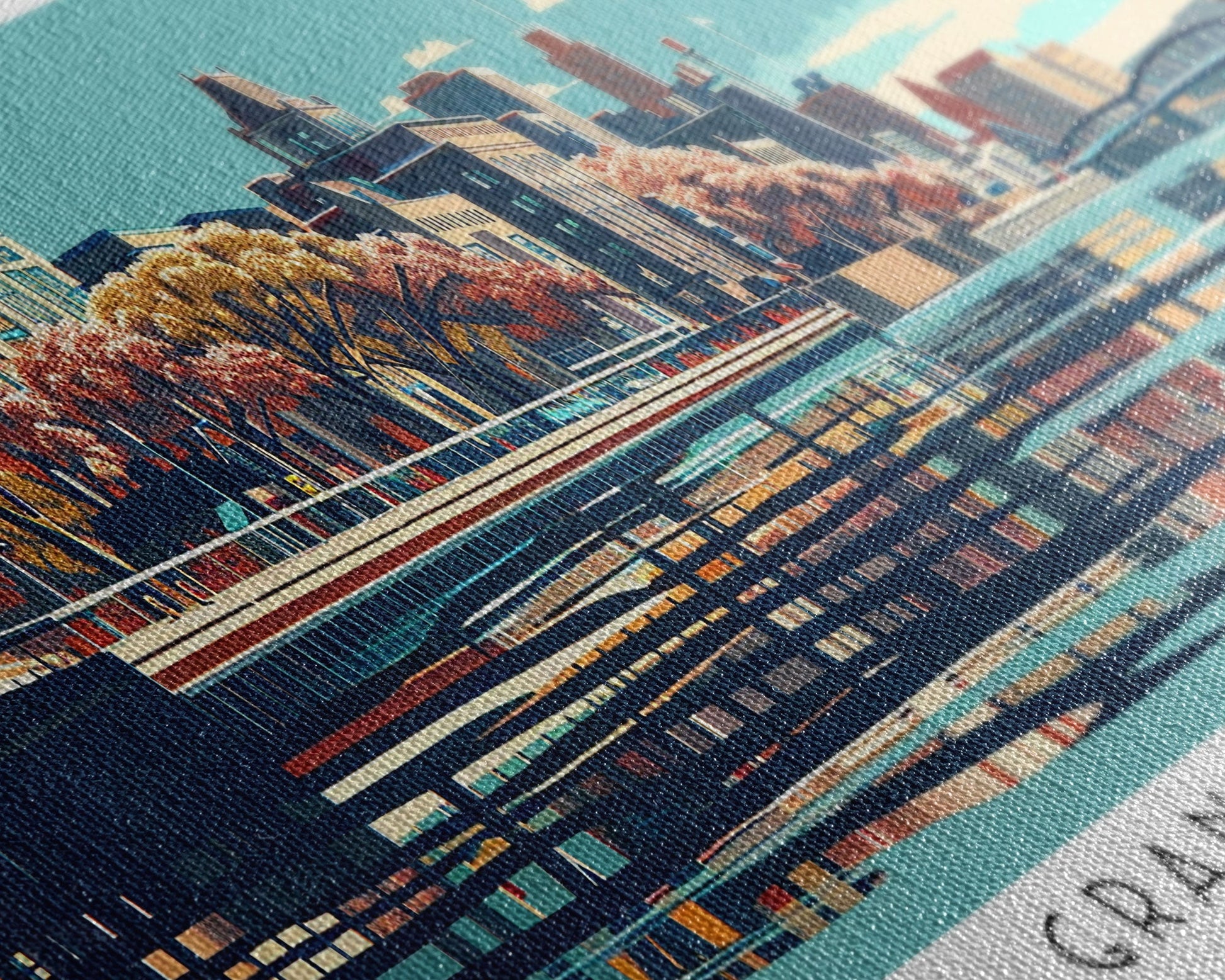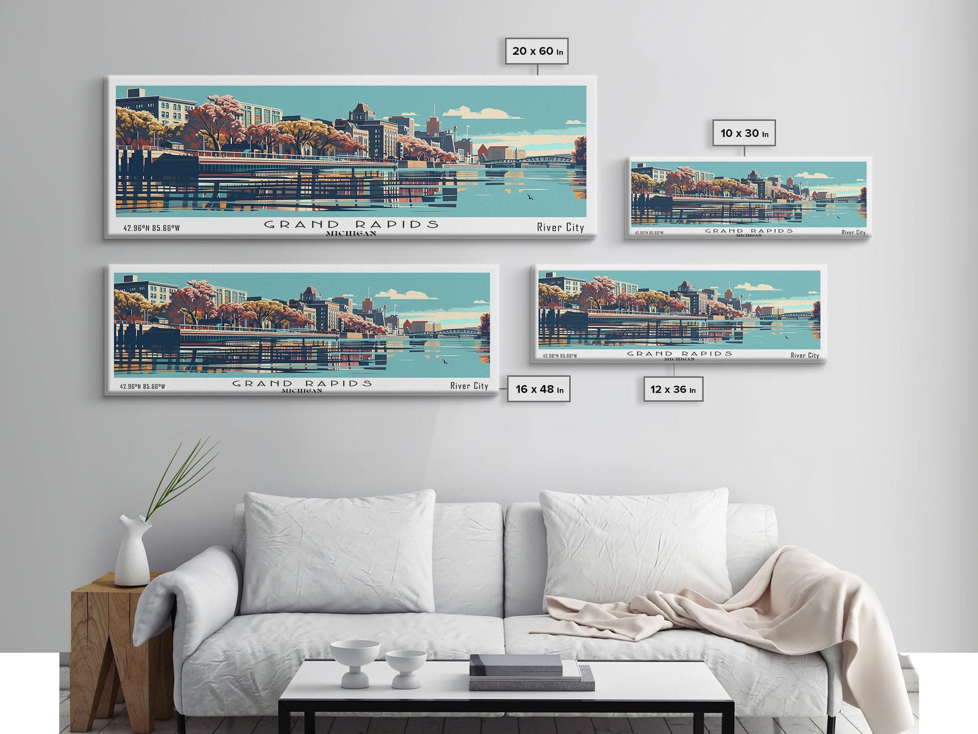 Grand Rapids Michigan Panoramic Painting, Framed Canvas Print, Mid Century Modern Wall Art, Retro Pop Art Travel Poster, Cityscape Decor, Living Room Art, Office Wall Art