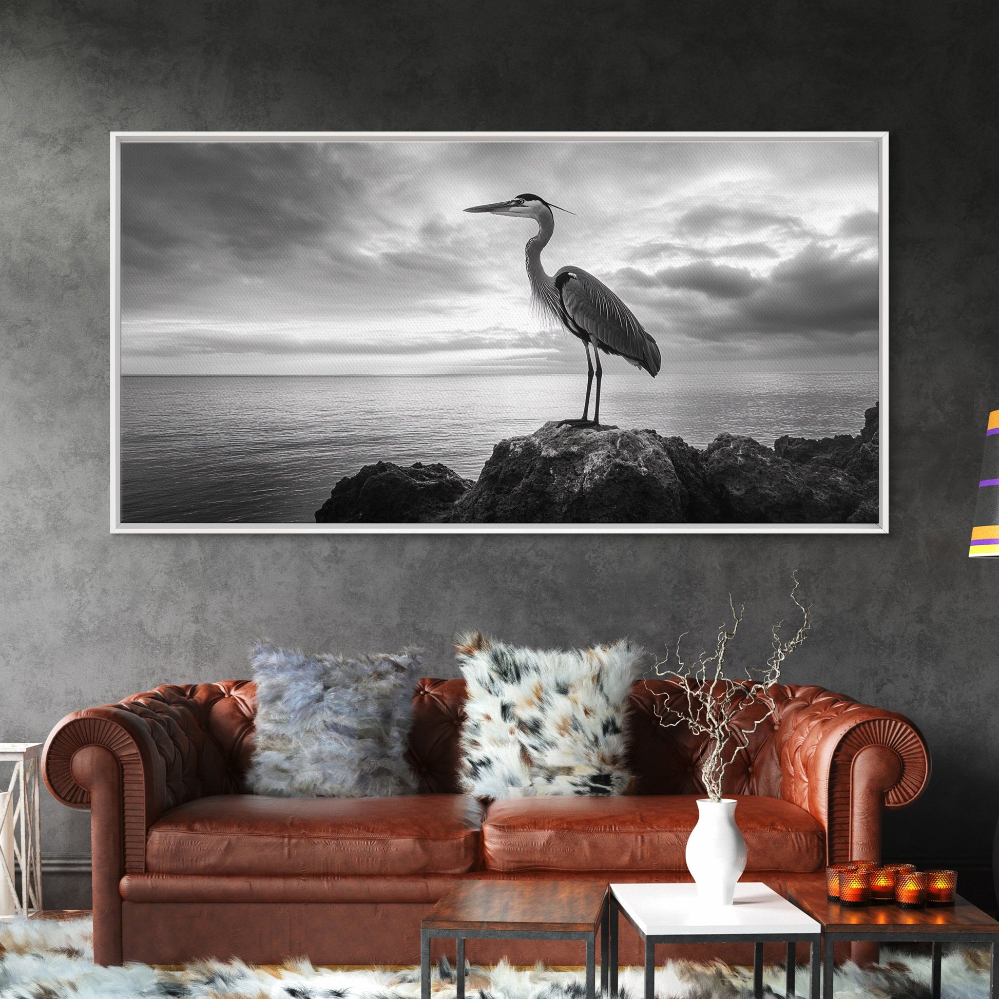 Heron Bird, Ocean Rock, Serene Wildlife, Canvas Print, Coastal Wall Art, Modern Farmhouse Decor, Minimalist Animal Scene