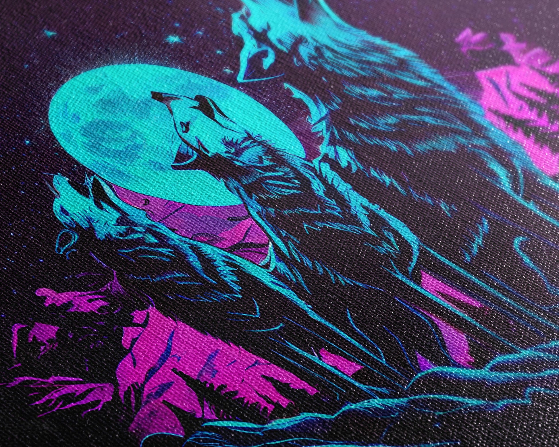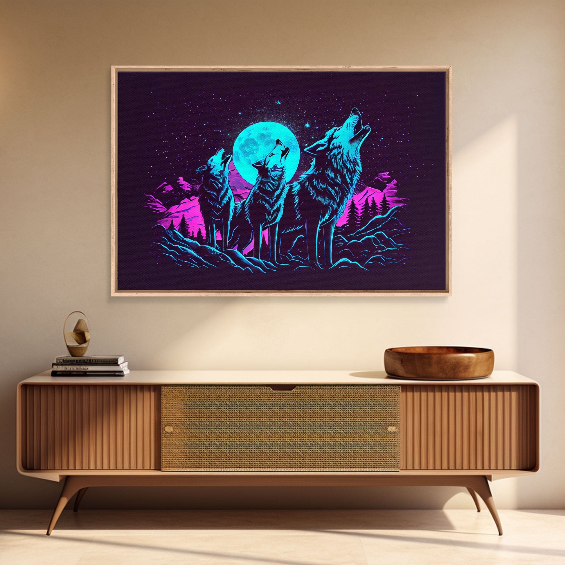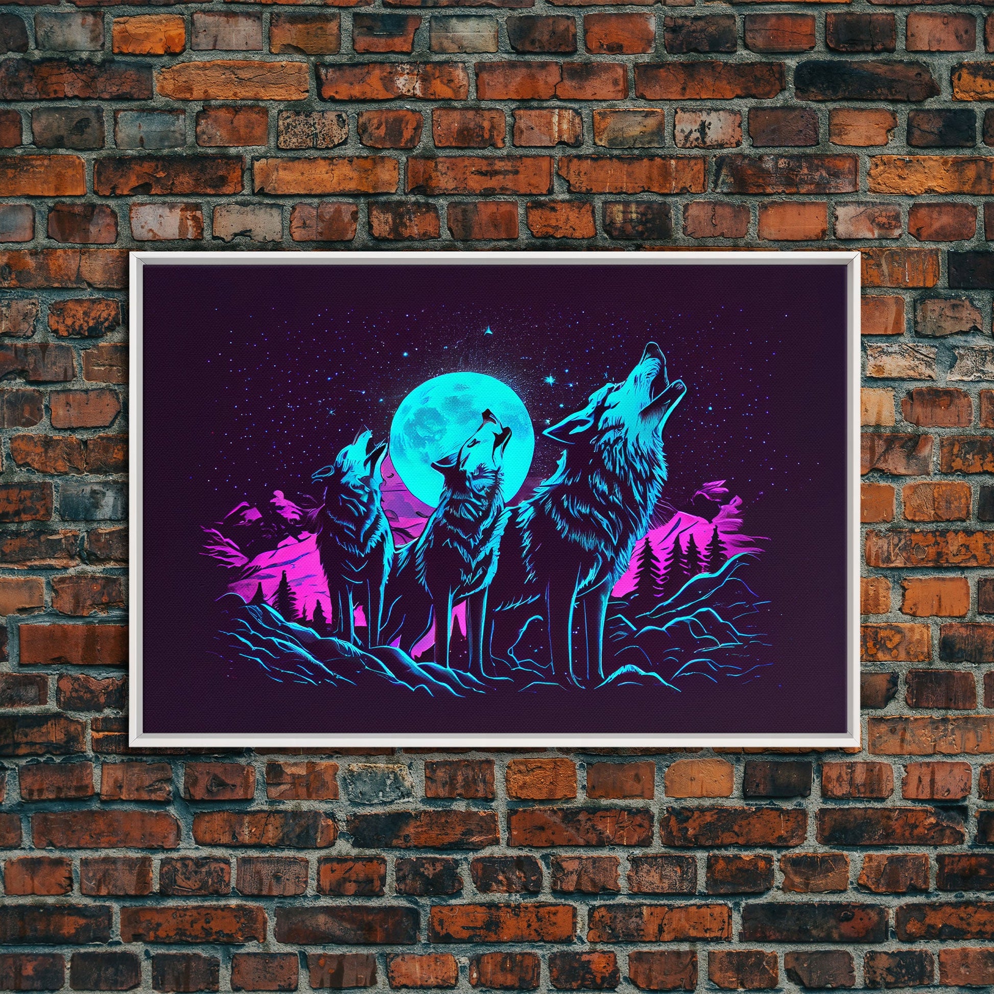 Howl at the moon - turquoise wolf pack howling at the moon, framed canvas print, vaporwave art