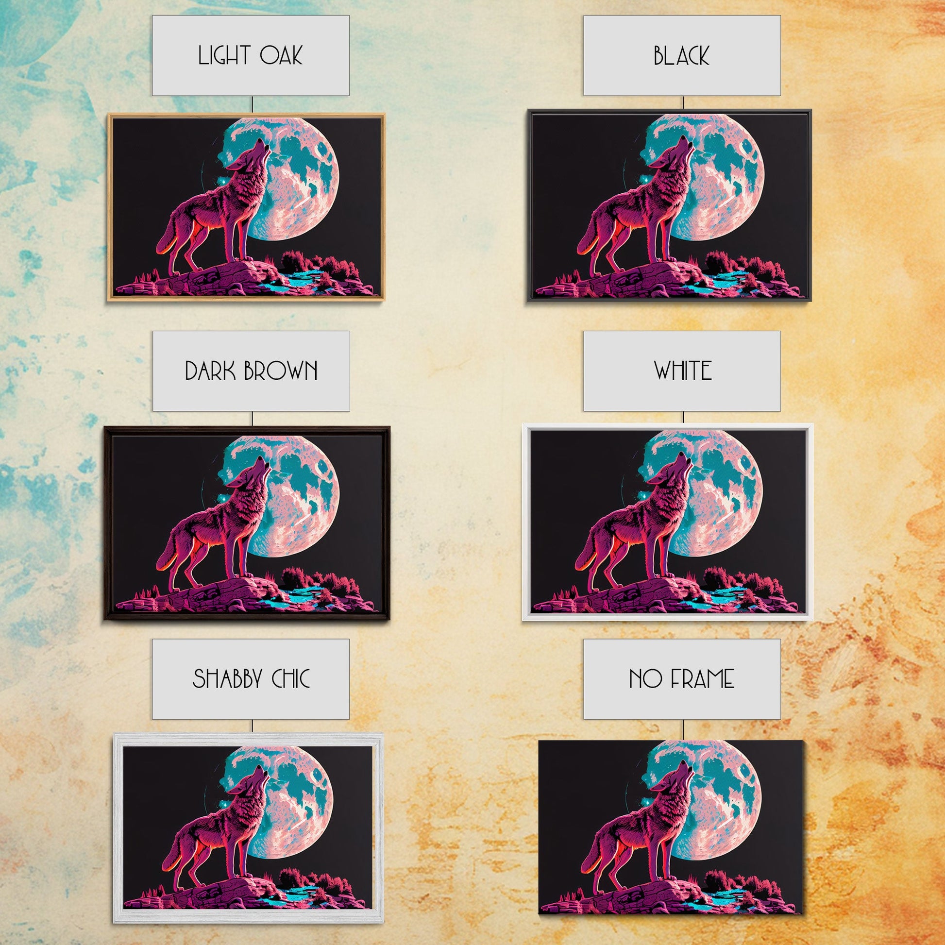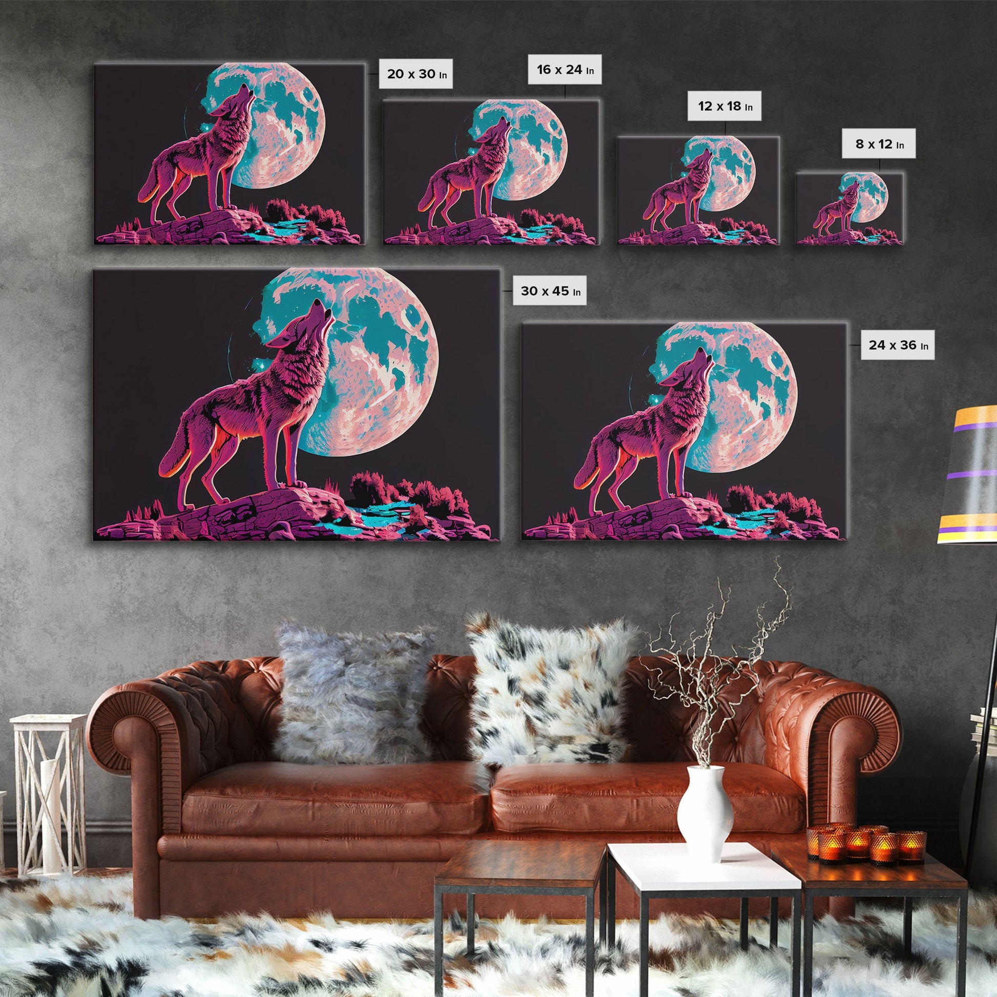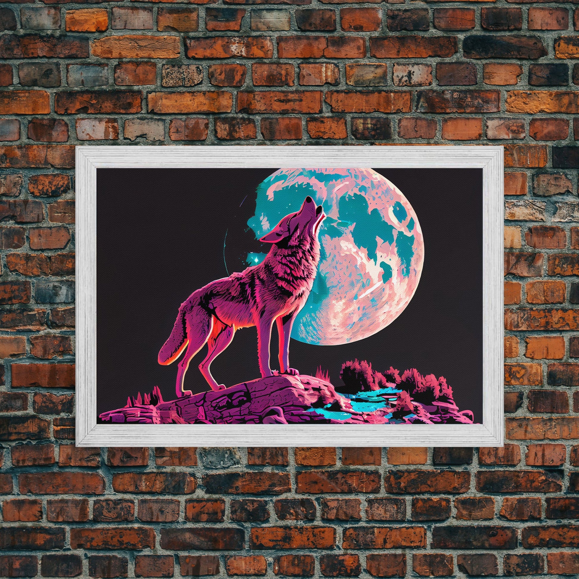 Howl at the moon, wolf art, framed canvas print, synthwave / vaporwave art