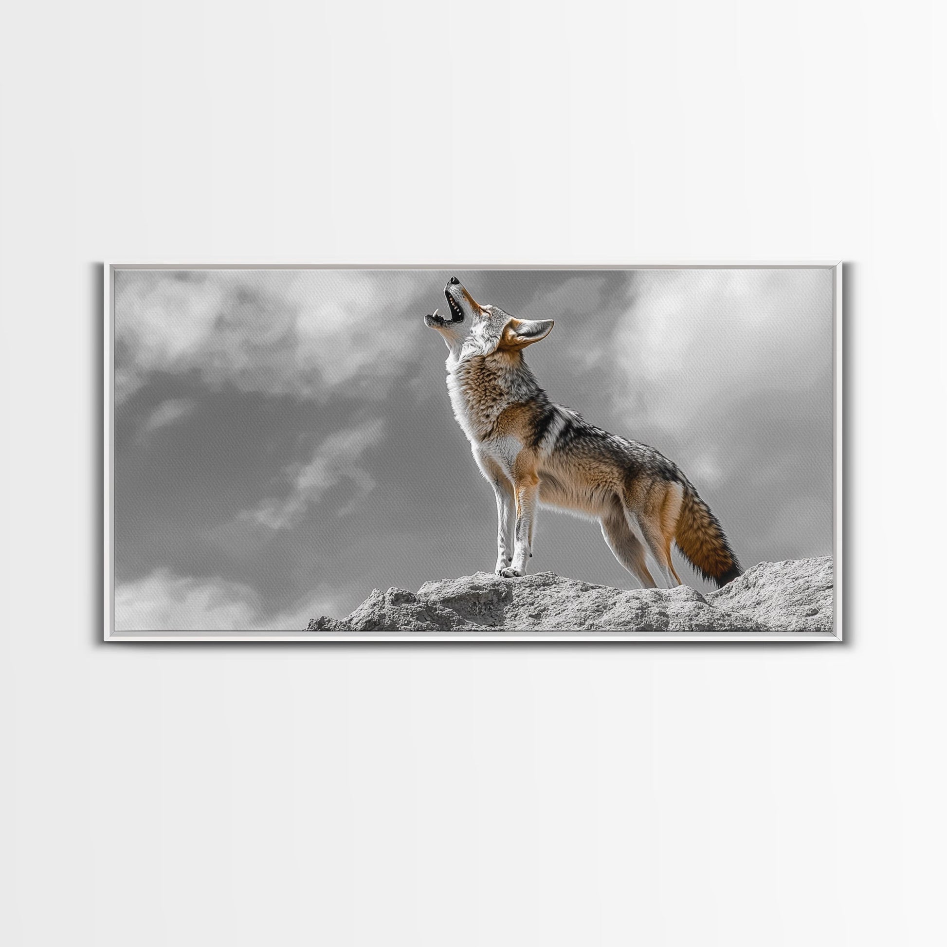 Howling Coyote Peak, Desert Wildlife Portrait, Majestic Animal Scene, Framed Canvas Print, Cabin Decor, Nature Wall Art, Minimalist Vibe