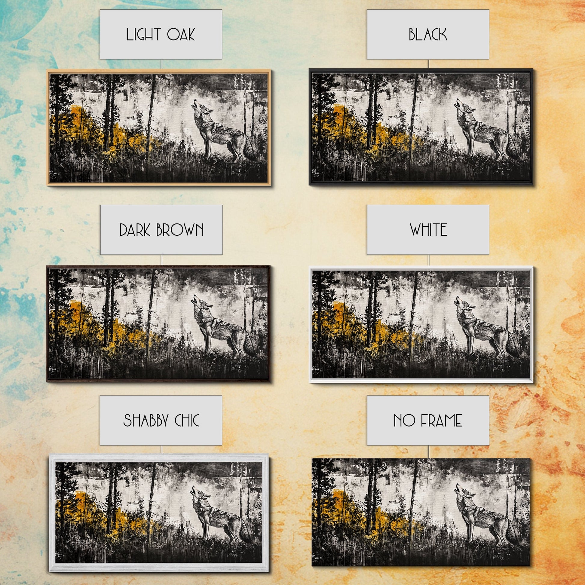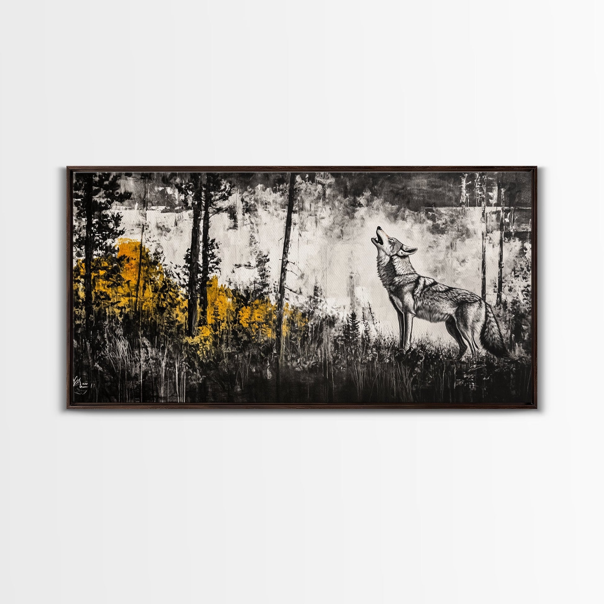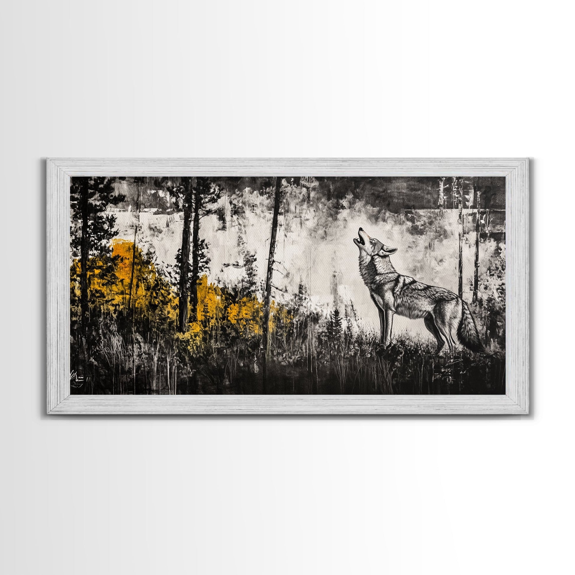 Howling Wolf, moody art, pine tree art, rustic wall art, forest at dusk painting, extra wide art, framed canvas print, southwestern art