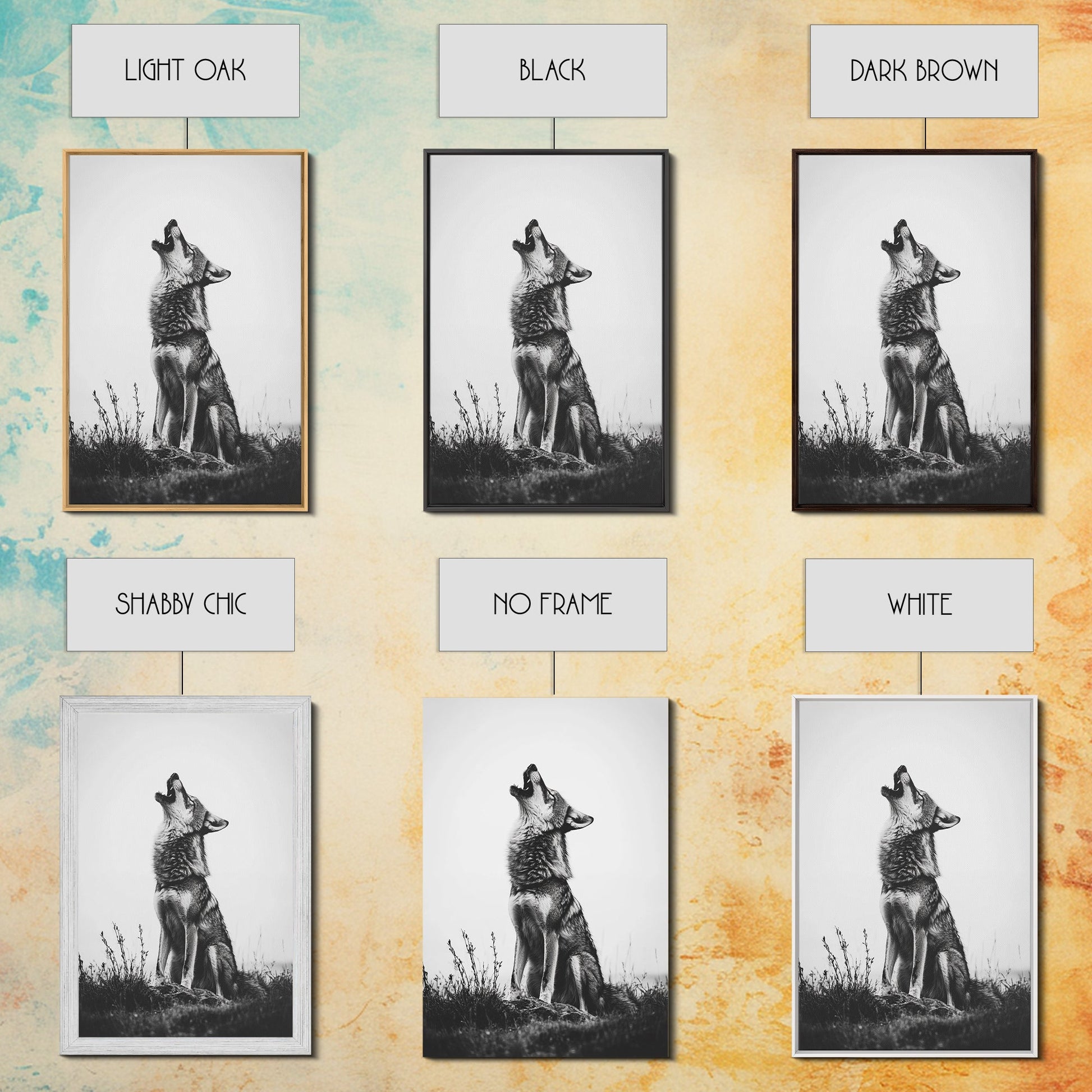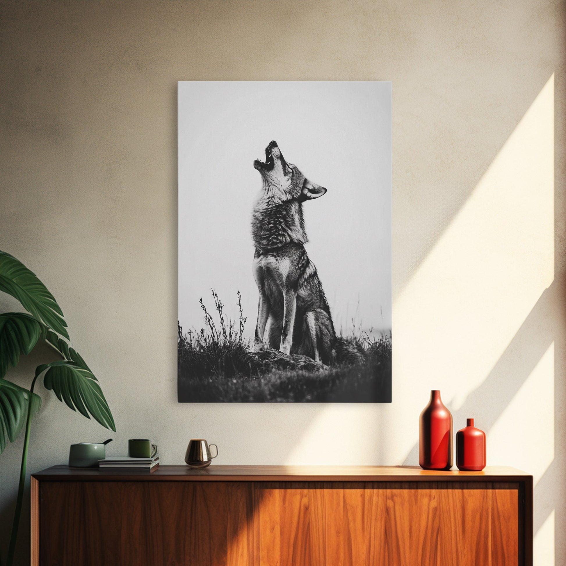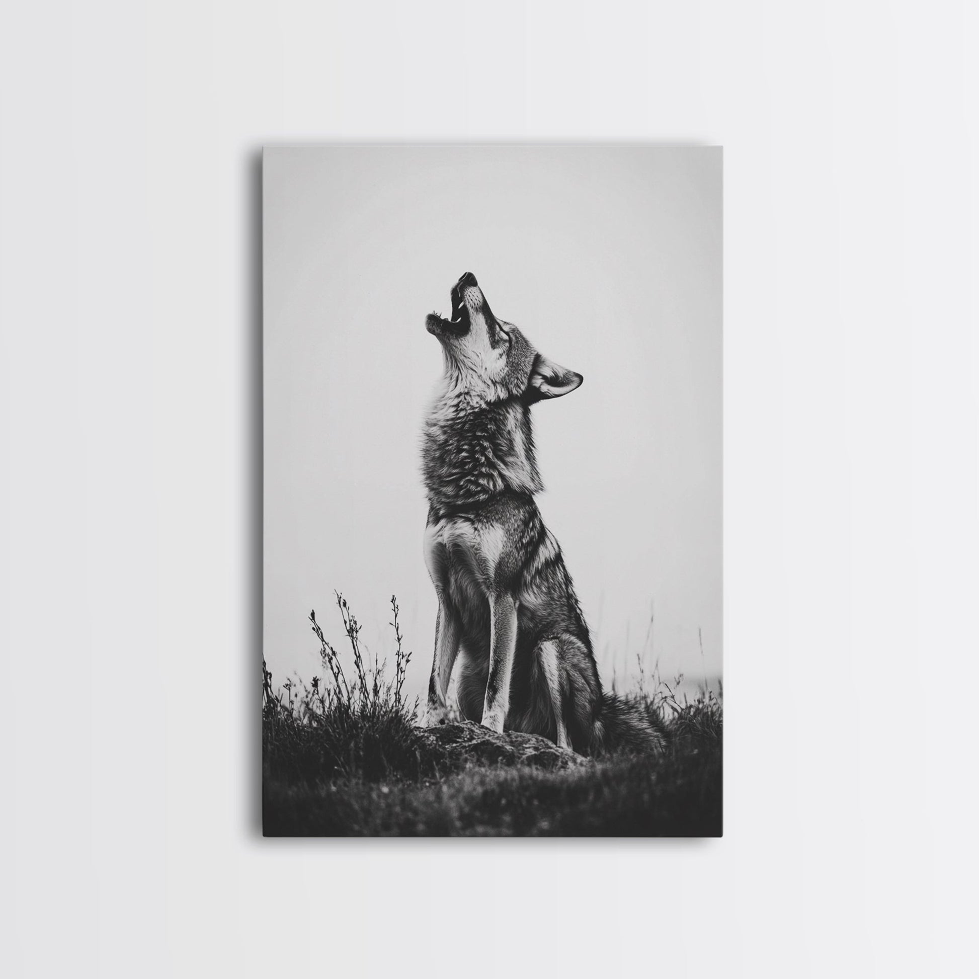 Howling Wolf, wildlife art, moody art, rustic decor, nature photography, black and white animal print, framed canvas print, minimalist art