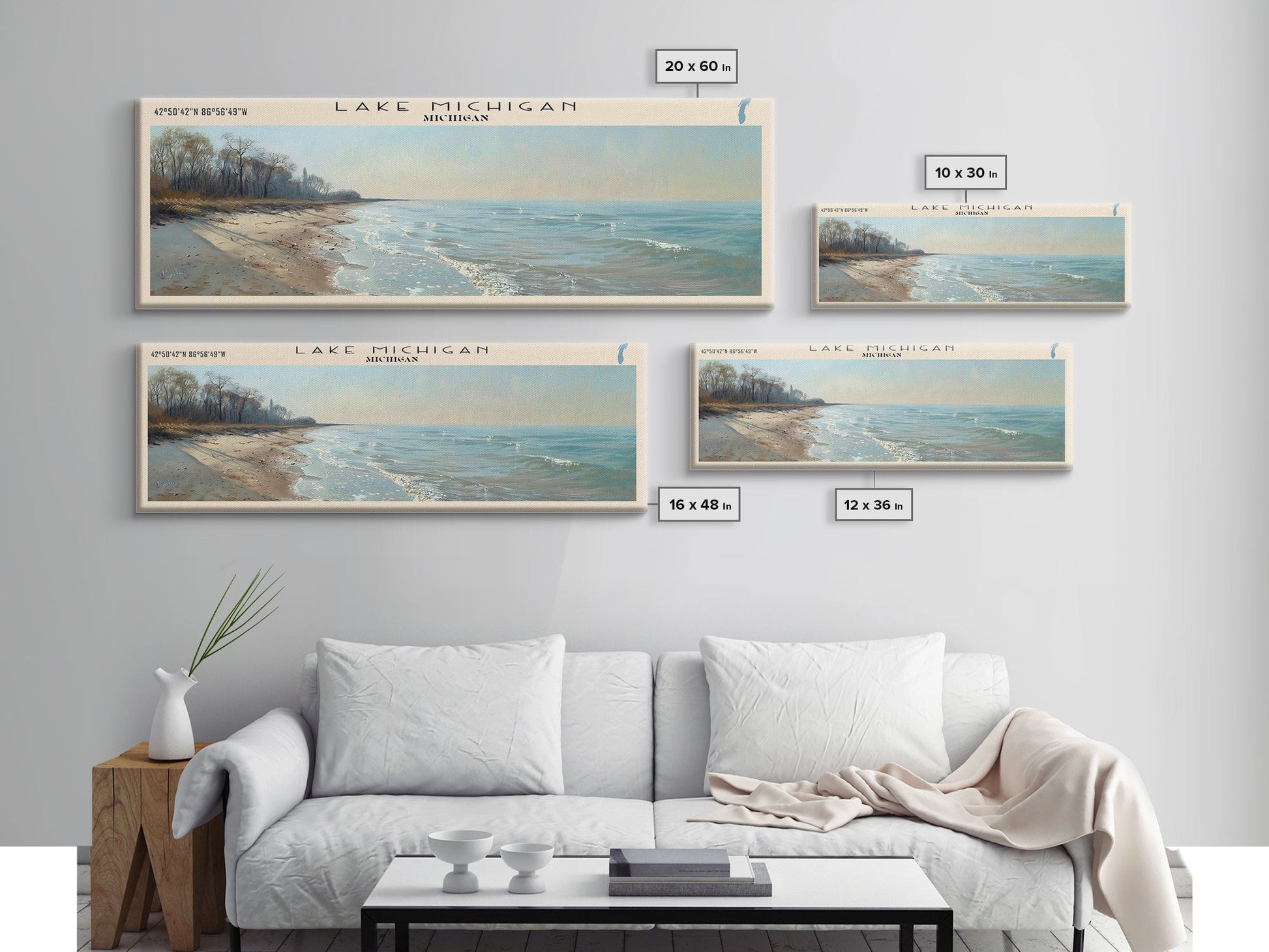 Lake Michigan Framed Canvas Print, Lake House Decor, Panoramic Wall Art, Travel Poster, Beautiful Landscape Painting, Bedroom Decor