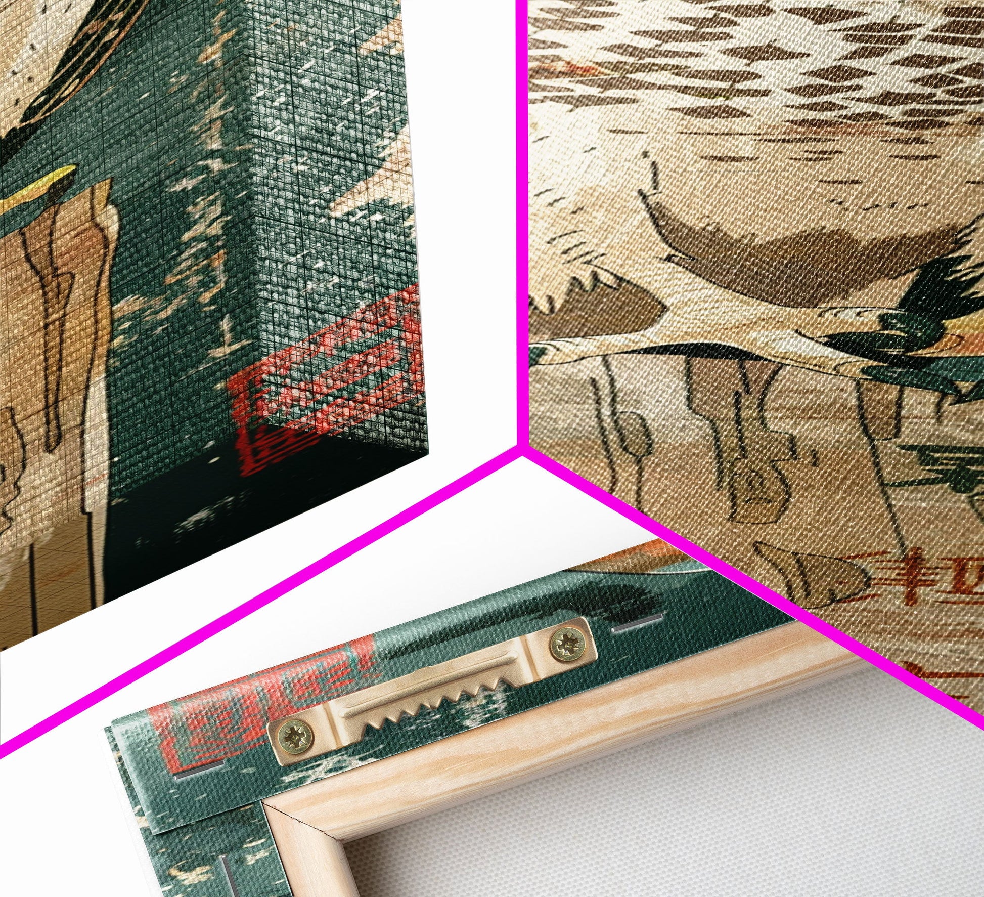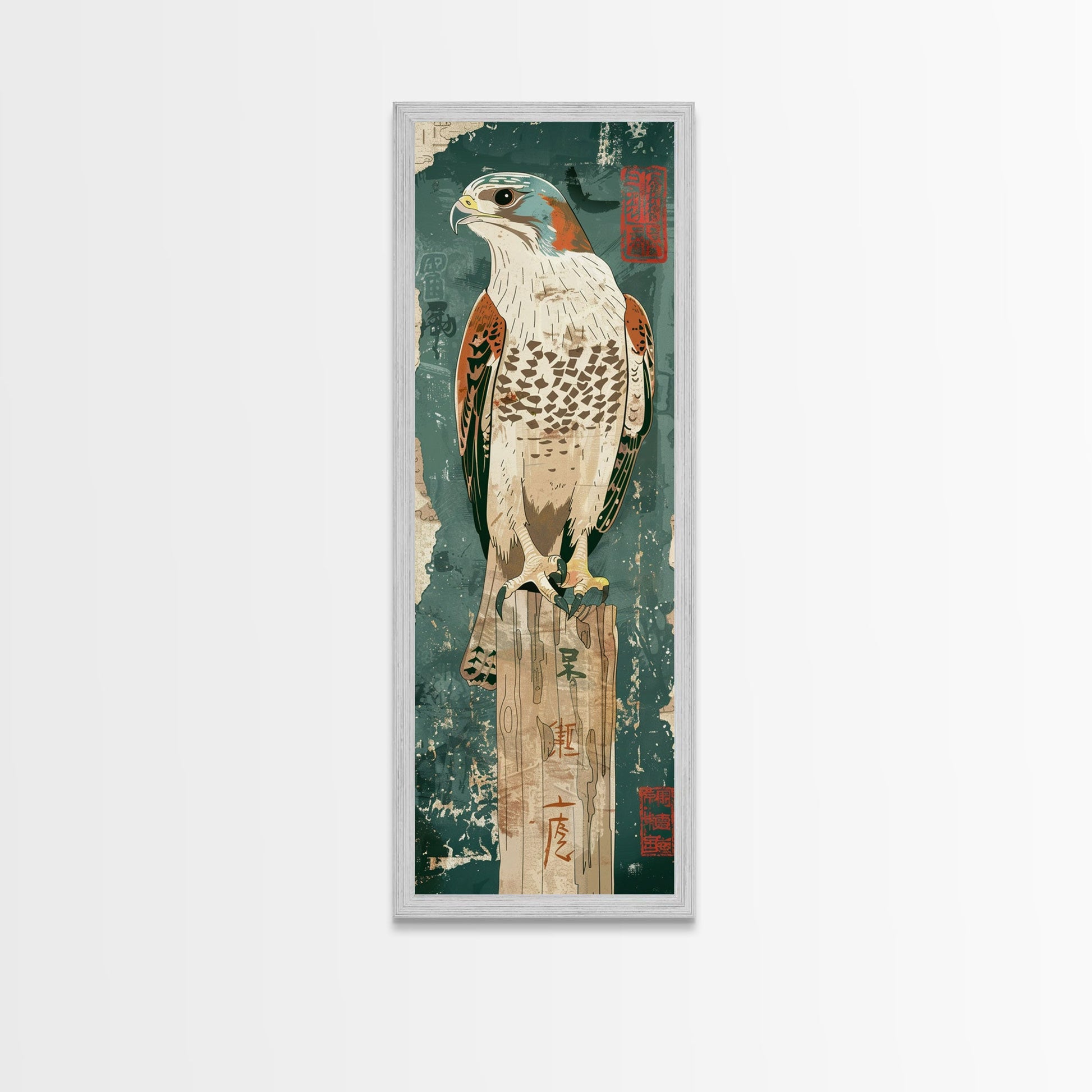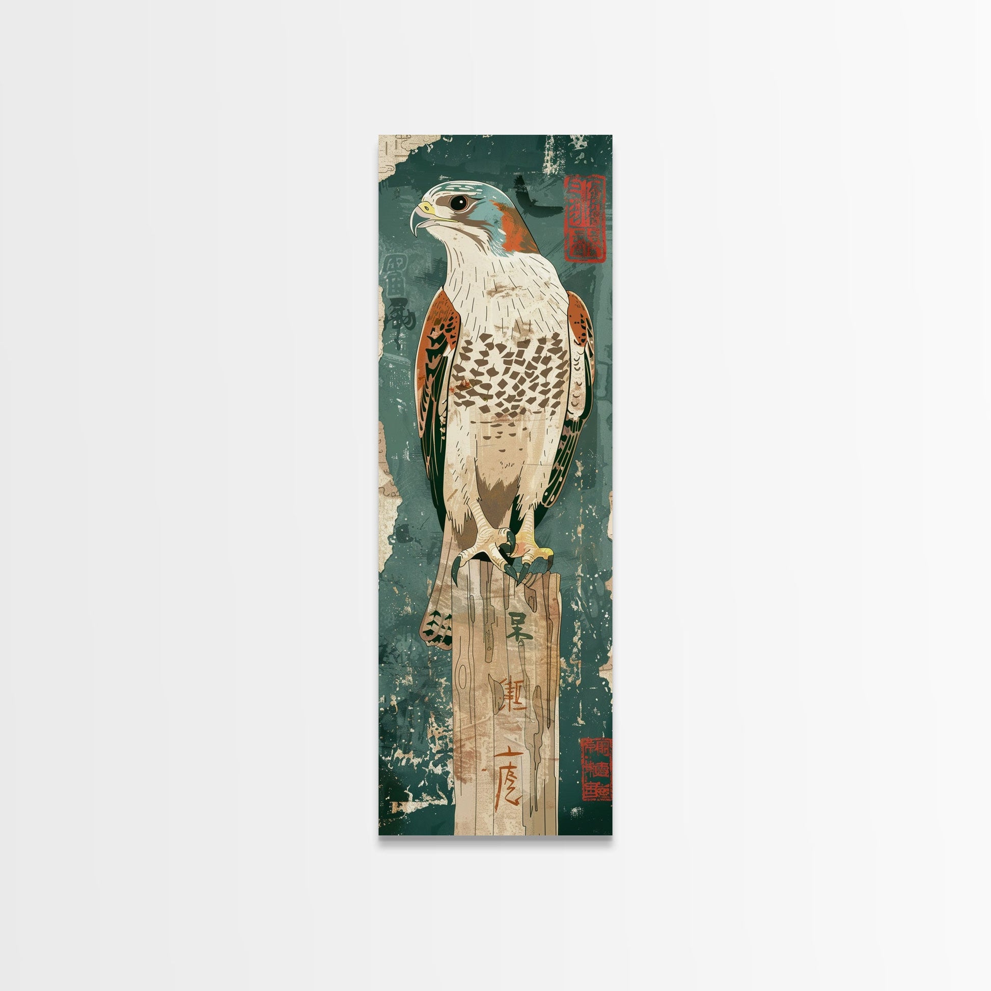 Majestic Hawk Perched On Weathered Stump Textured Background Skinny Art Tall Art Framed Canvas Print Japanese Style Art Ukiyo-e Art Wood Block Print