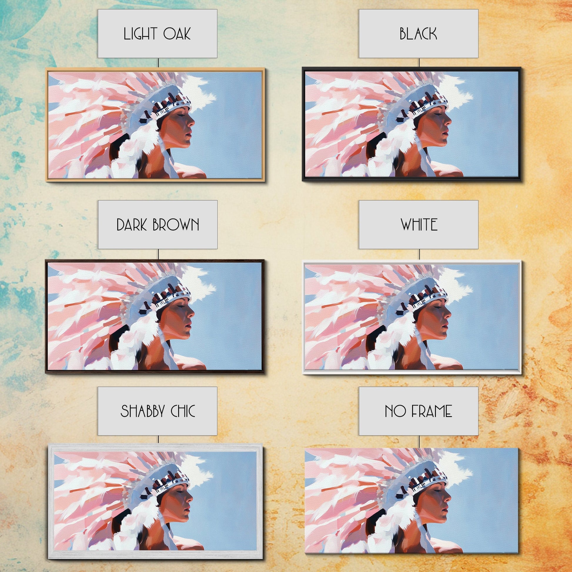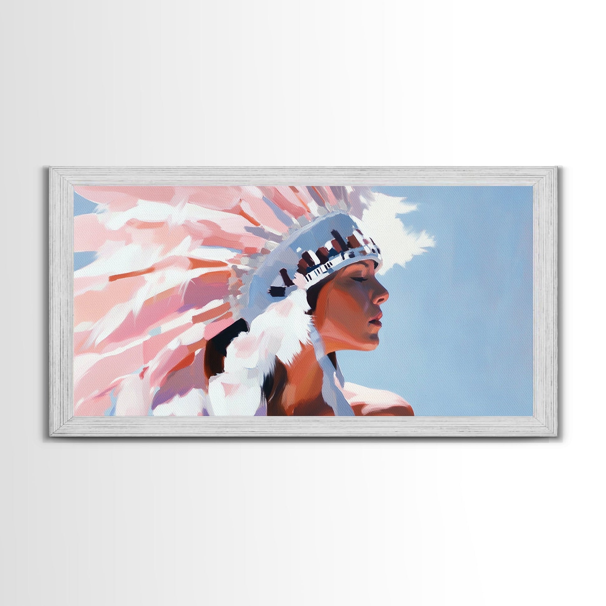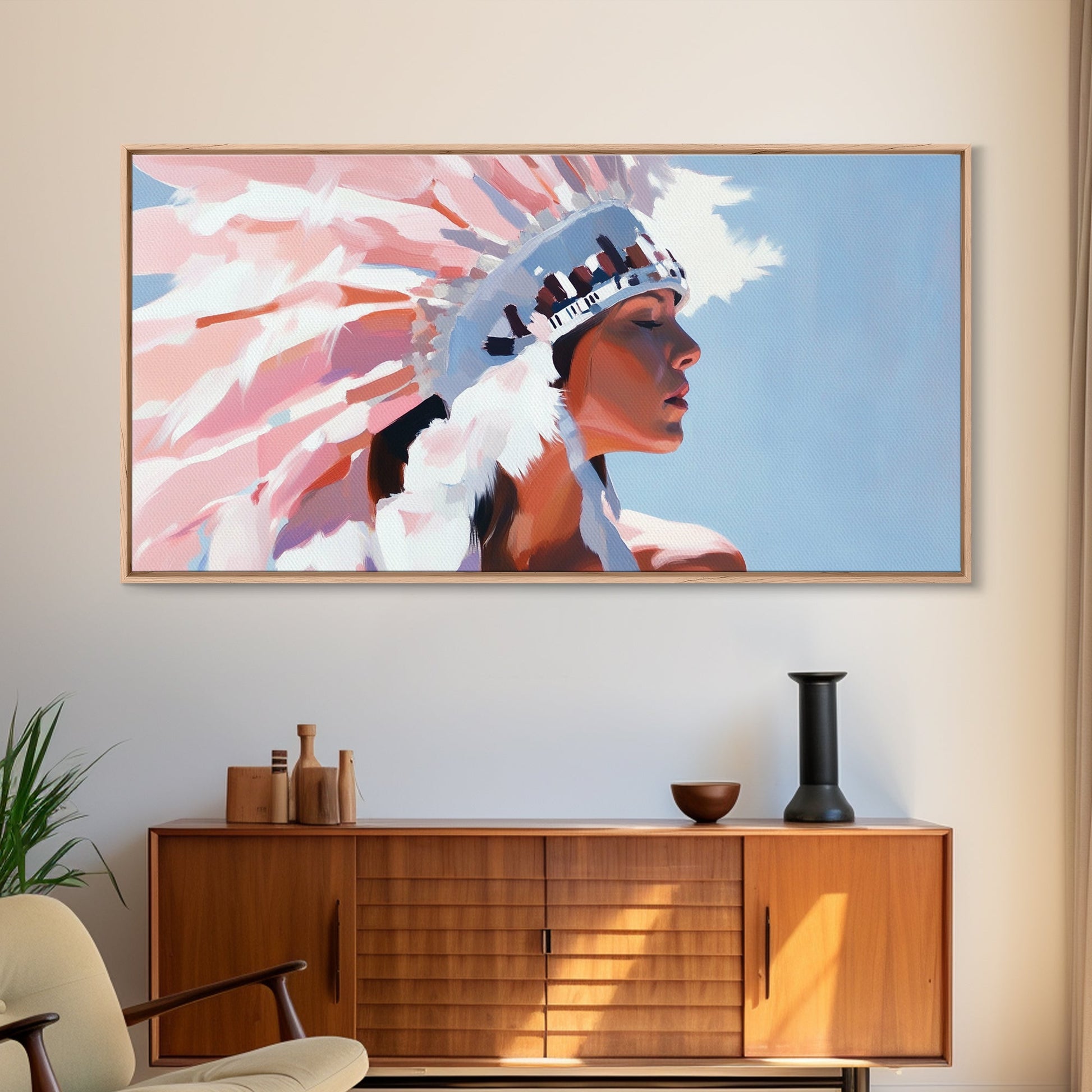 Native American Art, Woman in Headdress, Southwest Wall Art, Cultural Portrait, Framed Canvas Print, Extra Wide Art, Rustic Decor