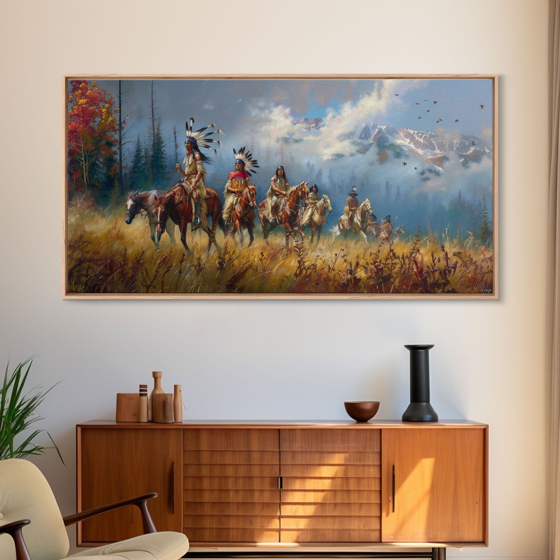Native American Warriors on Horseback in Autumn Forest, Perfect Wall Art, Framed Canvas Print Living Room or Bedroom Decor, Historical Art