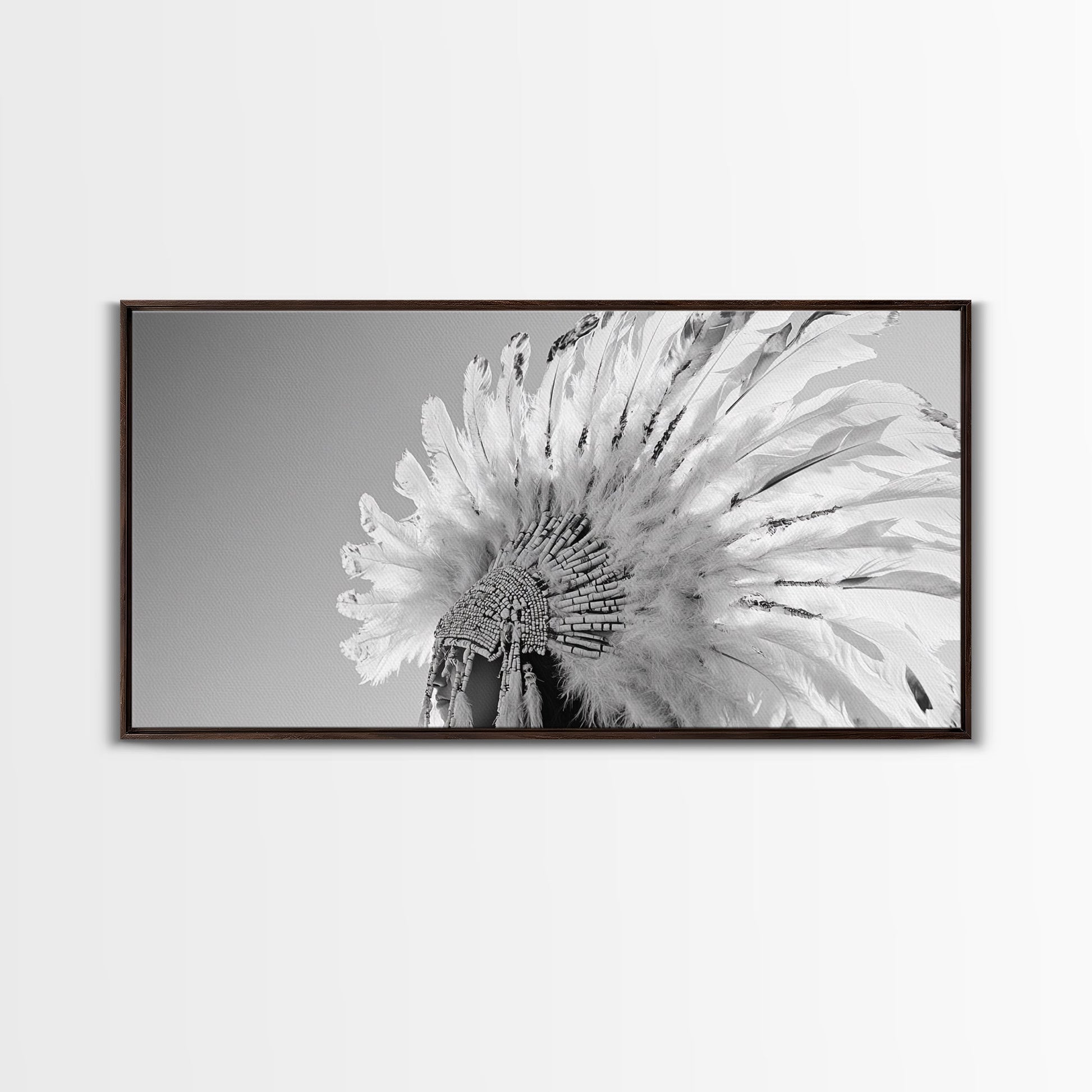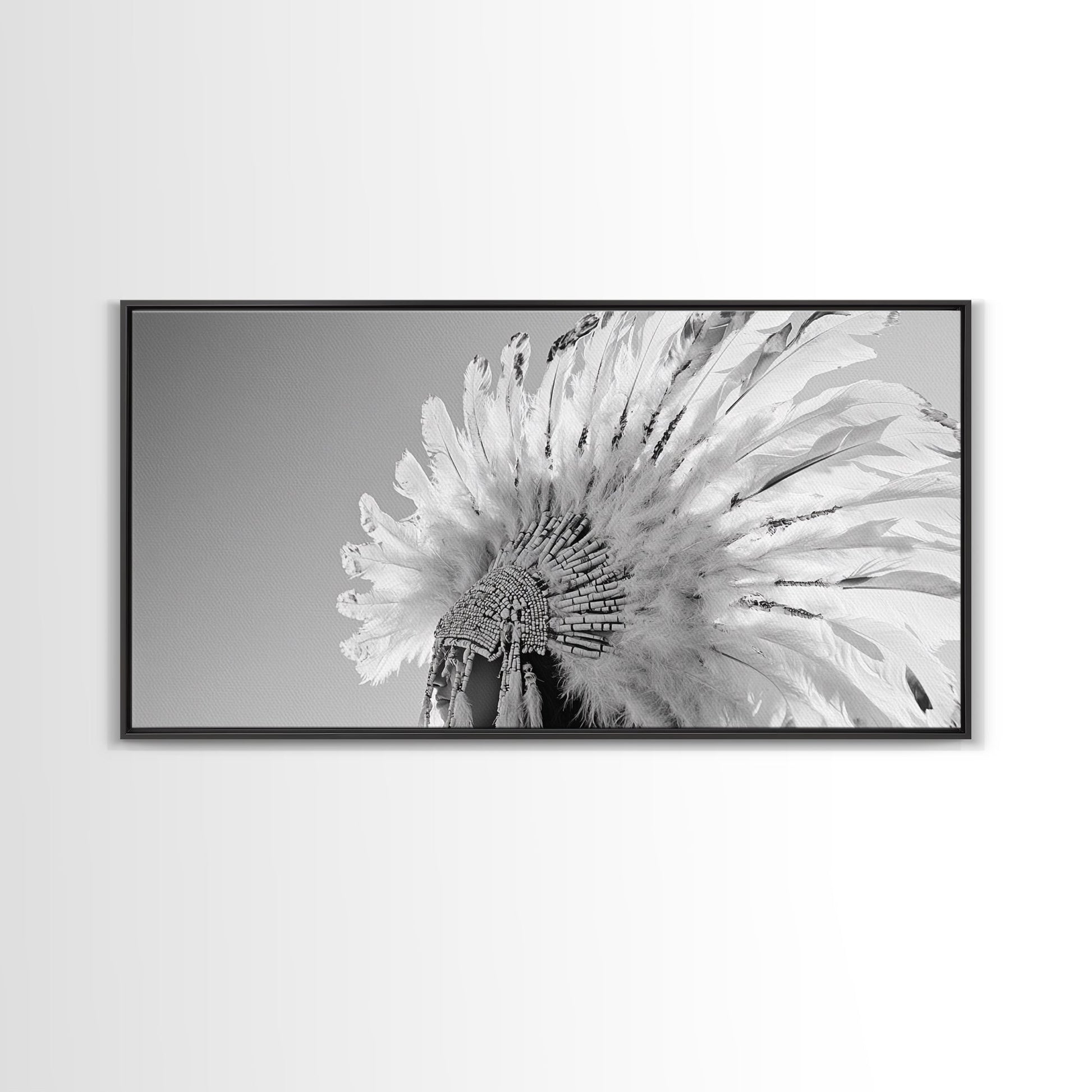 Native Headdress, Feather Crown, Cultural Tribute, Canvas Print, Boho Tribal Decor, Bedroom Wall Art, Monochrome Indigenous Style