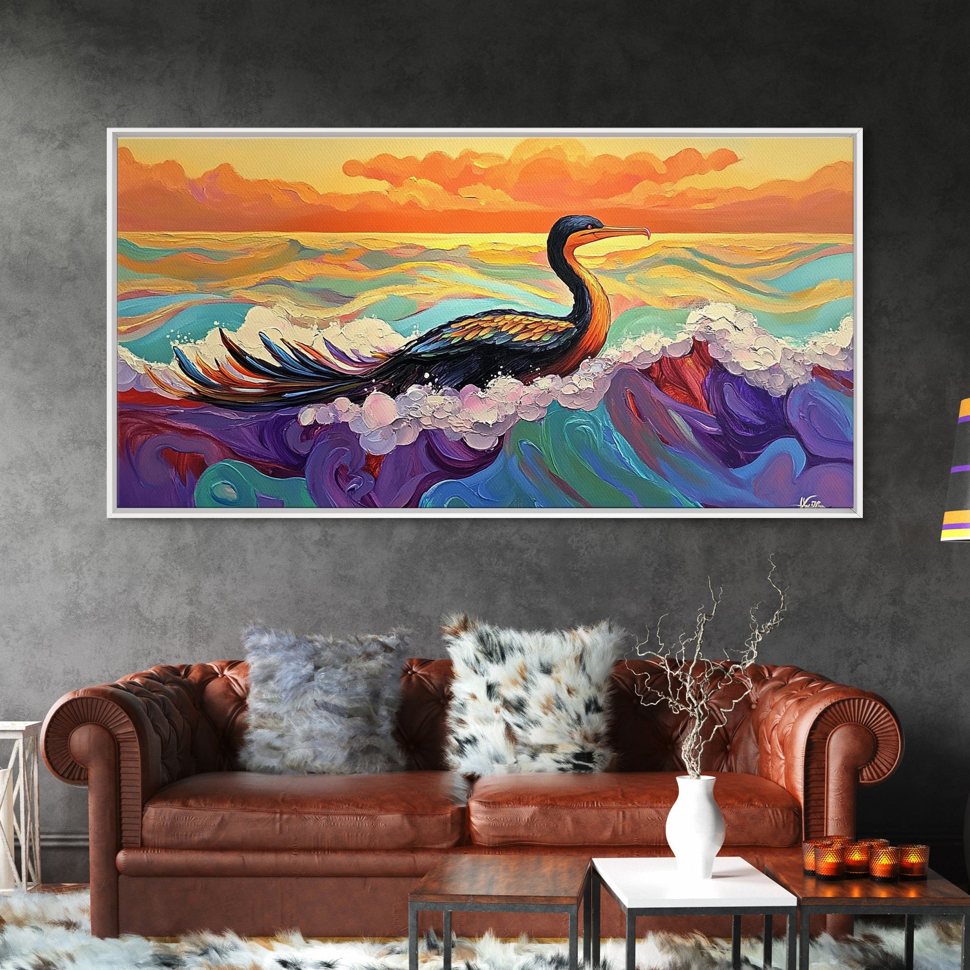 Ocean Bird, Sunset, Framed Canvas Print, Vibrant seabird in waves sunset seascape painting, Colorful Coastal Decor, Bathroom Wall Art