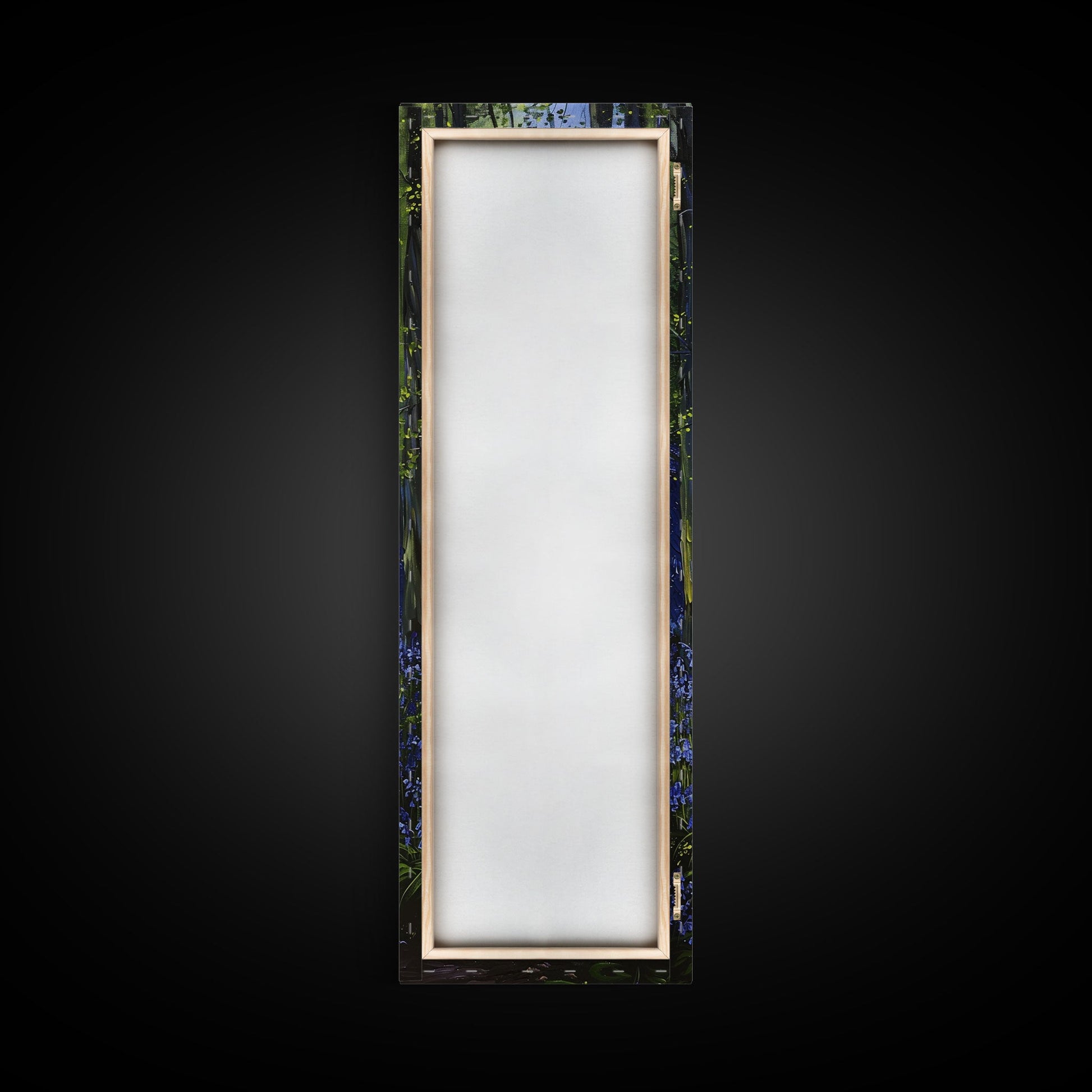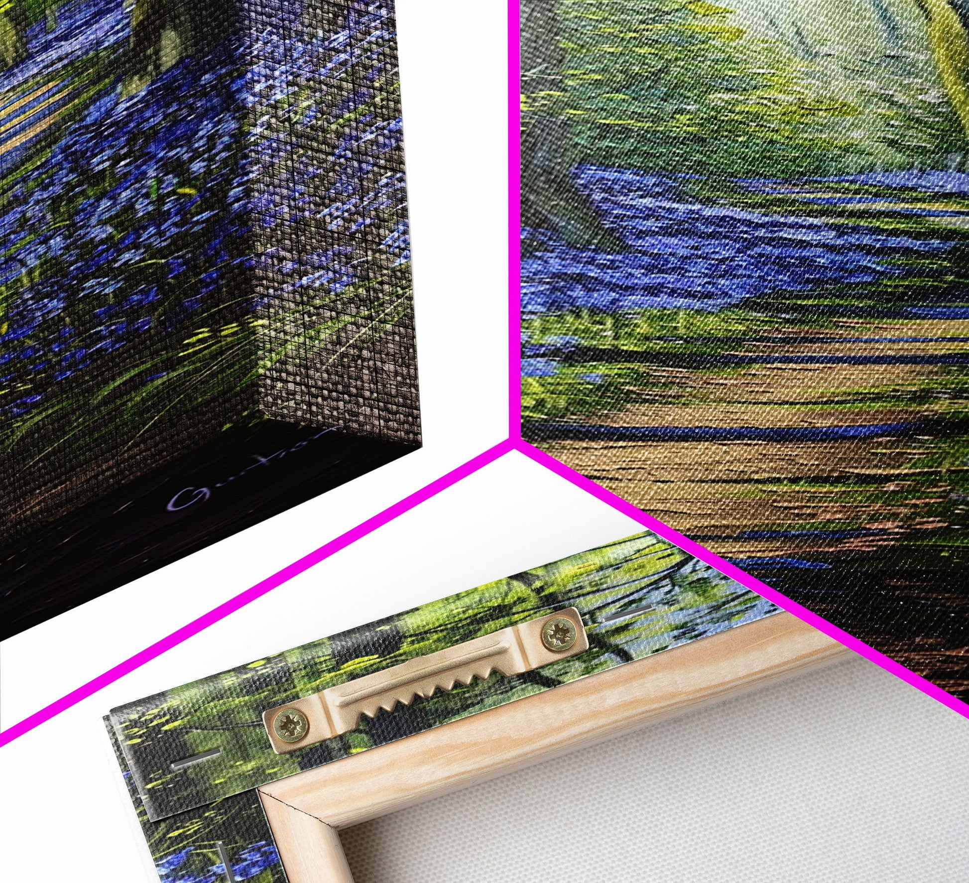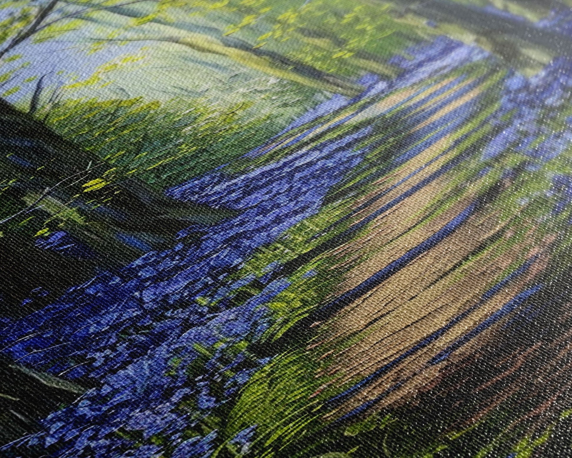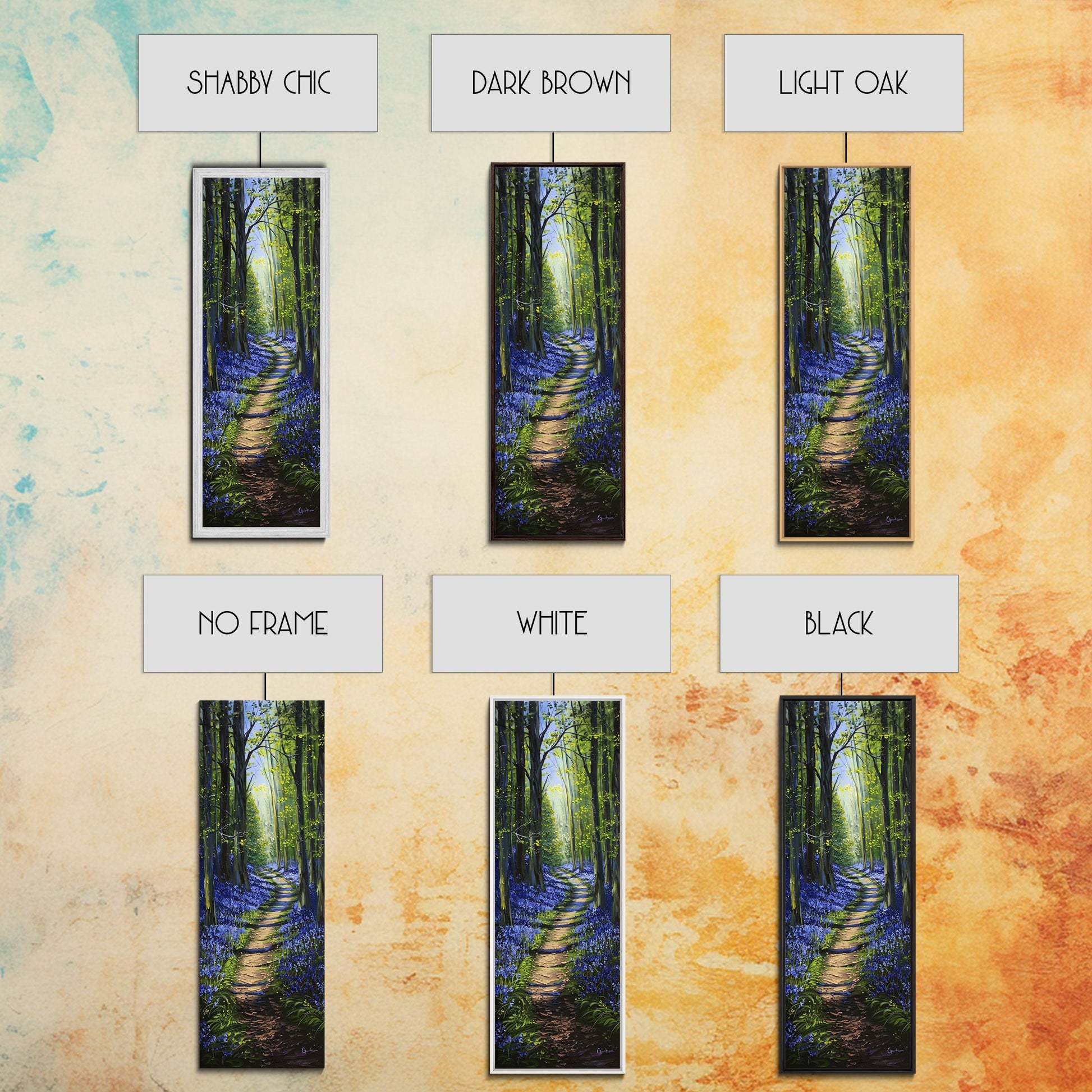 Pathway Through Enchanting Bluebell Woods in Tall Skinny Art Framed Canvas Print for Peaceful Wall Decor and Interior Design