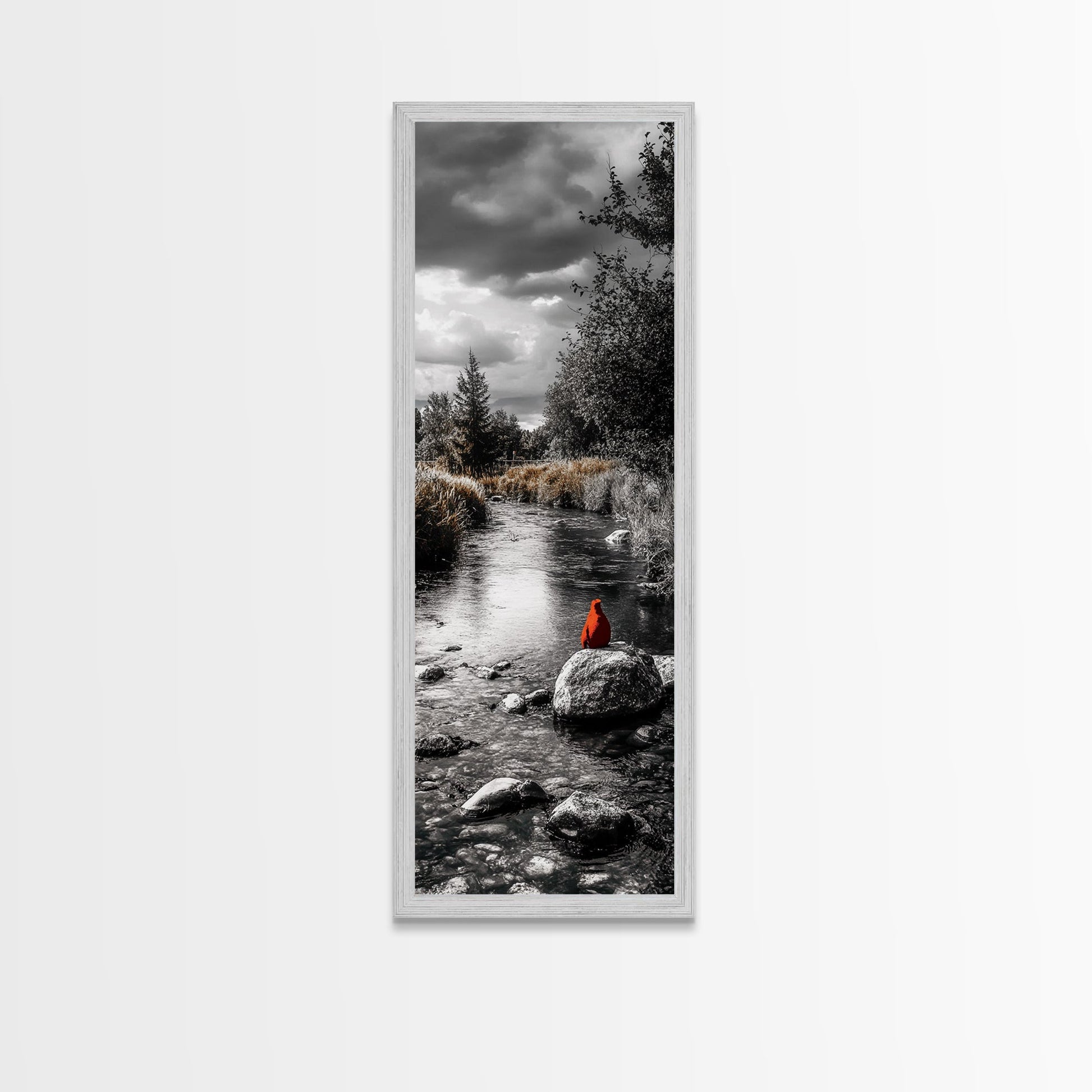 Red Cardinal, River Print, Nature Wildlife Art, Peaceful Landscape, Canvas Print, Rustic Living Room Decor, Autumn Wall Art, Forest Bird