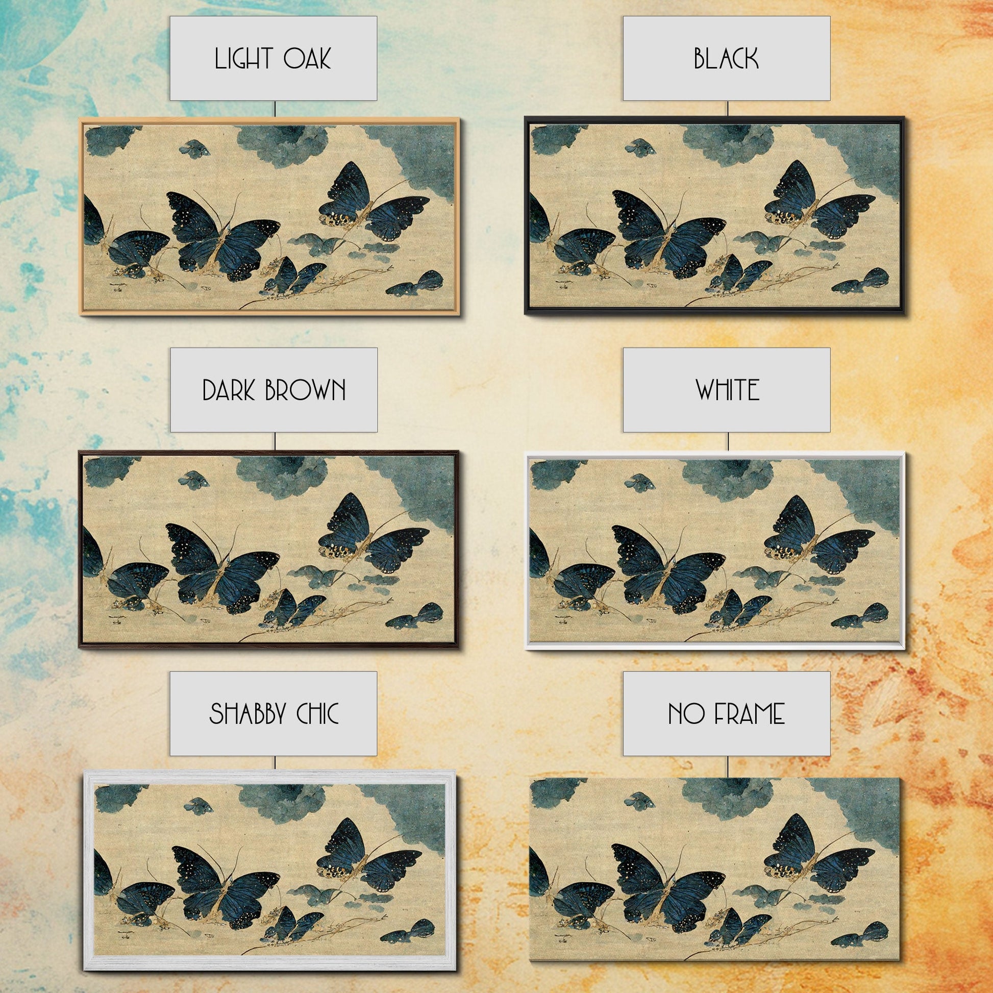 Retro Japanese Style Butterflies Wall Art, Framed Canvas Print, Framed Wall Art, Blue butterfly Art