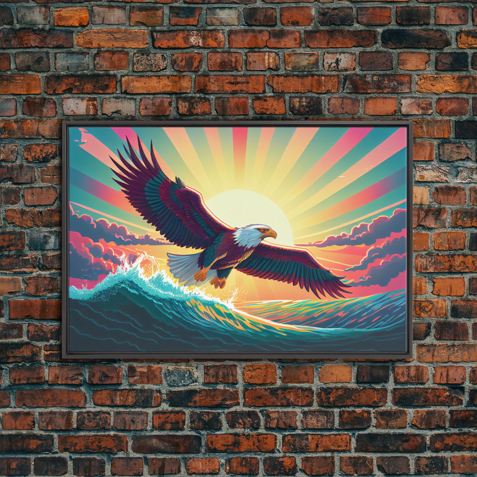 Retrowave bald eagle, pastel sunset, framed canvas print