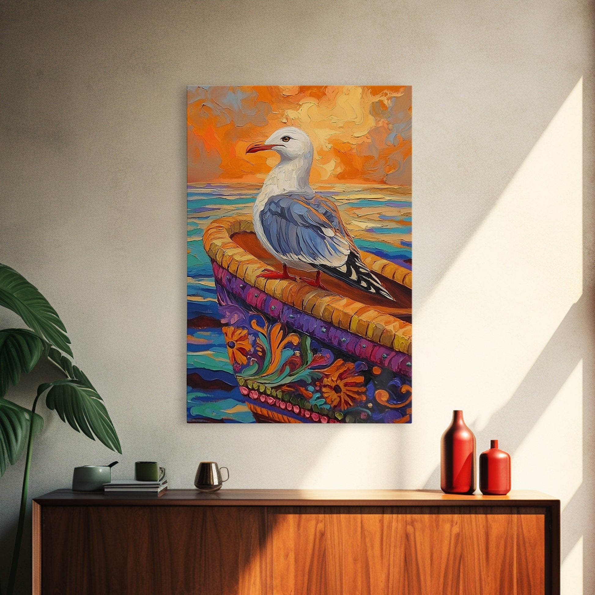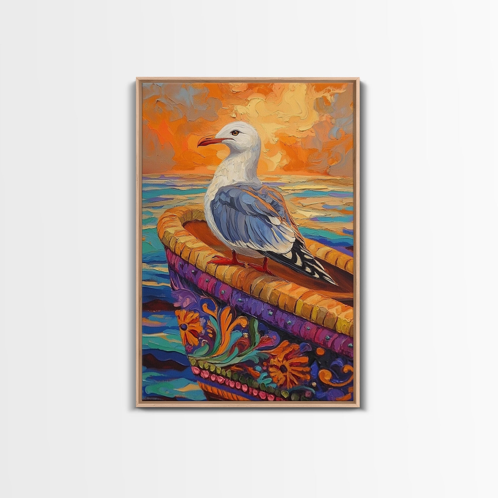 Seagull View, Coastal Bird, Sunset Sky, Ocean Perch, Framed Canvas Print, nautical bird art, hallway wall decor, seagull boho art