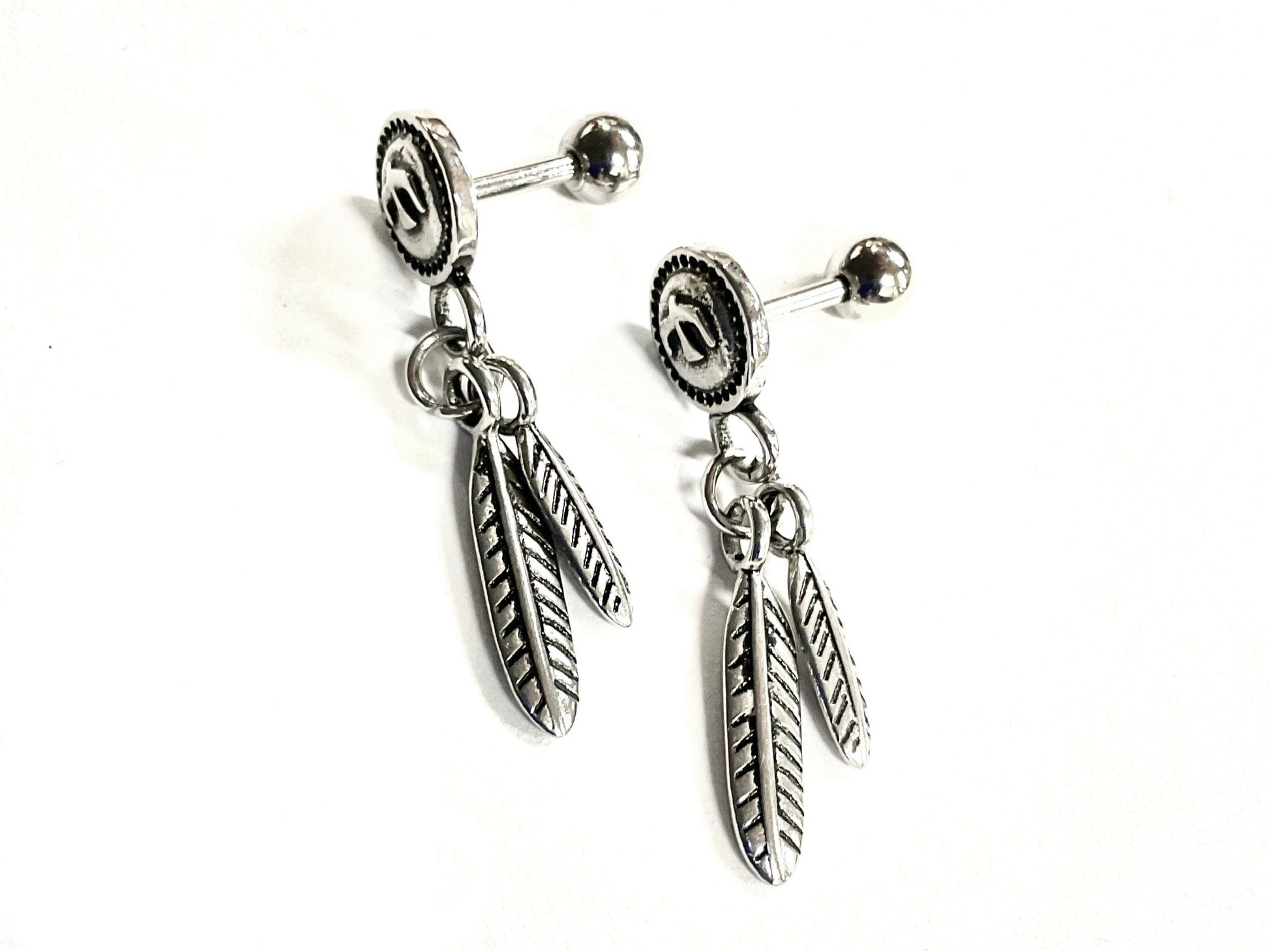Get ready to elevate your style and showcase with these all silver Sports Screw Back Double Feather and Eagle Post Earrings. Expertly crafted with hypoallergenic stainless steel and designed to stay securely in place with screw back posts. The unique front pattern with deep struck antiqued accents give a touch of authenticity. Measuring 1 1/2" long and 1/4" wide, go wild with this awe-inspiring design. Order now!