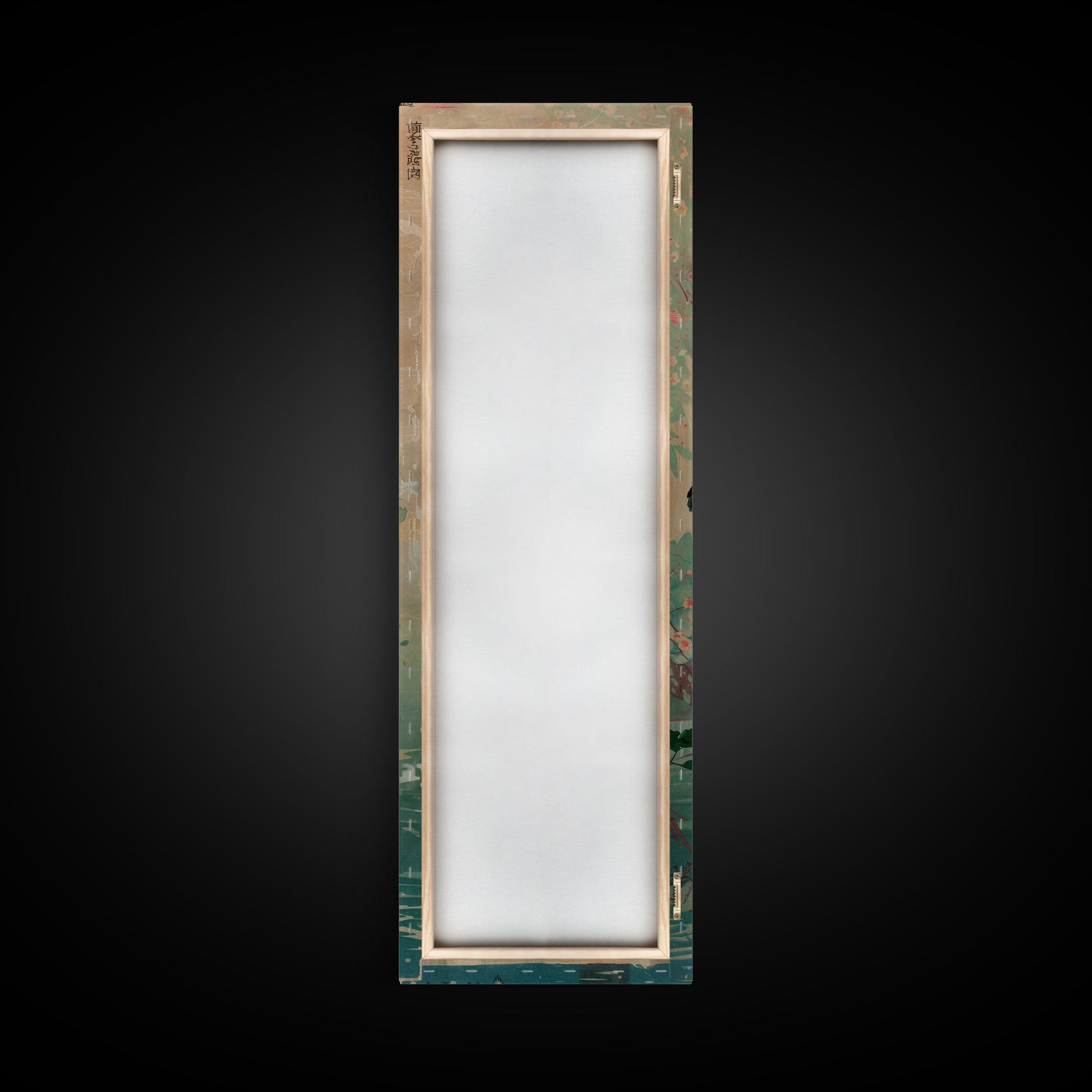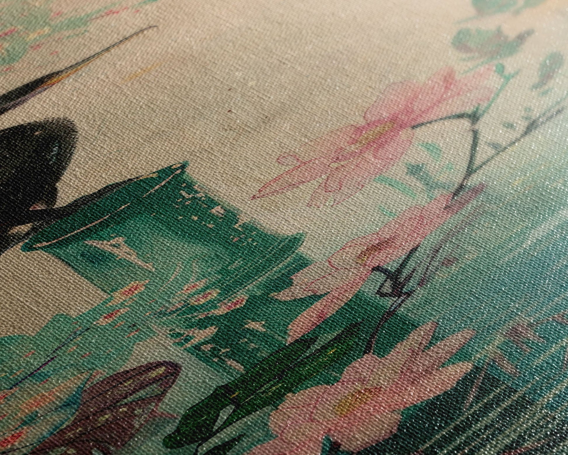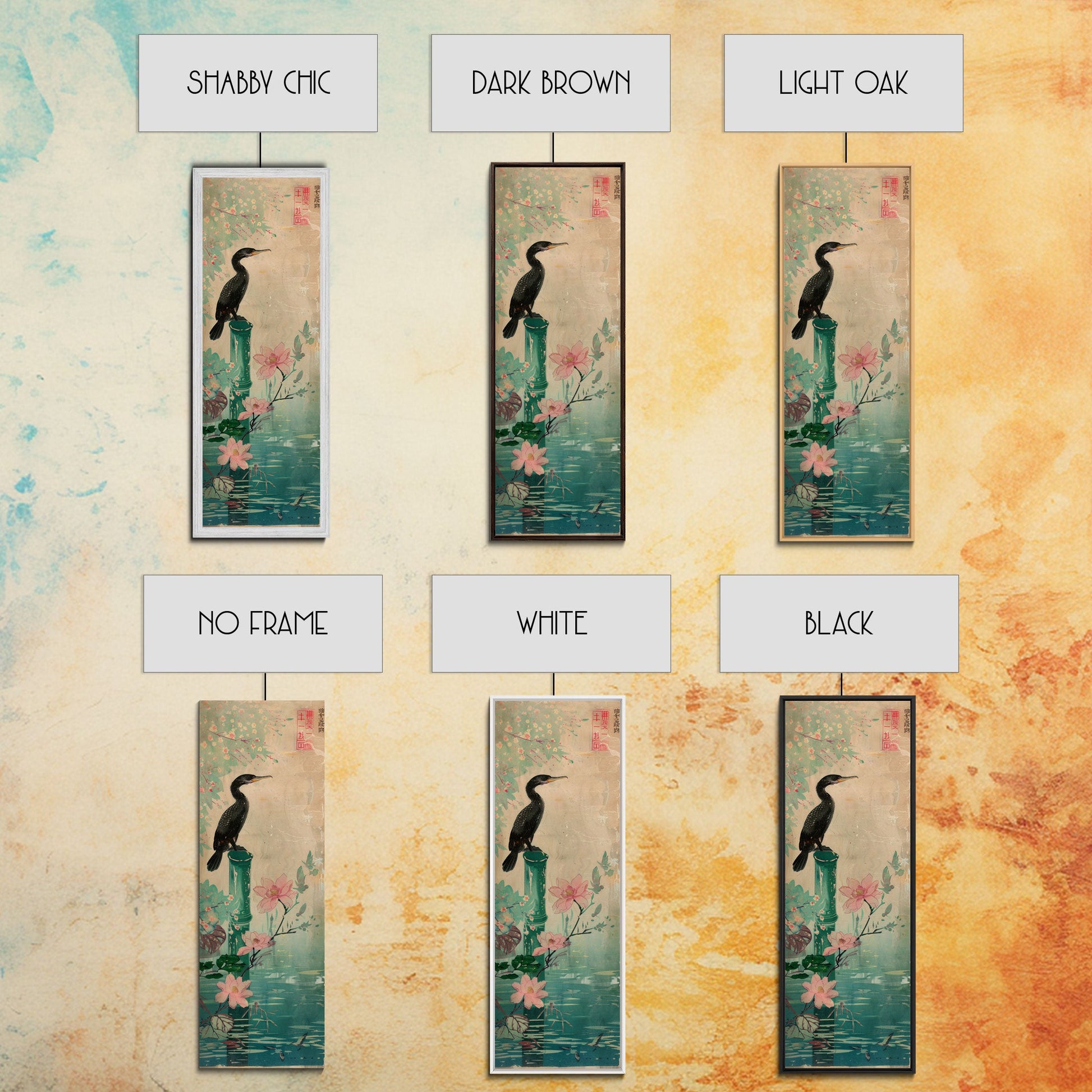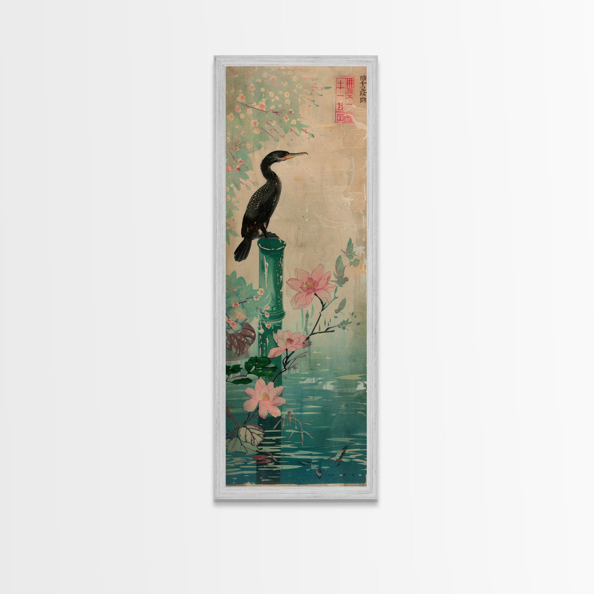 Tall Skinny Art Japanese Style Wood Block Print Bird Perched On Bamboo By A Pond With Flowers In Ukiyo-e Style For Framed Canvas Print