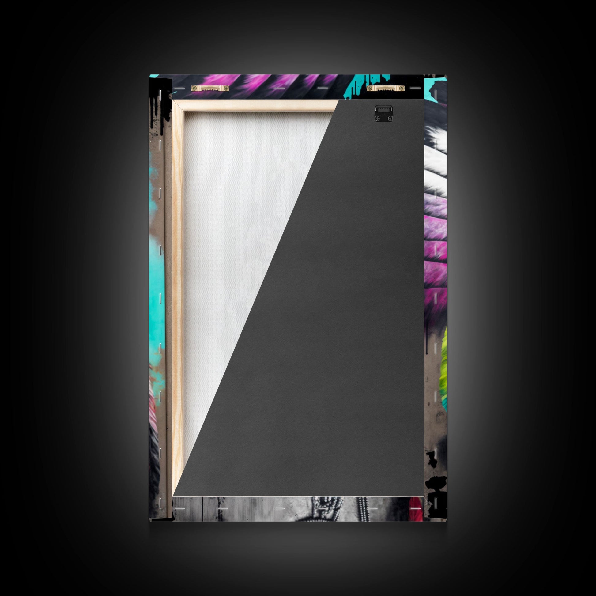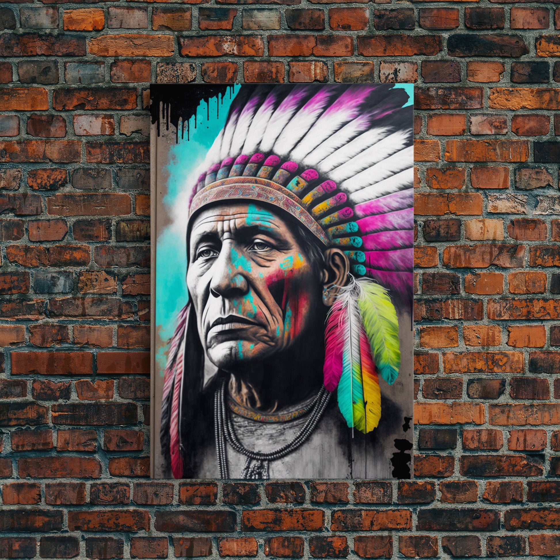 The Warrior, Native American Chief, Graffiti Art Portrait, Framed Canvas Print, Rainbow Feather Mohawk, Pop Art Portrait