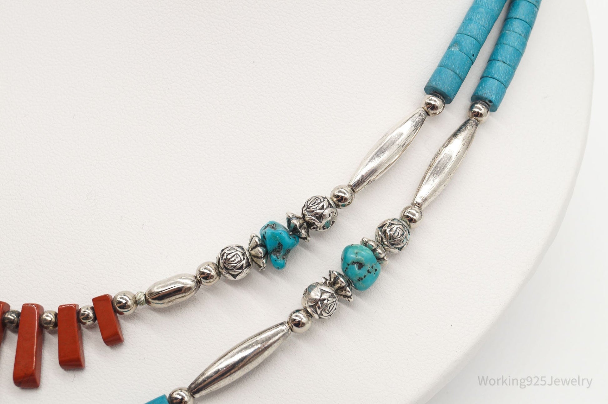 Vintage Native American Red Jasper Blue Turquoise Silver Bead Necklace 24"