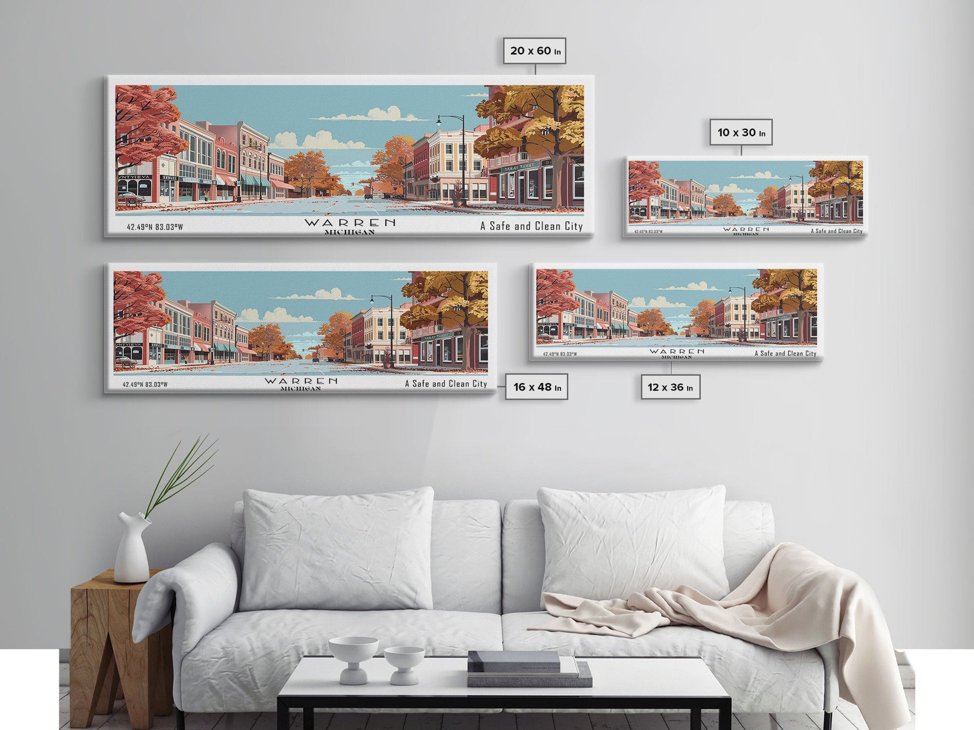 Warren Michigan Panoramic Painting, Mid Century Modern Framed Canvas Print, Retro Pop Art Travel Poster, Office Wall Art, Home Decoration