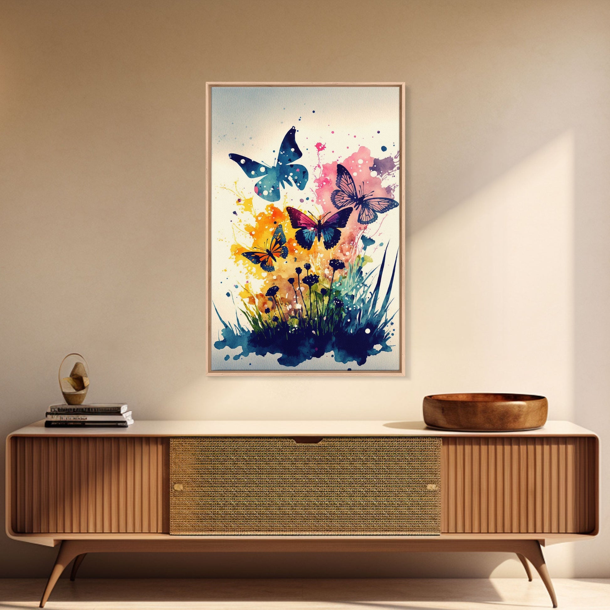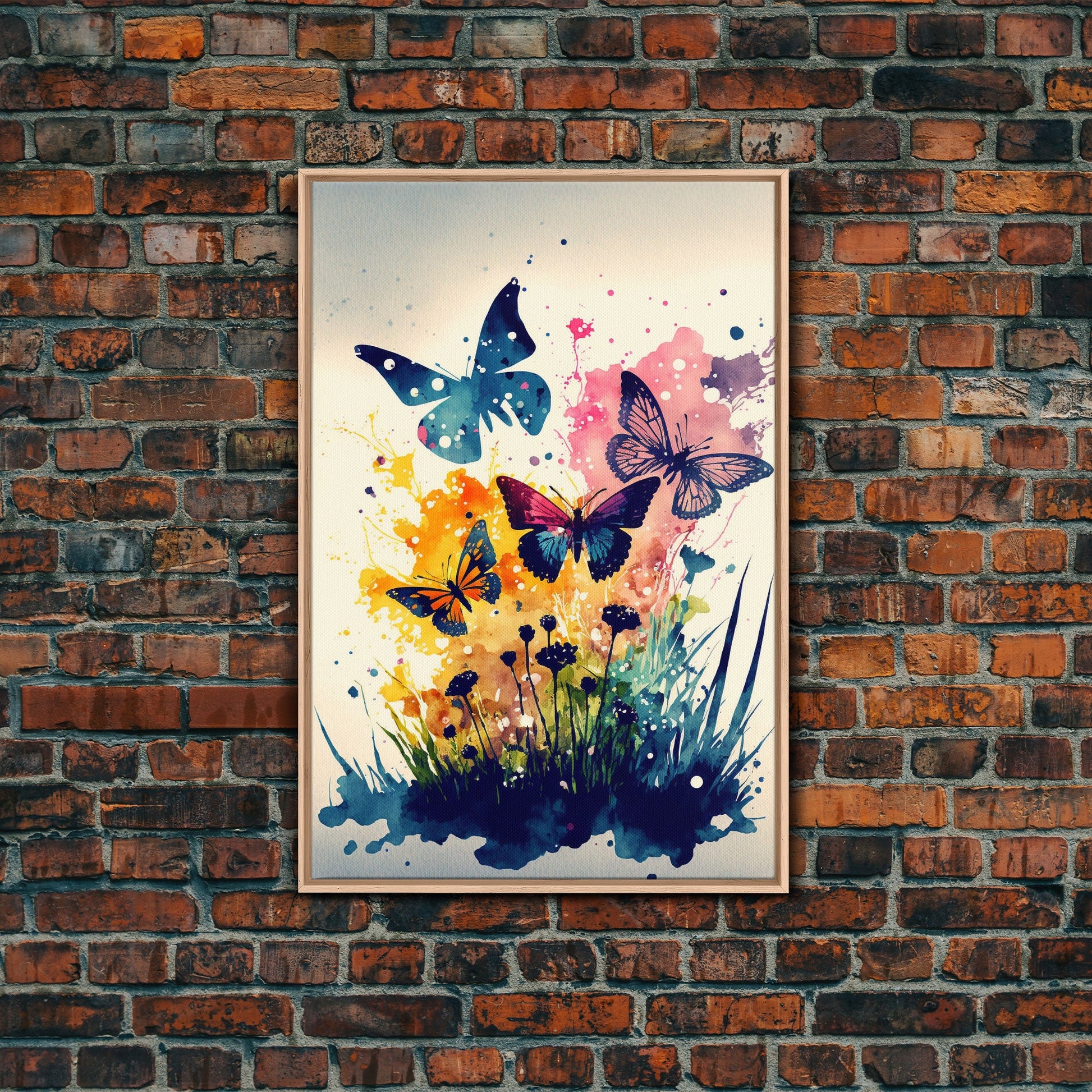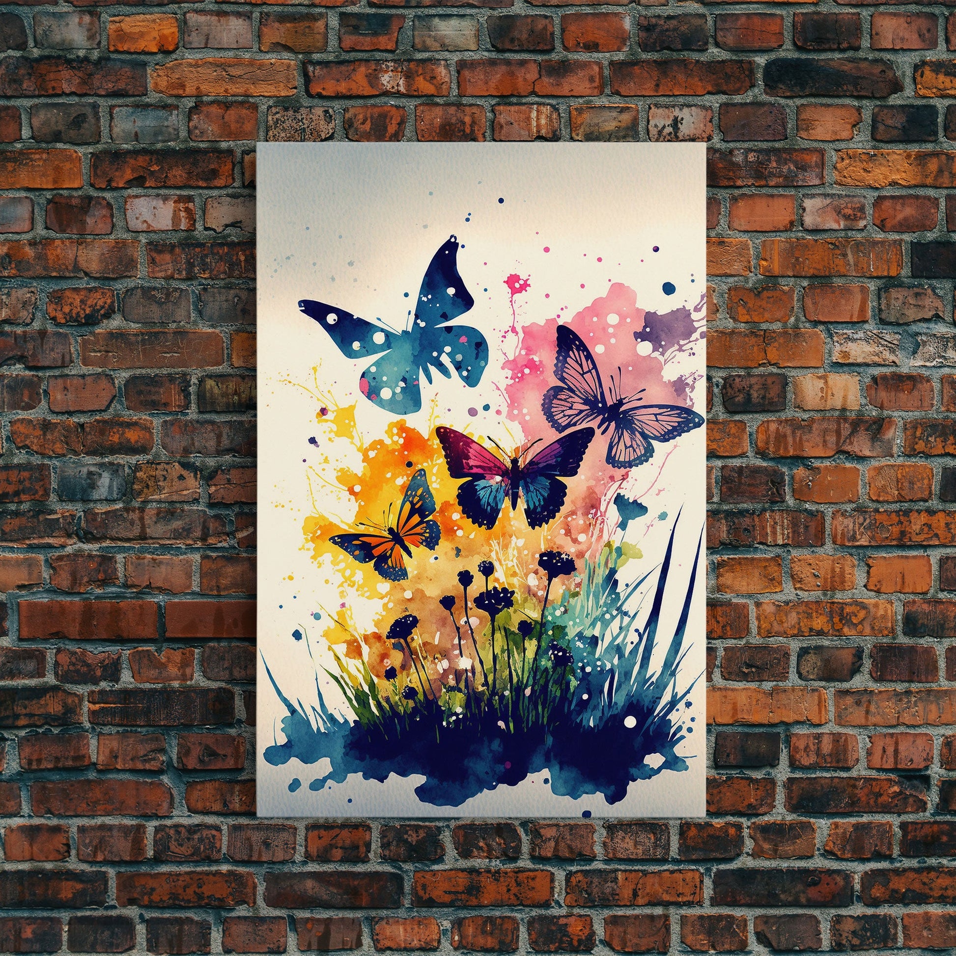 Watercolor Painting Of Butterfly and Wild Flowers, Framed Canvas Print, Colorful Living Room Wall Arrt