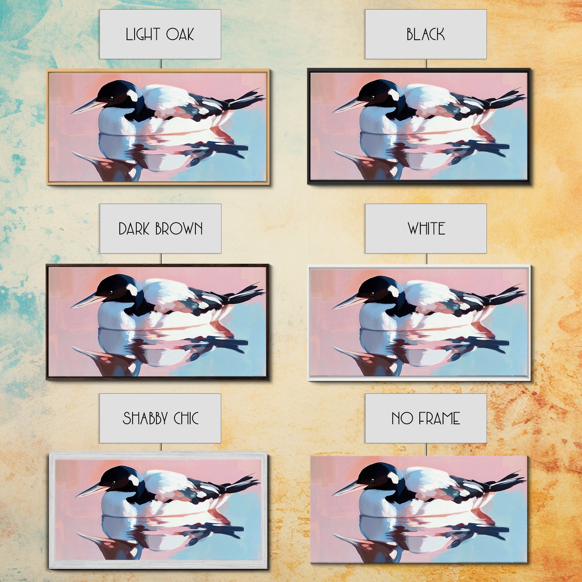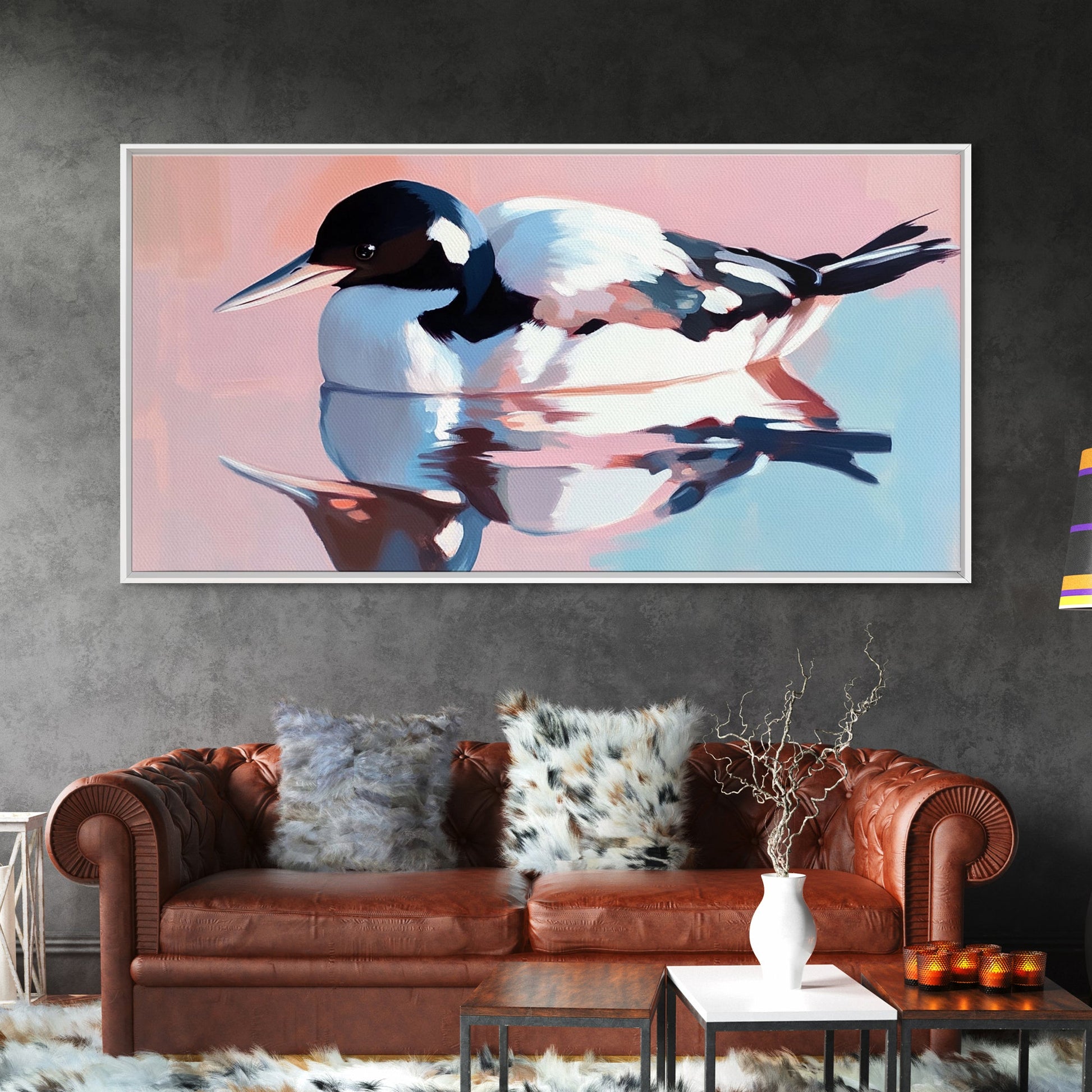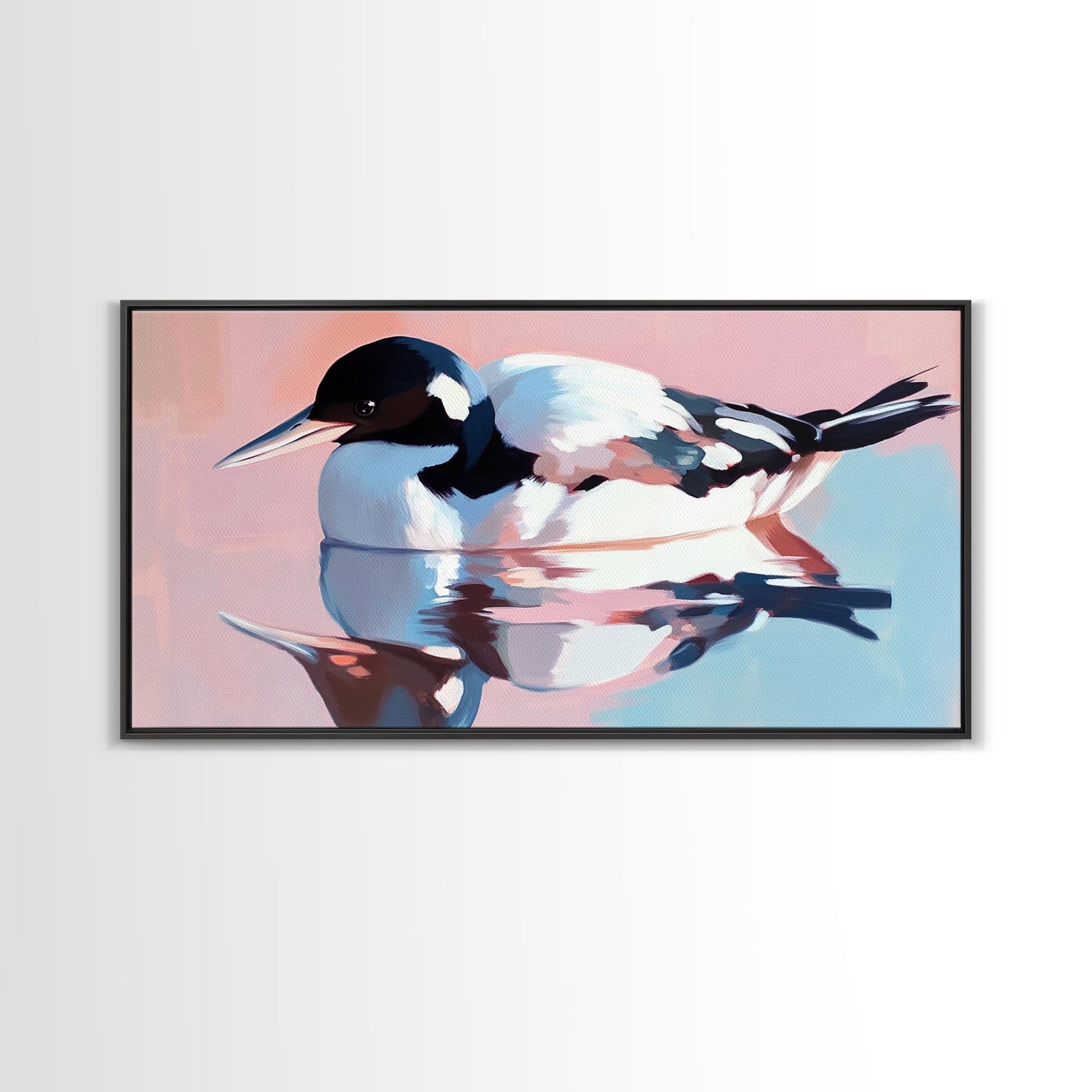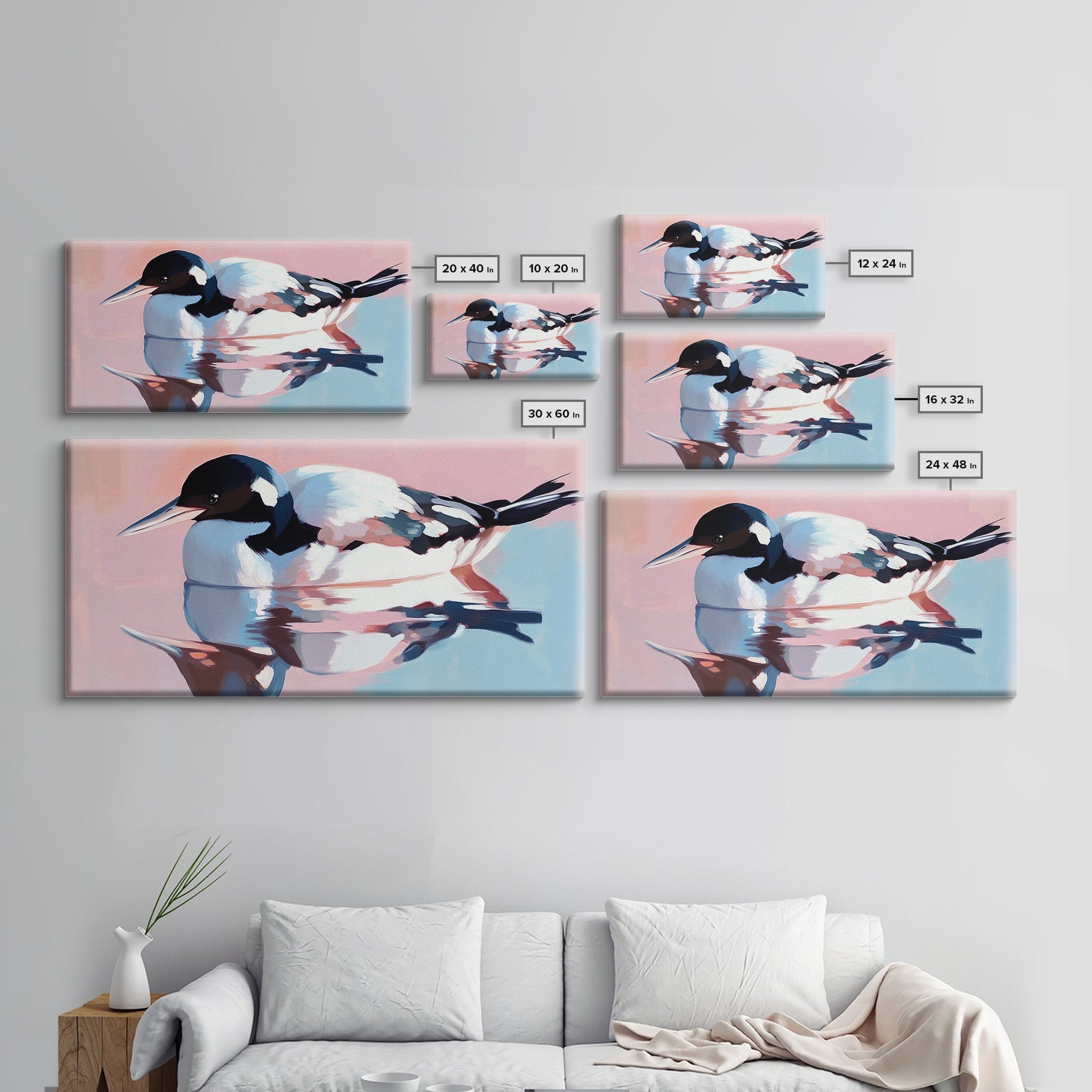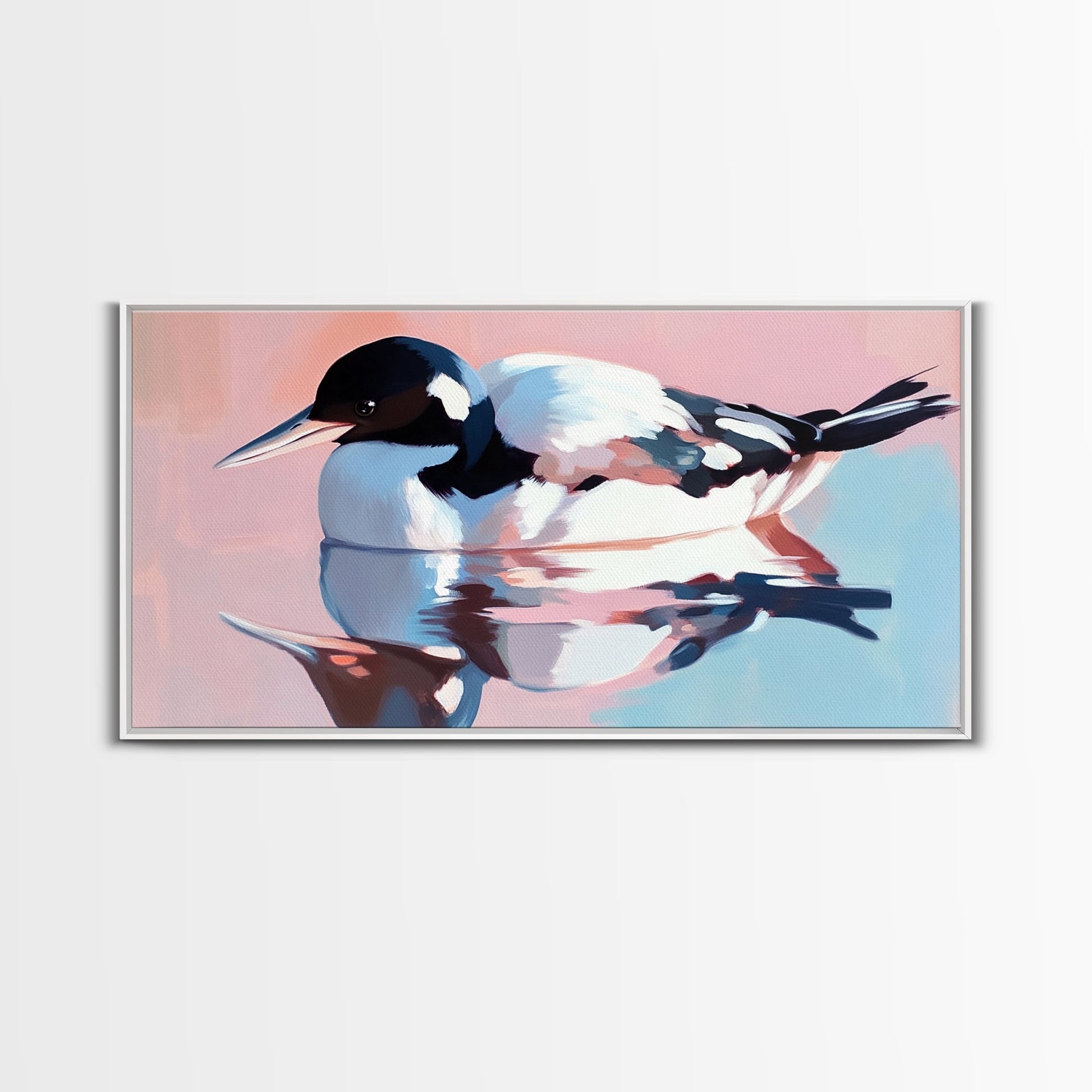 Waterfowl Reflection, bird art, lake Tahoe art, coastal painting, wildlife decor, pink orange wall art, framed canvas print