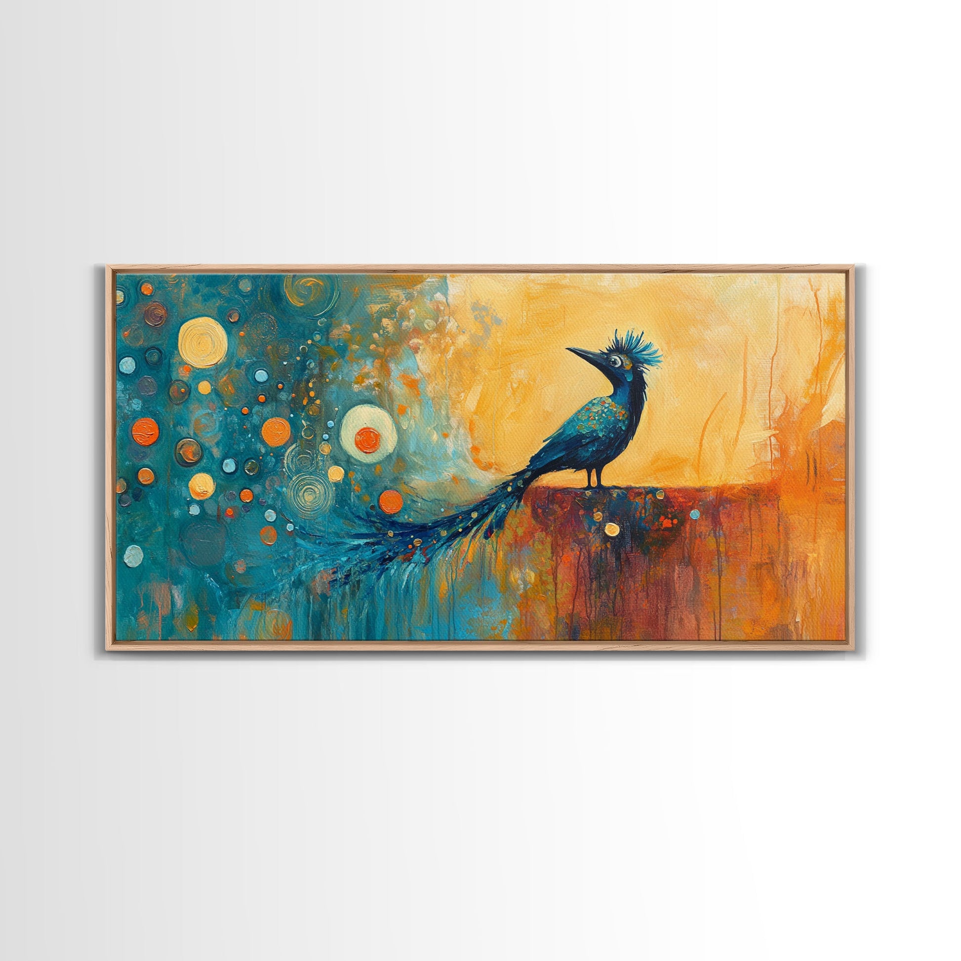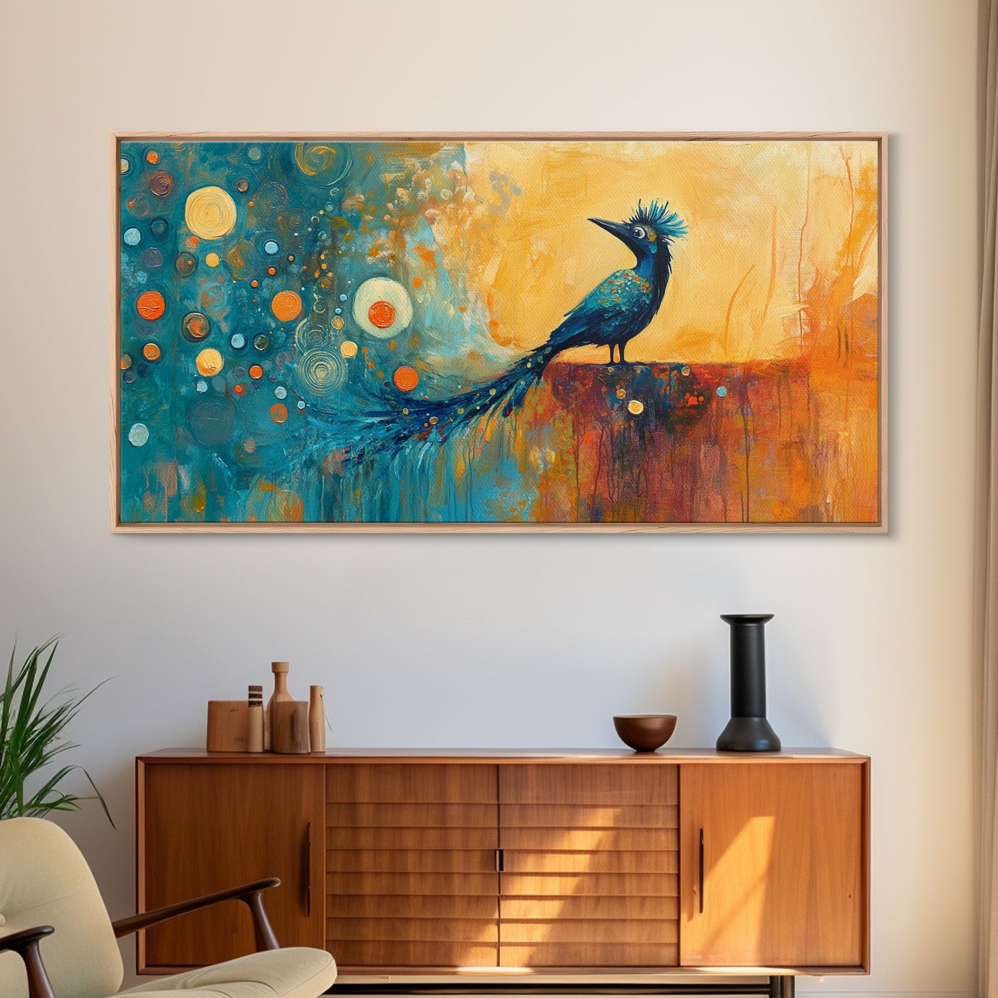 Whimsical Bird Art, Peacock Wall Art, Surreal Painting, Colorful Wall Art, Boho Art, Fantasy Art, Extra Wide Art, Framed Canvas Print