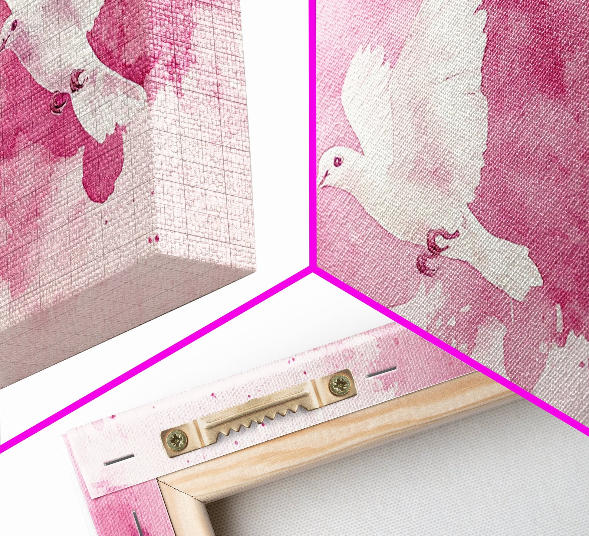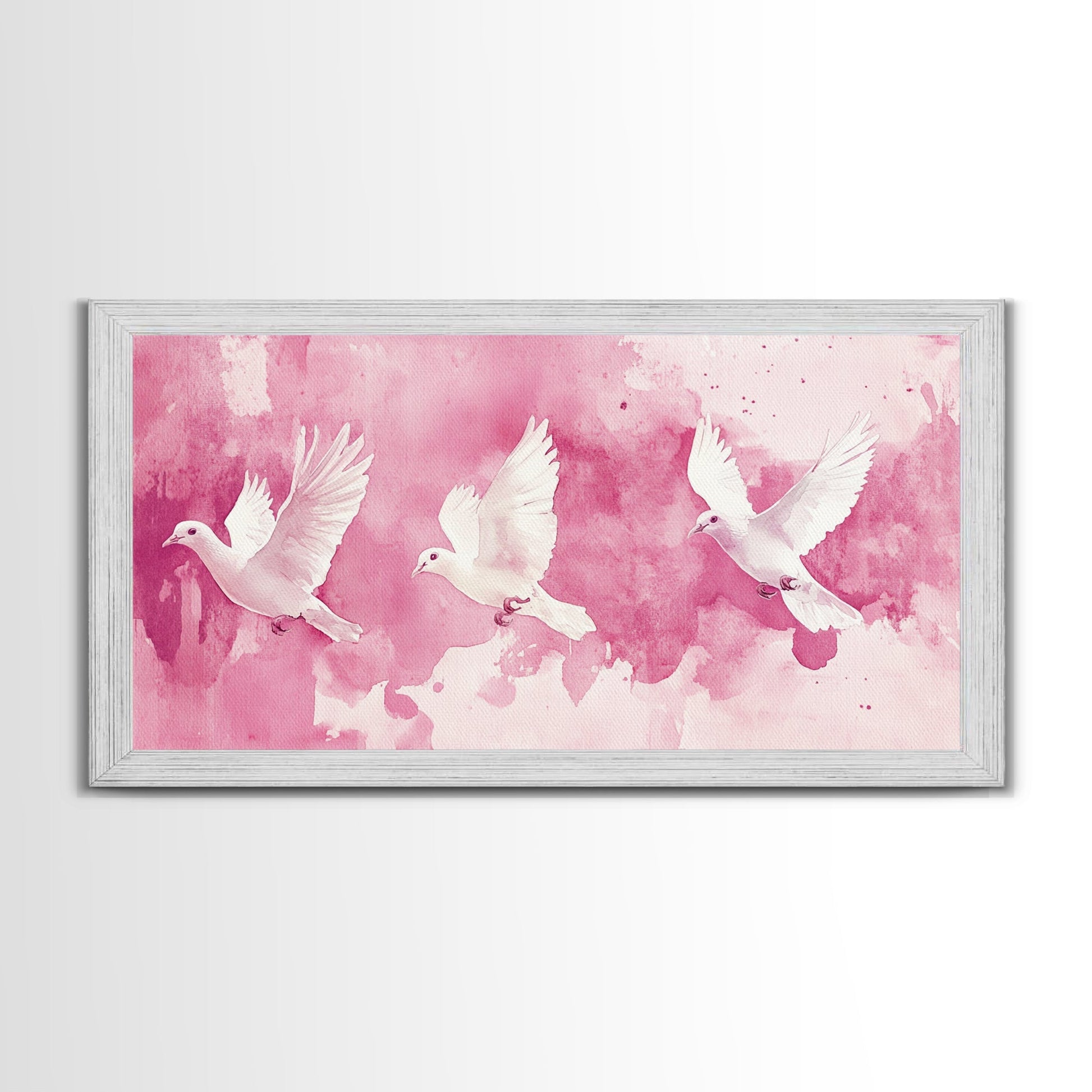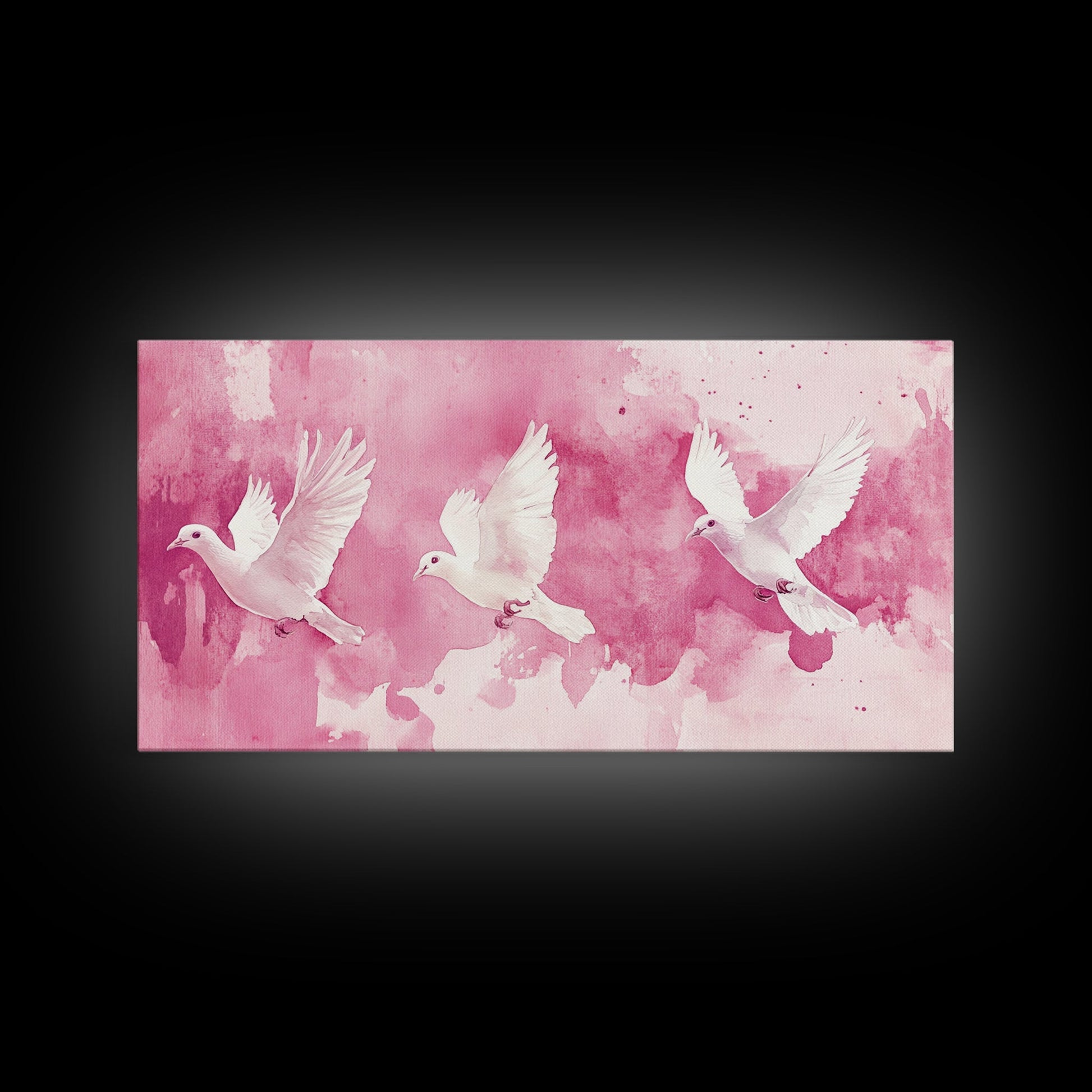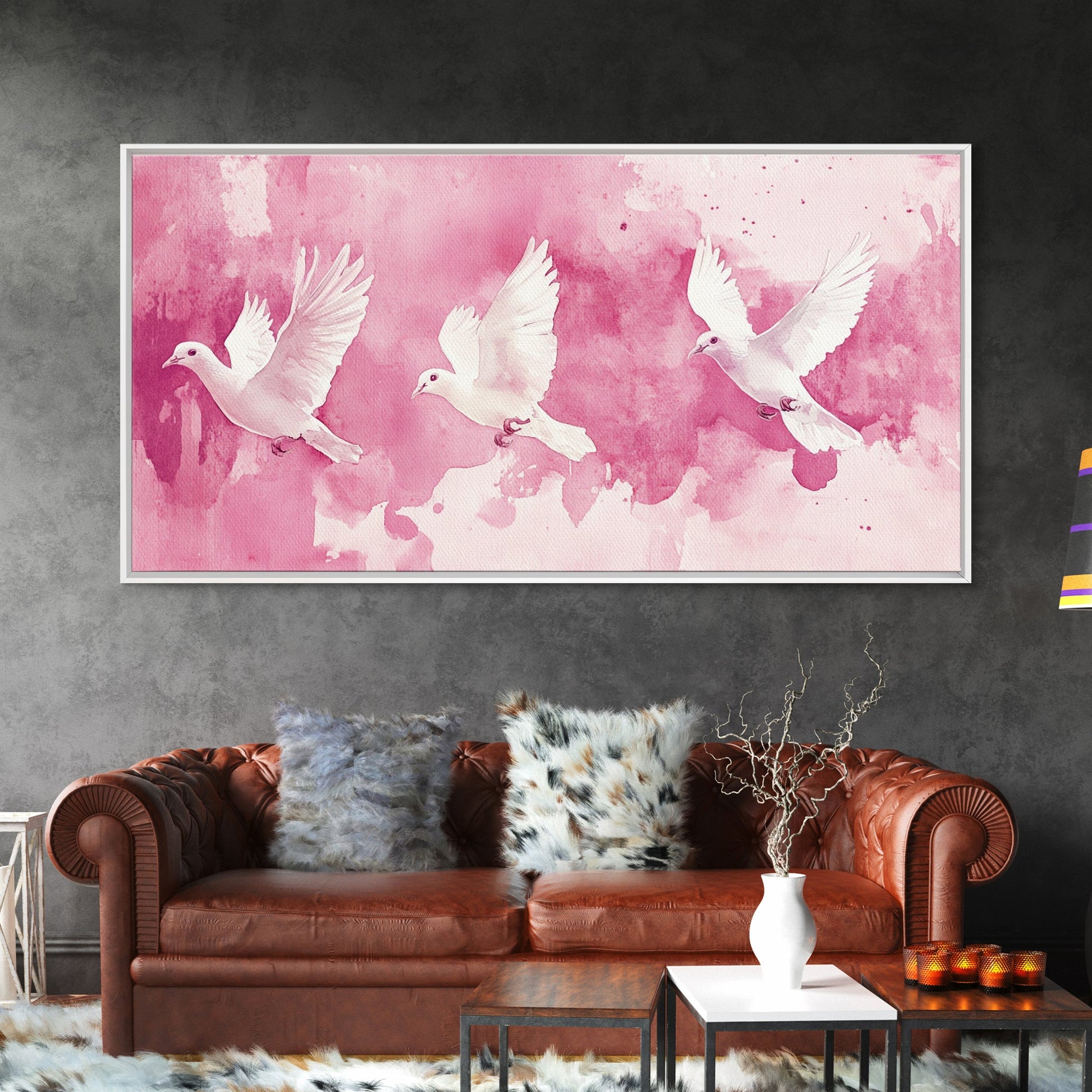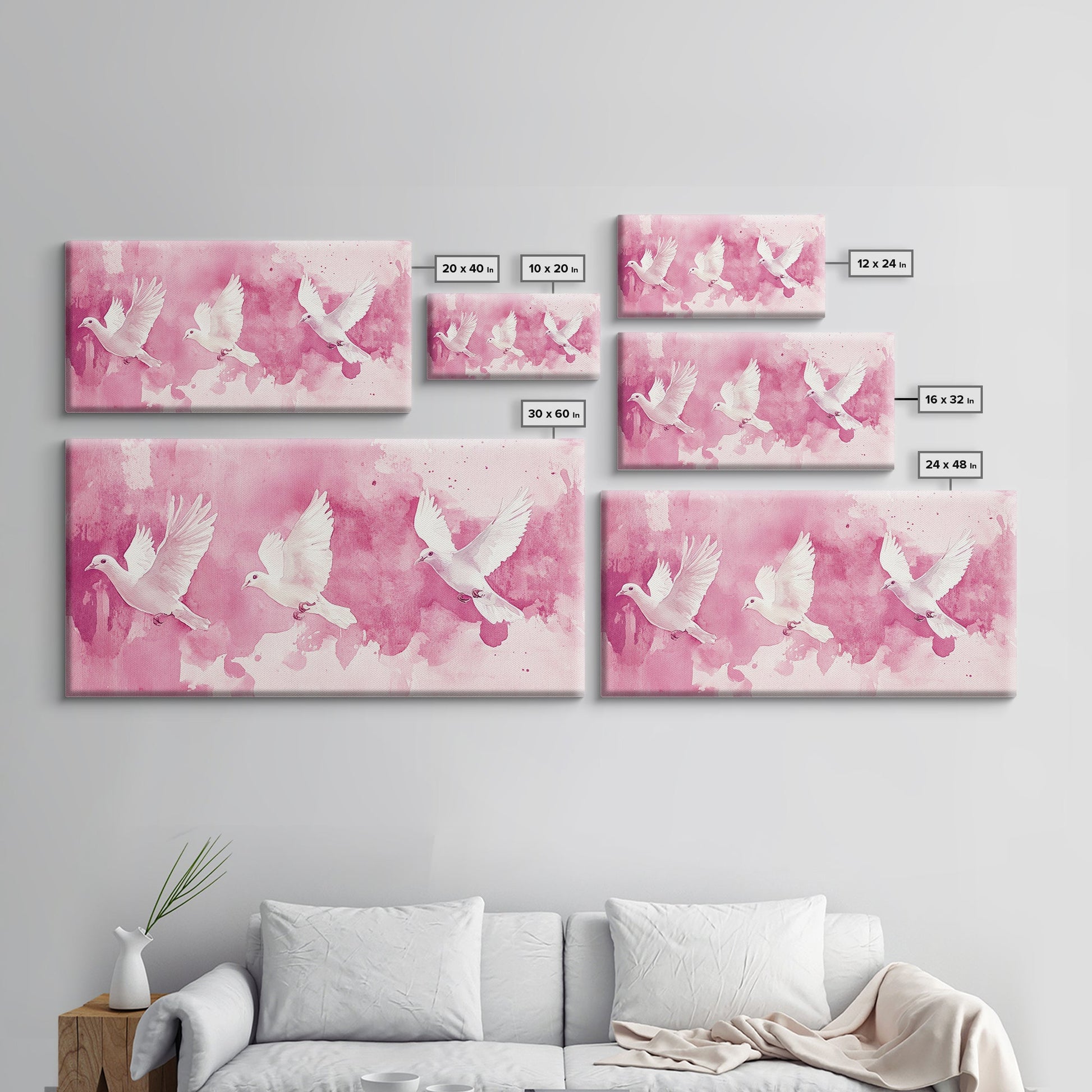 White Dove Flight Canvas Print | Angel Art Prints | Light Pink Wall Art | Minimalist Bird Art | Whimsical Living Room Decor Wall Art