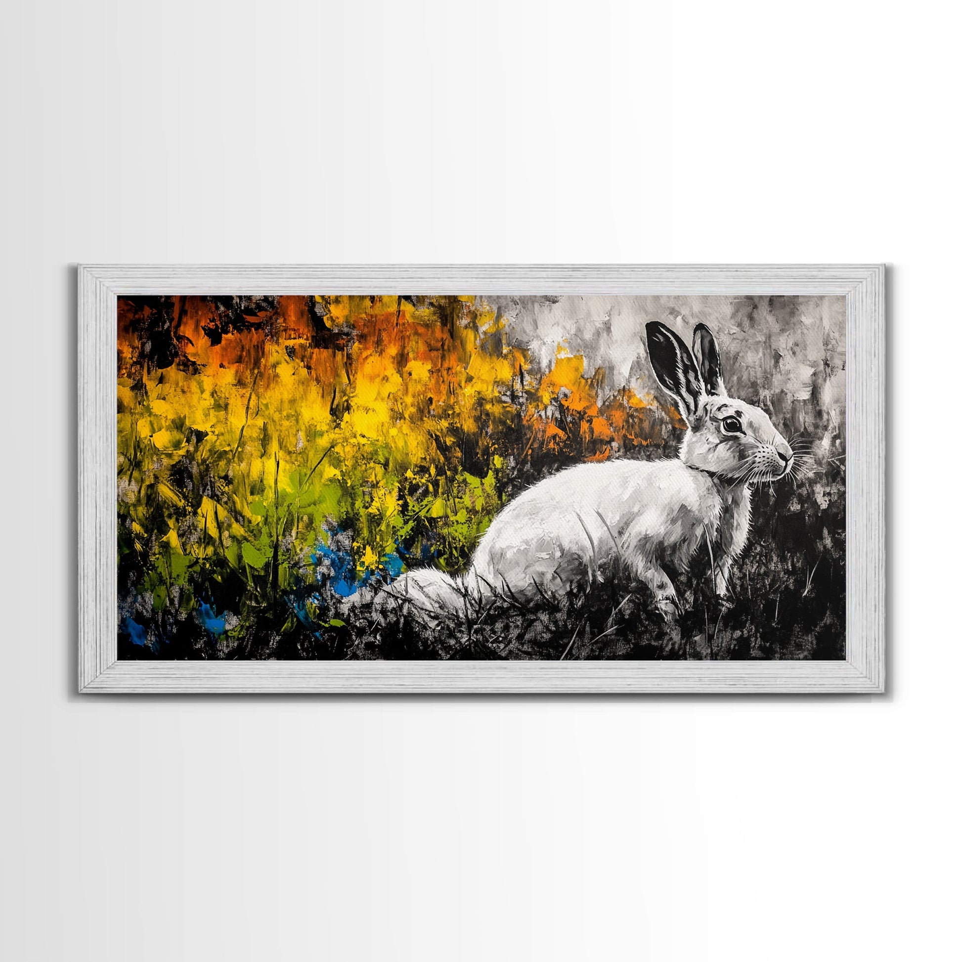 White Rabbit, whimsical art, forest at dusk painting, rustic wall art, farmhouse art, wildflower painting, Framed Canvas Print, cozy decor