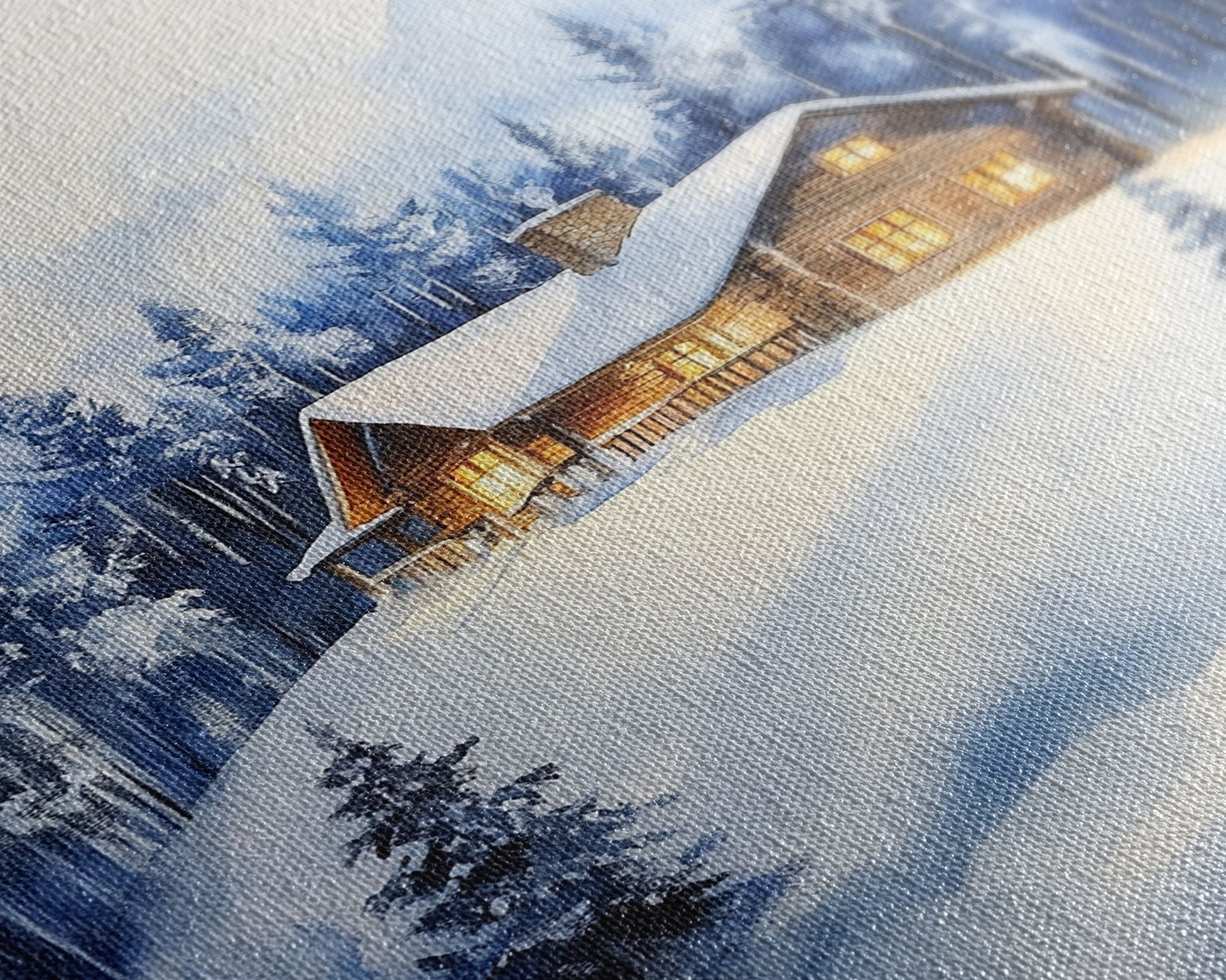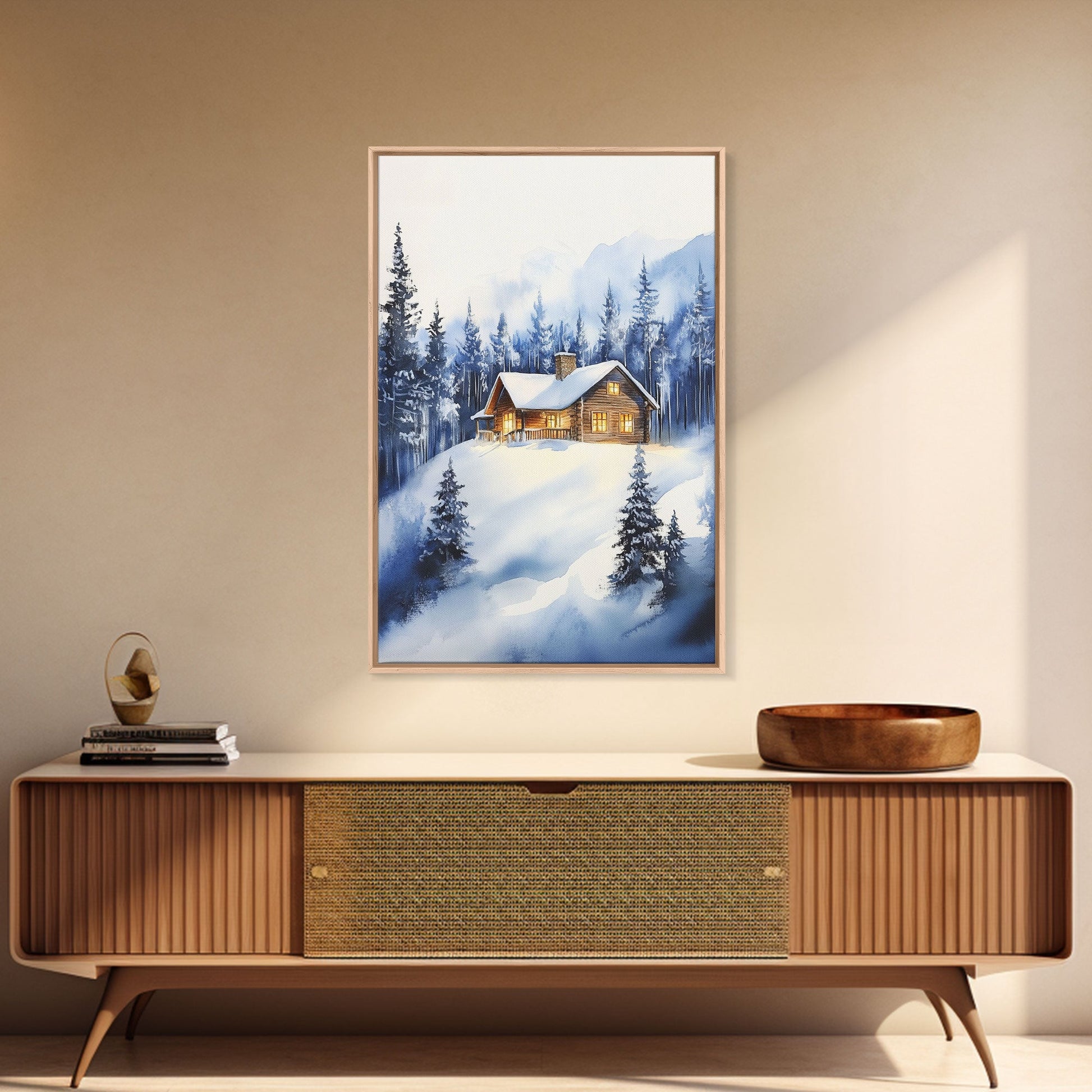Winter Wonderland Landscape Print, Cabin In The Woods Rustic / Primitive Wall Art, Colorful Christmas